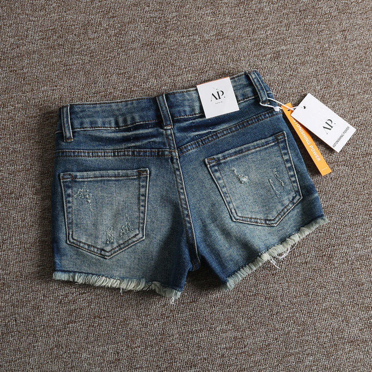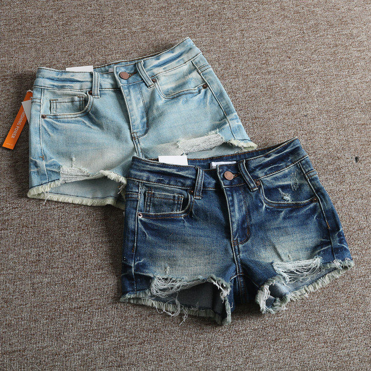 欧美街头复古水洗磨破修身提臀低腰毛边牛仔短裤女热裤