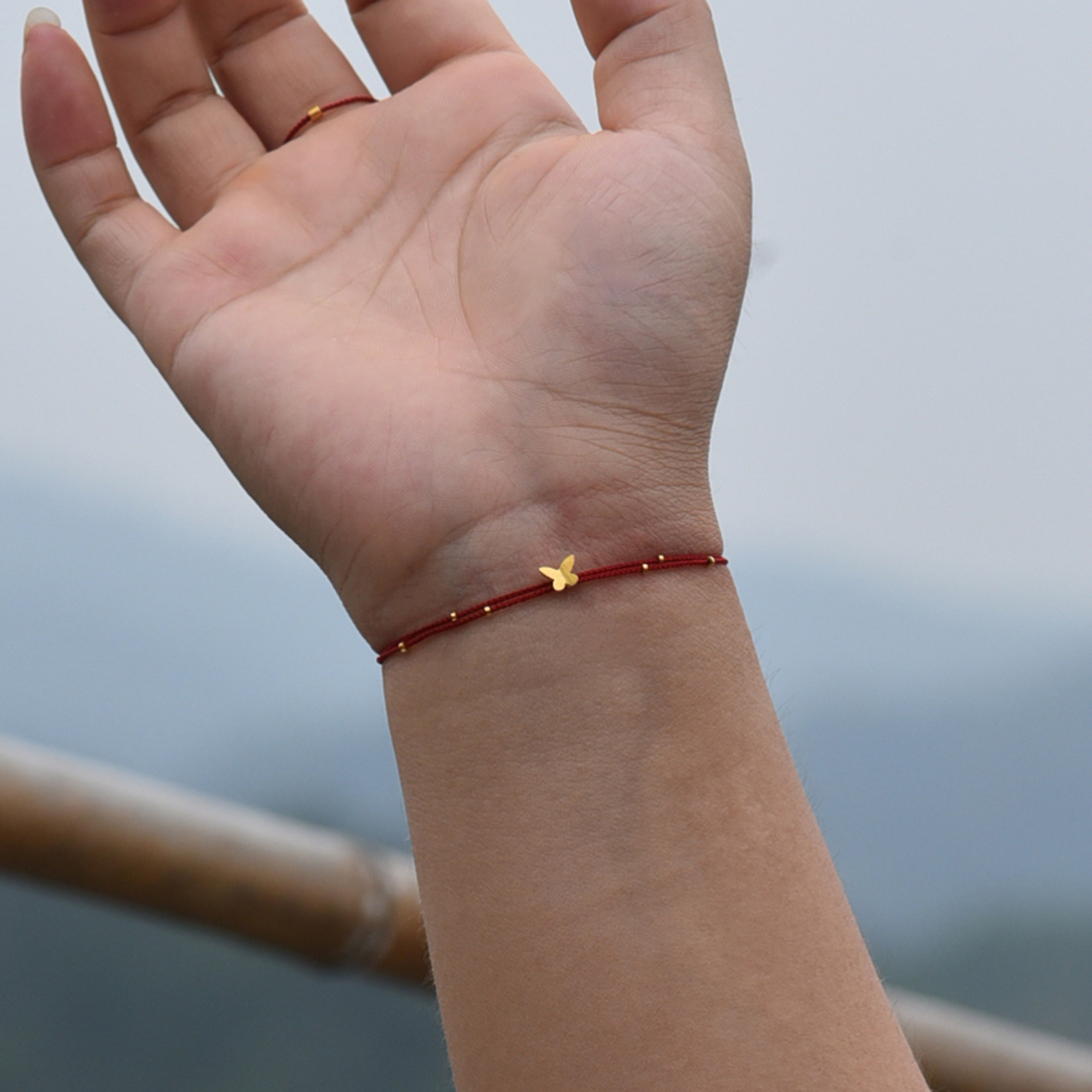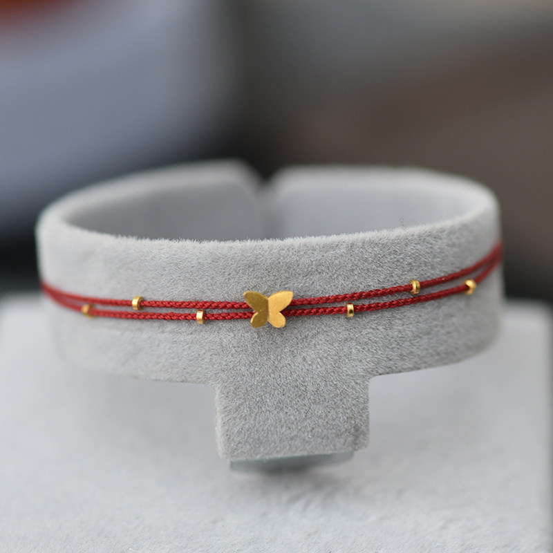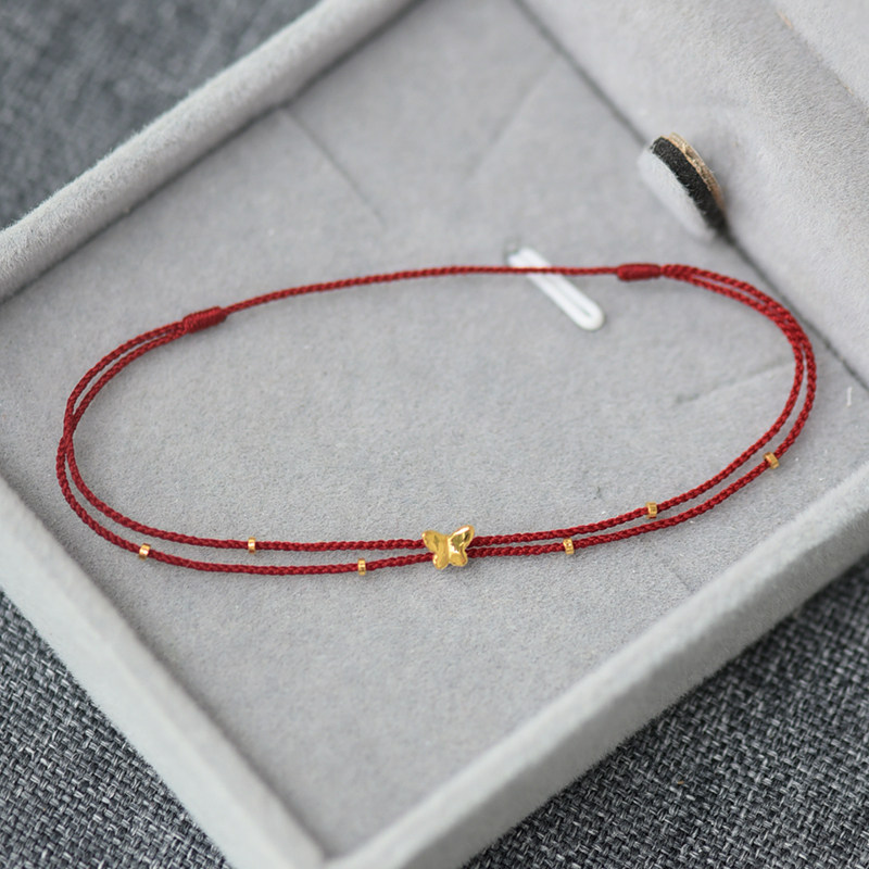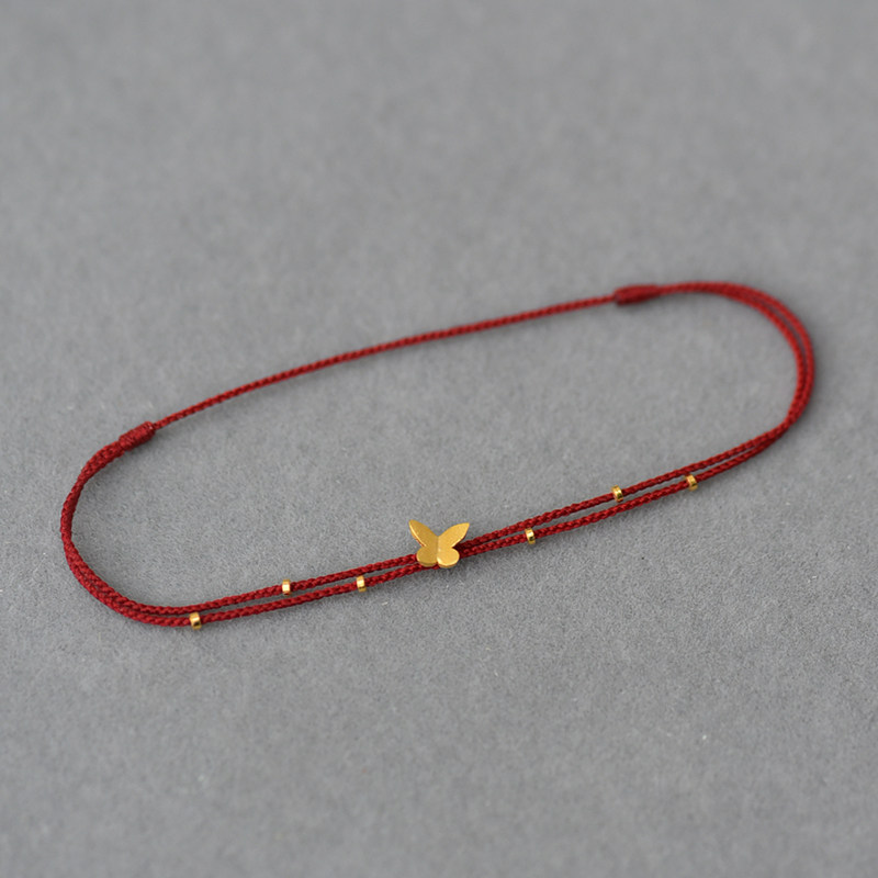 足金999小蝴蝶黄金隔珠纯手工编织双层可调红绳手链脚绳精致百搭