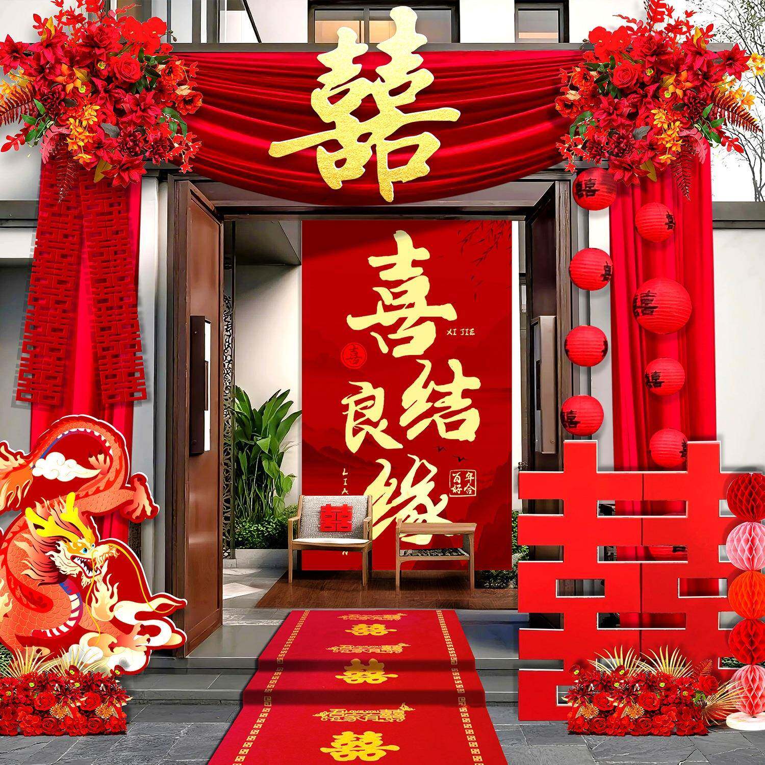 装结婚拱门庭院大门饰农村院10096281子布置别布幔订墅喜字拉花红