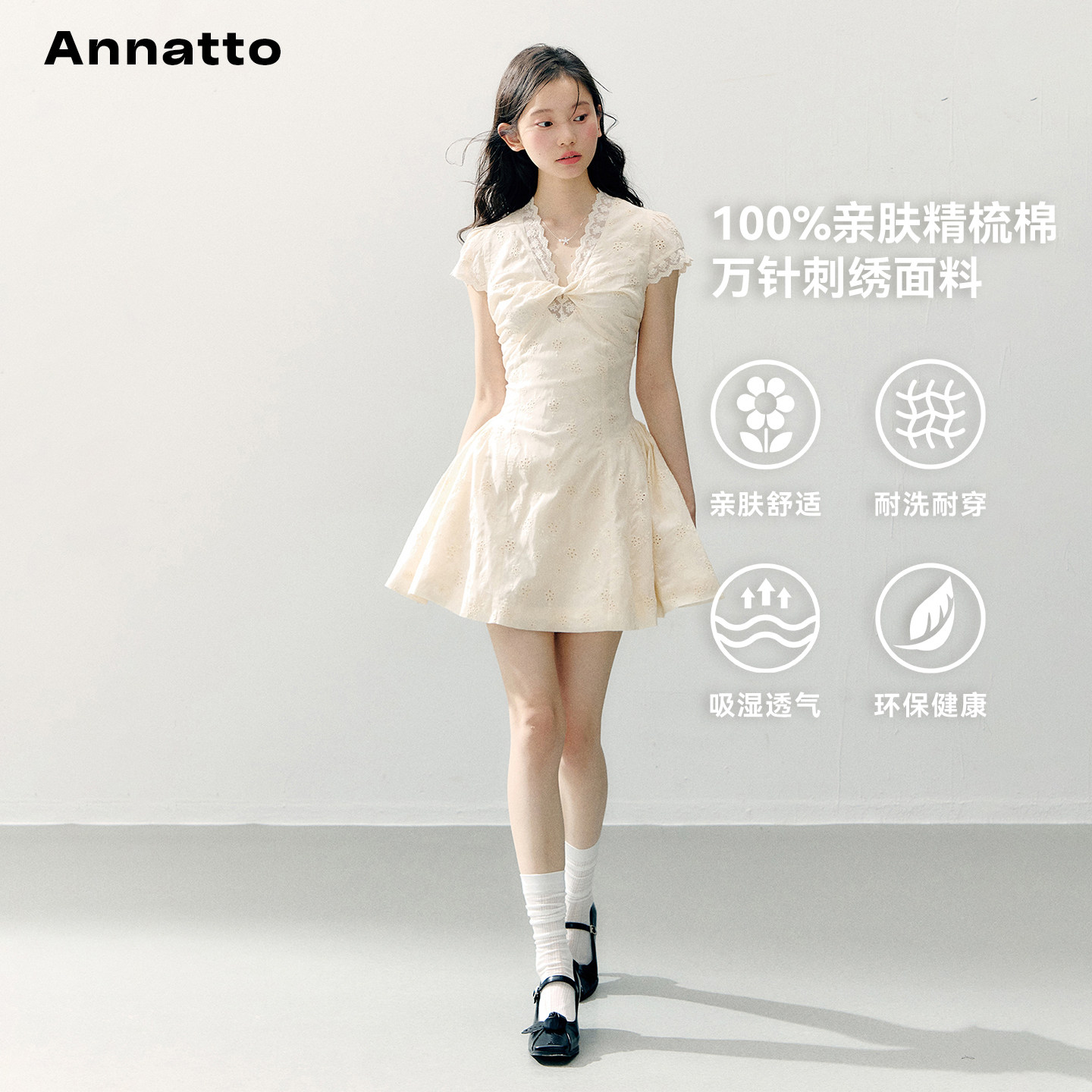 ANNATTO 茉莉苔痕 少女感米白色绣花V领蕾丝花边a字收腰连衣裙女
