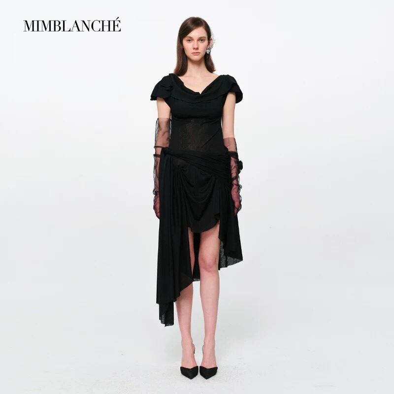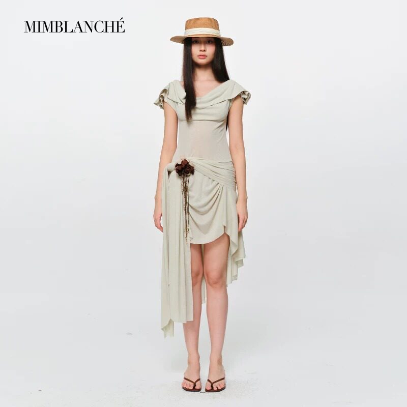 MIMBLANCHE 26春夏新款荷叶领短袖不规则飘逸褶皱中长连衣裙女