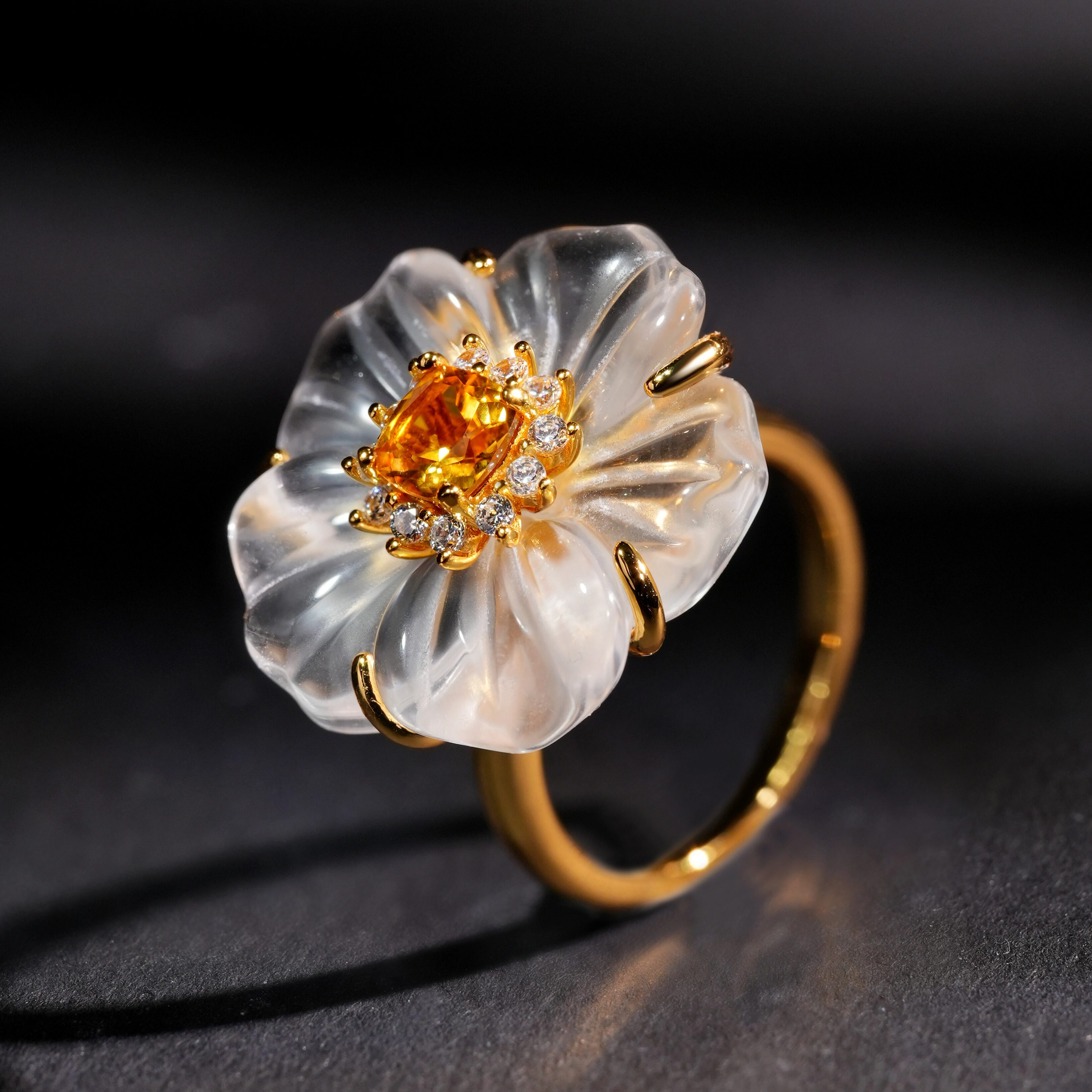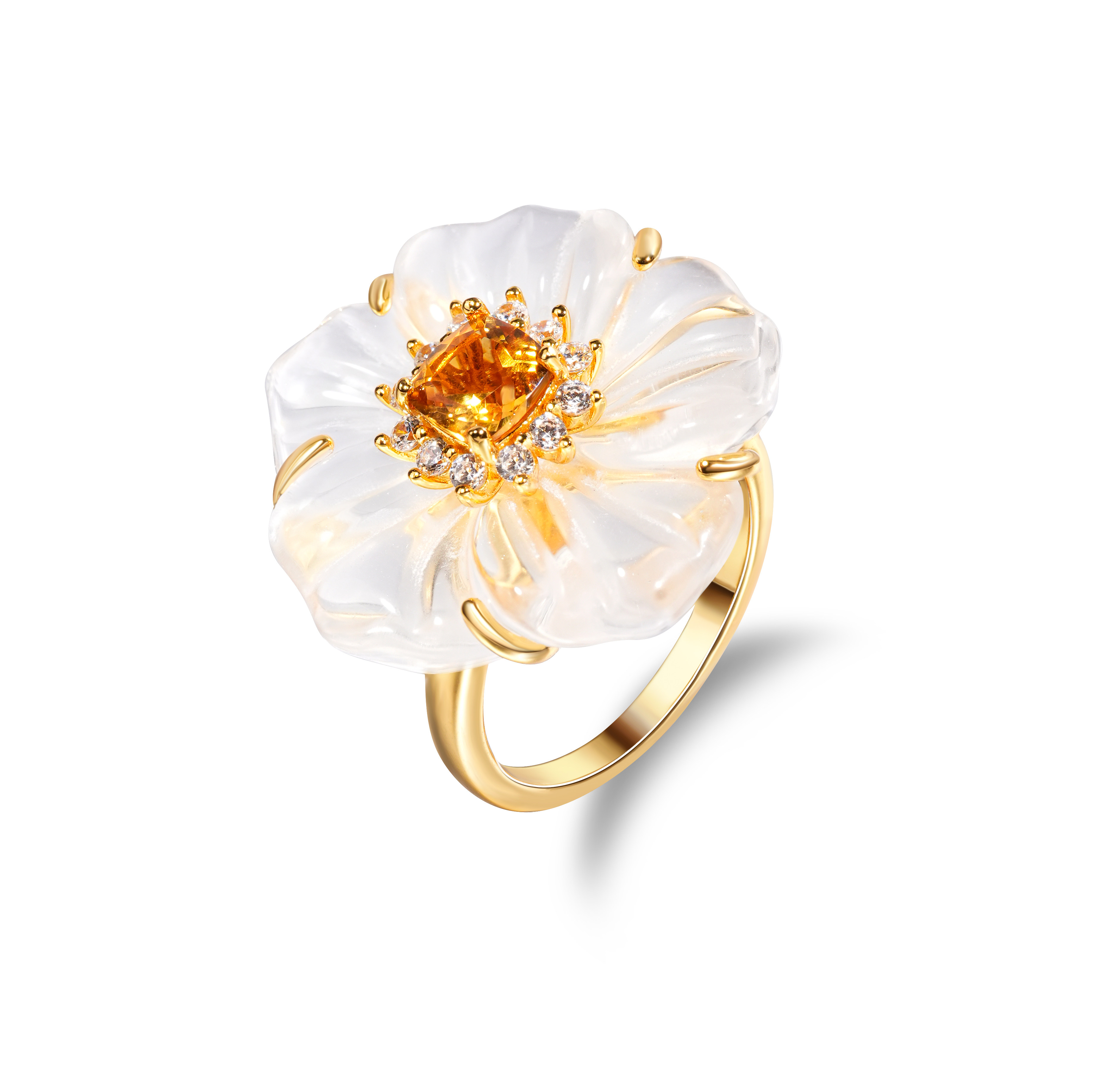 VISING珠宝天然白水晶黄水晶山茶花花朵戒指黄金色设计款