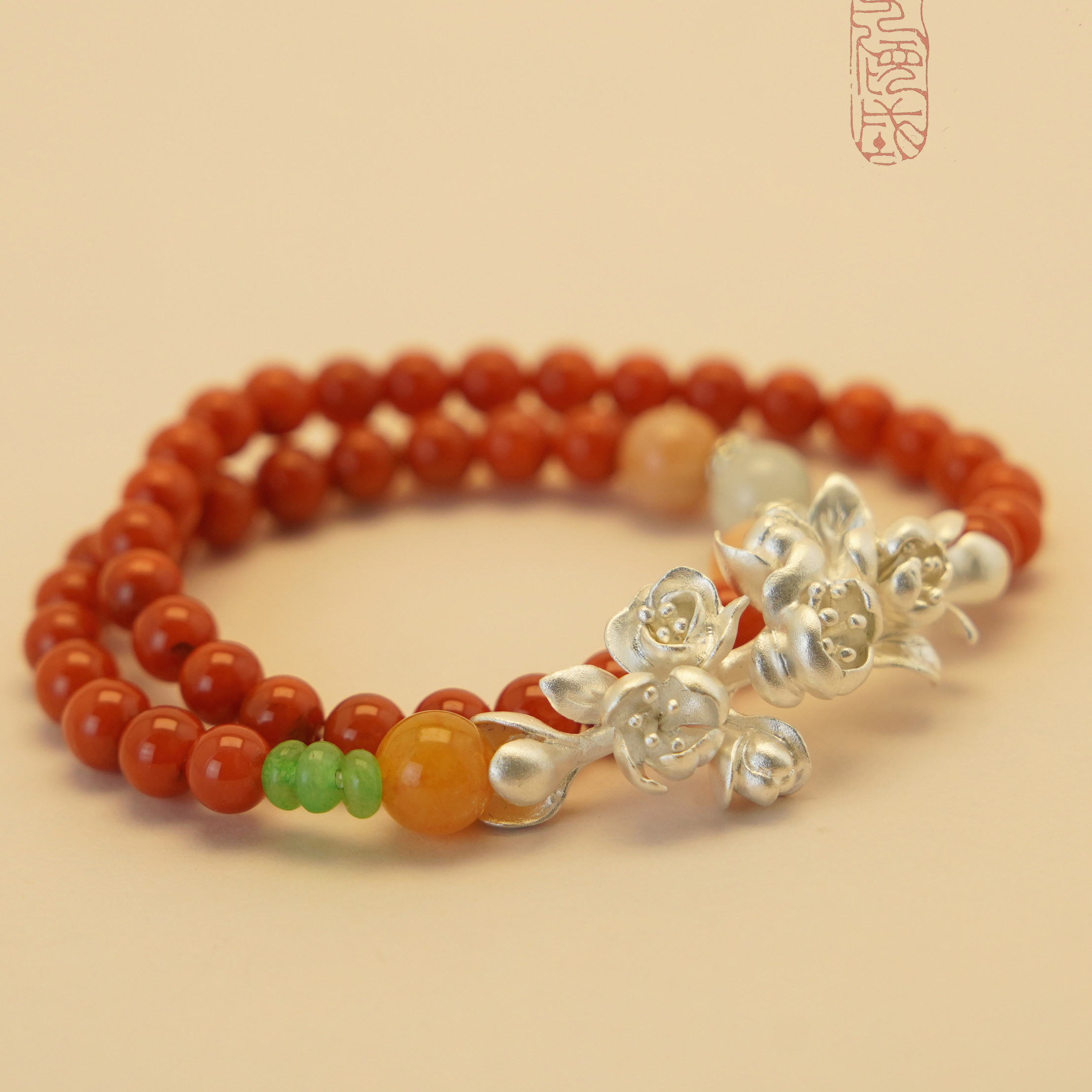 《绝艳》九九倾城原创/海棠花银手镯/天然南红串珠新中式转运珠女