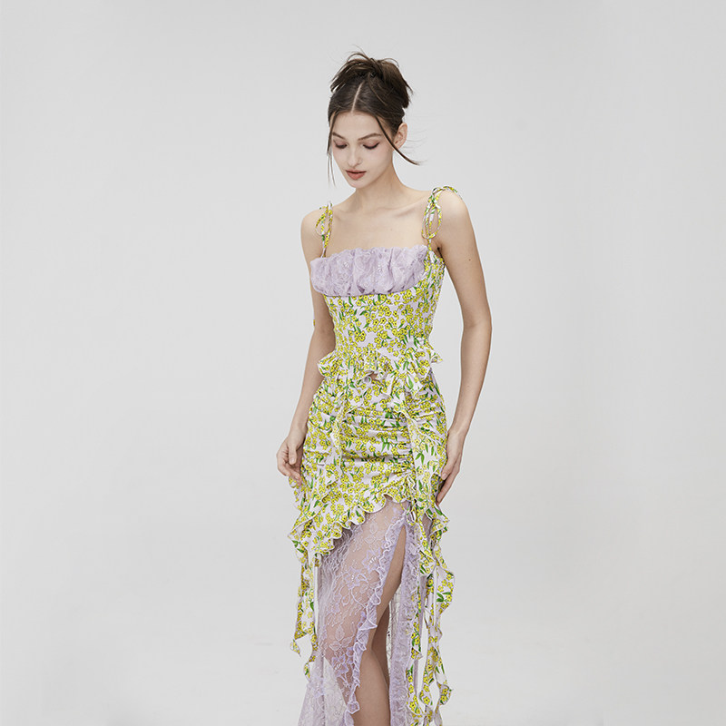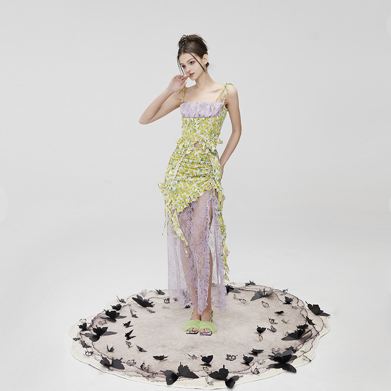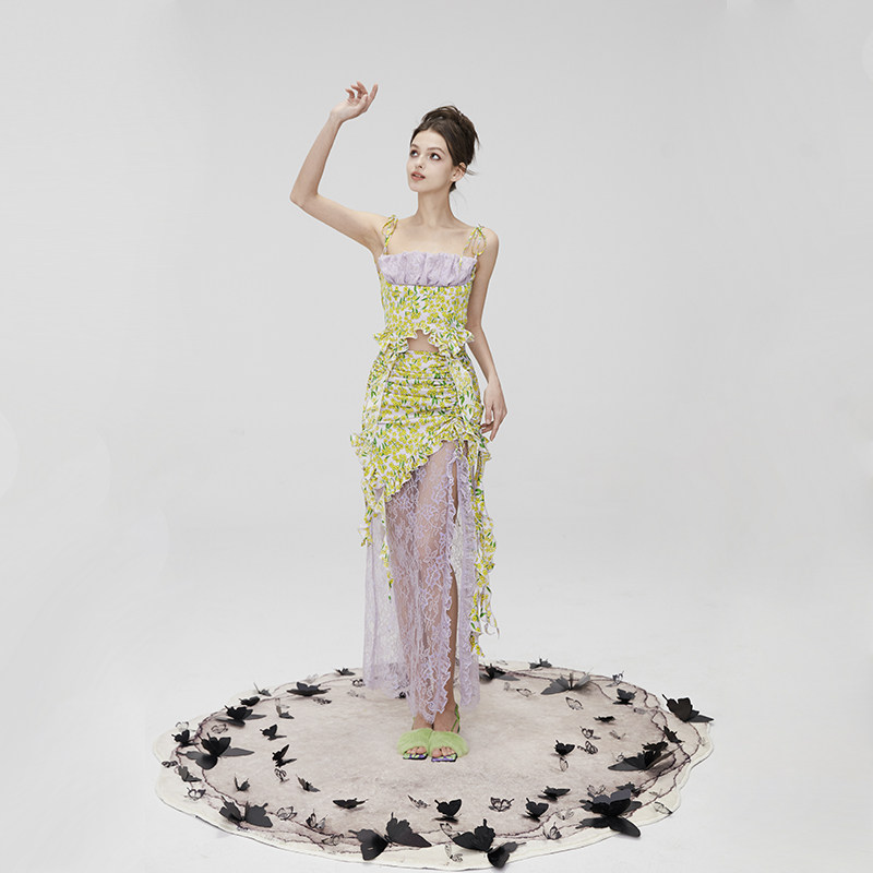 MildRate原创 仙乐飘飘碎花缎面蕾丝吊带上衣+抽绳拼接半裙套装