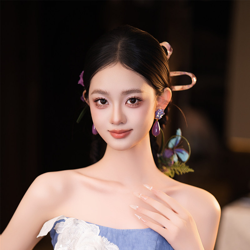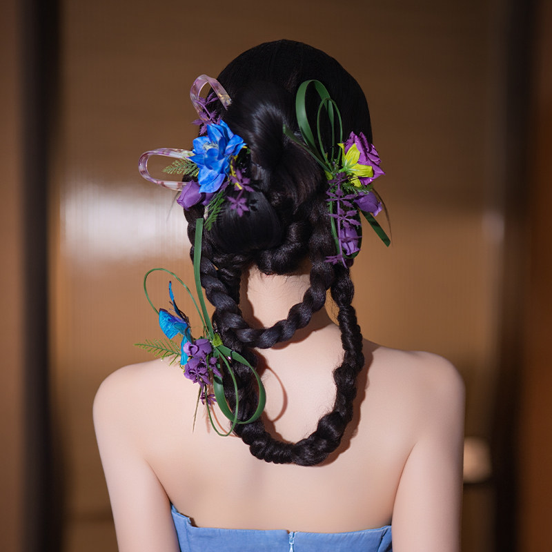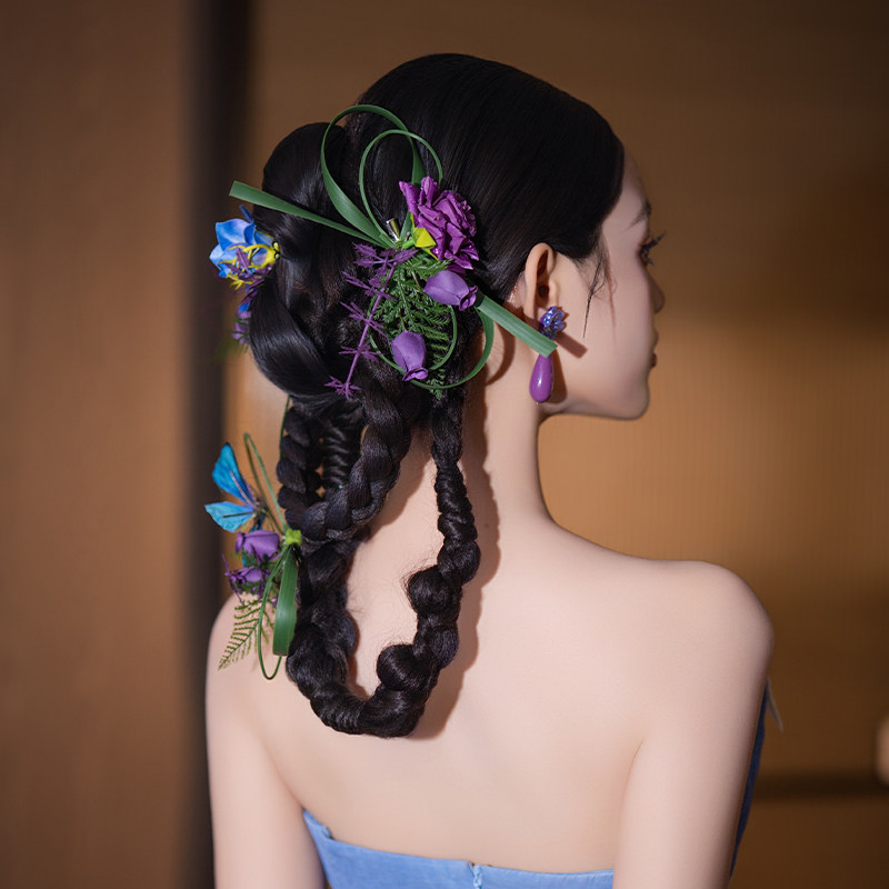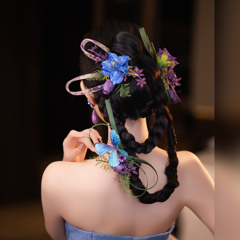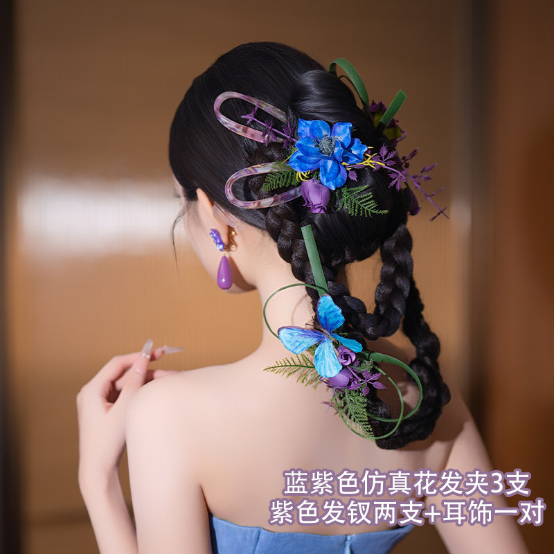 新娘新中式头饰蓝紫色小众设计感仿真花发夹气质订婚礼服晨袍配饰
