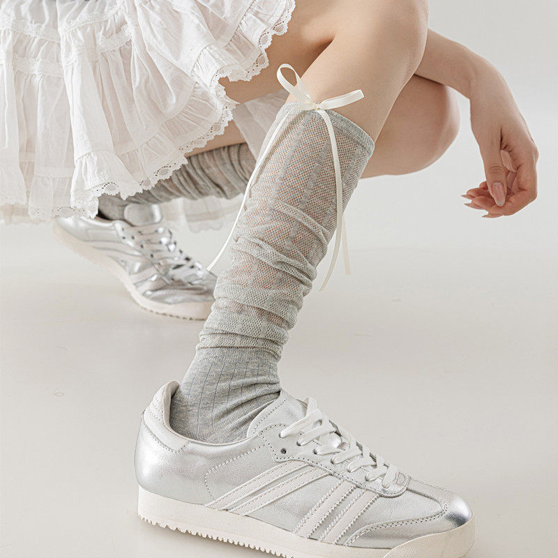 春夏天小腿袜芭蕾风镂空蝴蝶结小腿袜灰色袜子女潮网红款堆堆袜