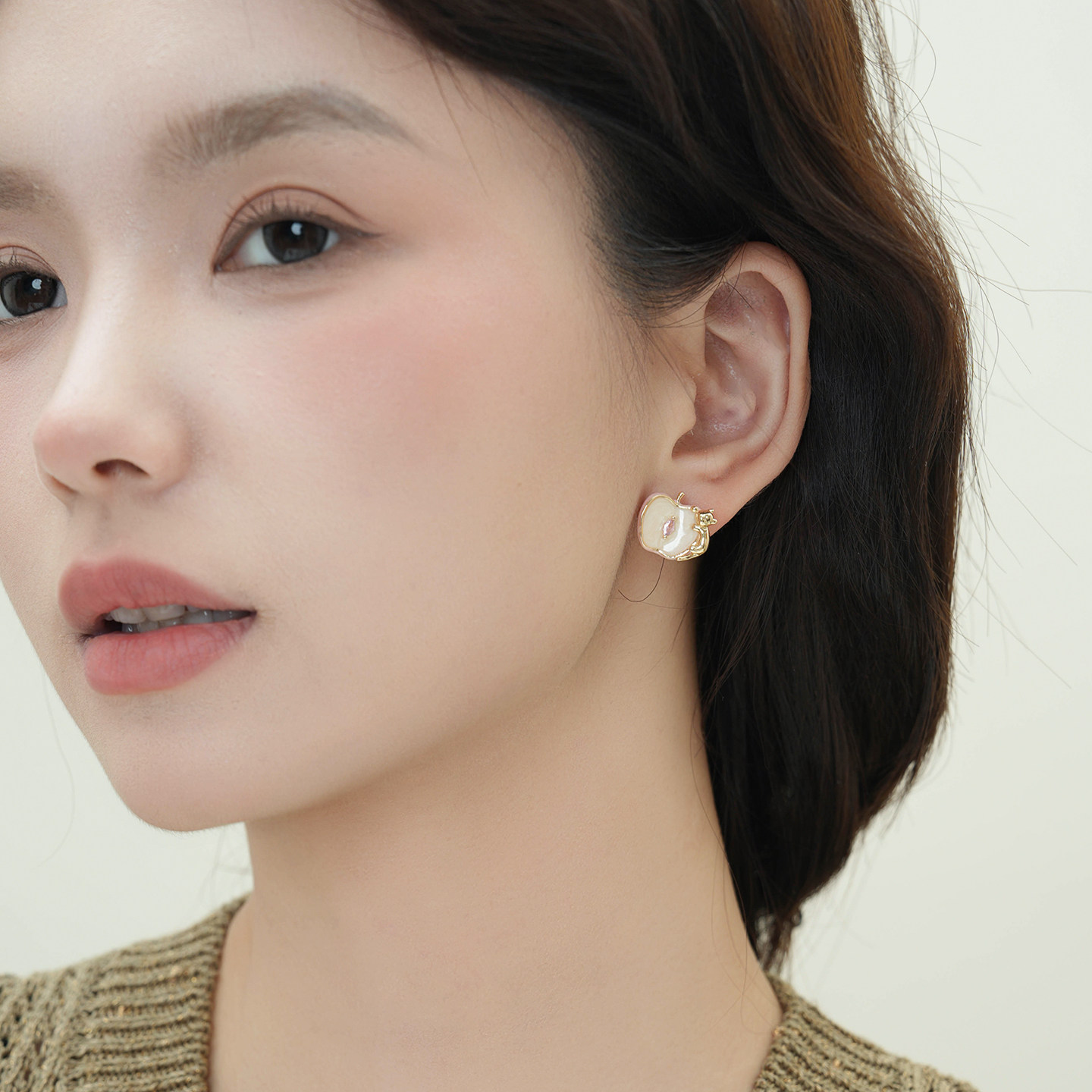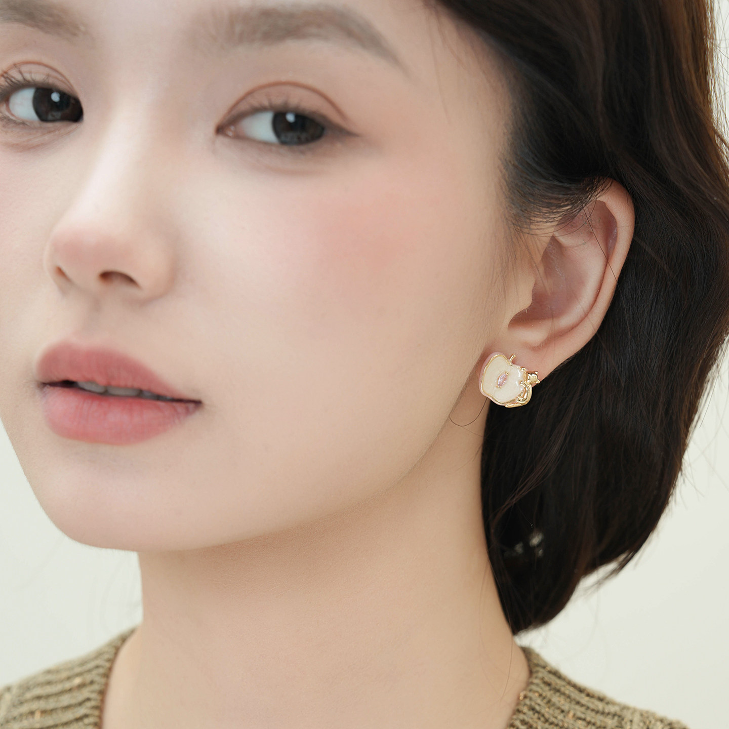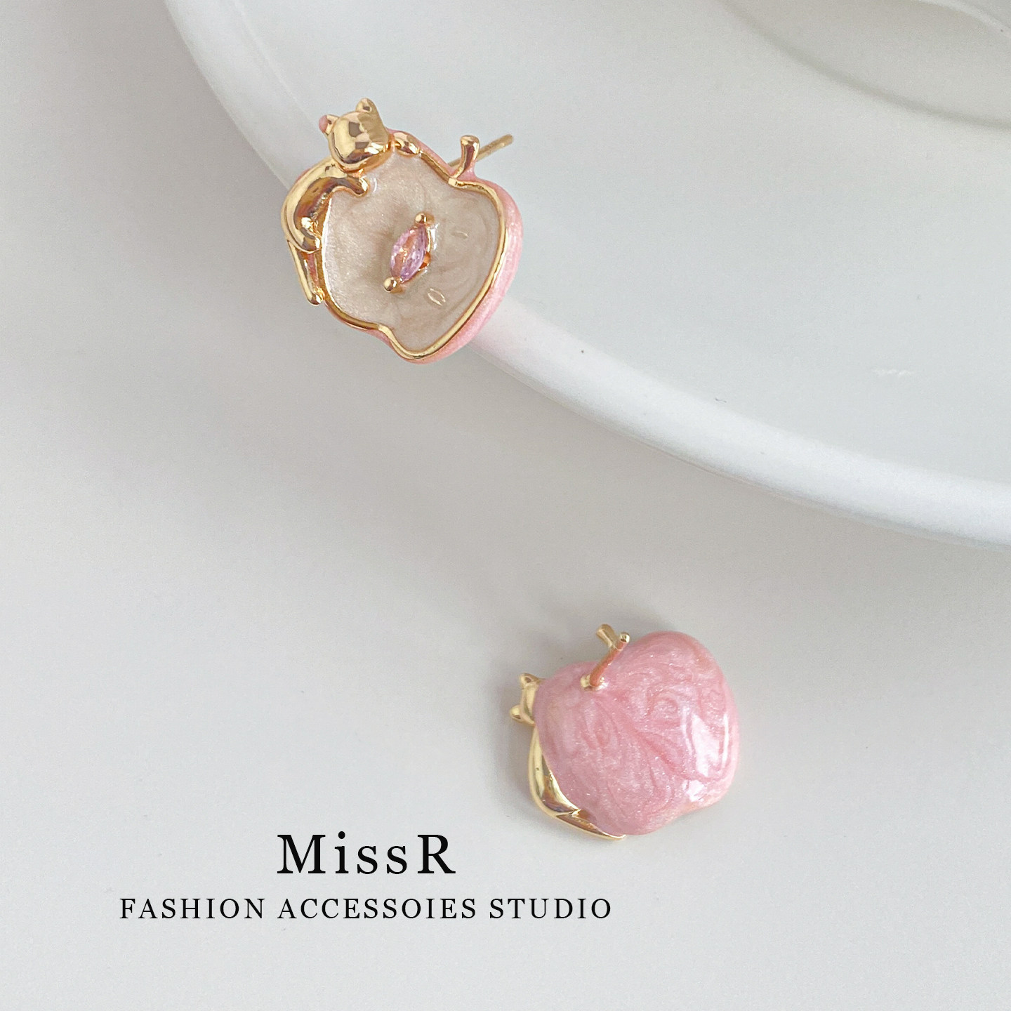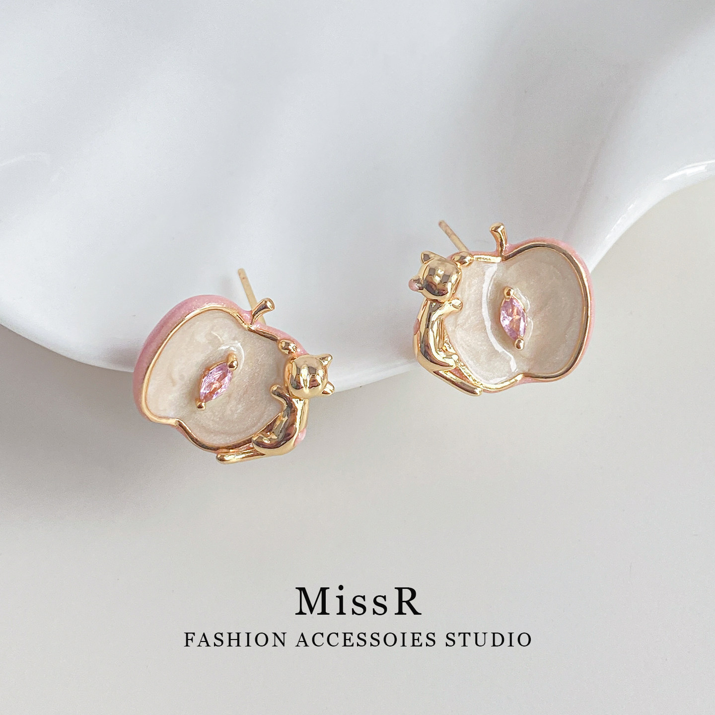 精致偷吃苹果的猫咪藕粉色珐琅耳钉女银针新款高级感耳环轻奢耳饰