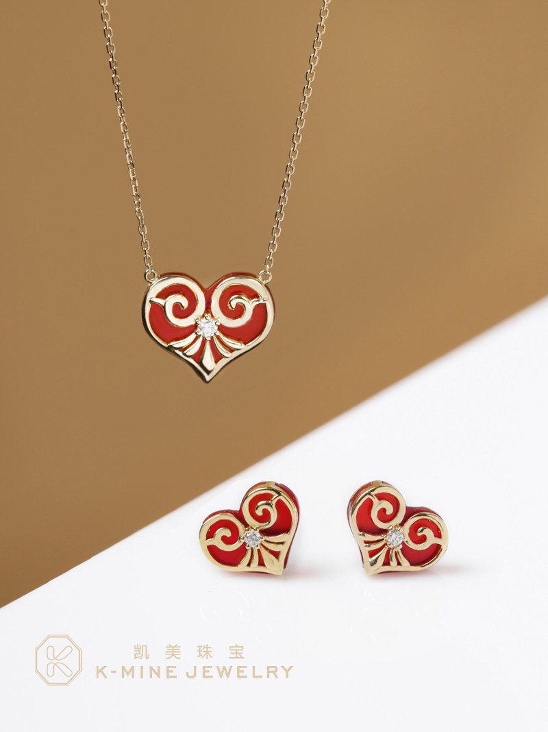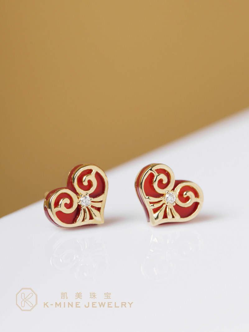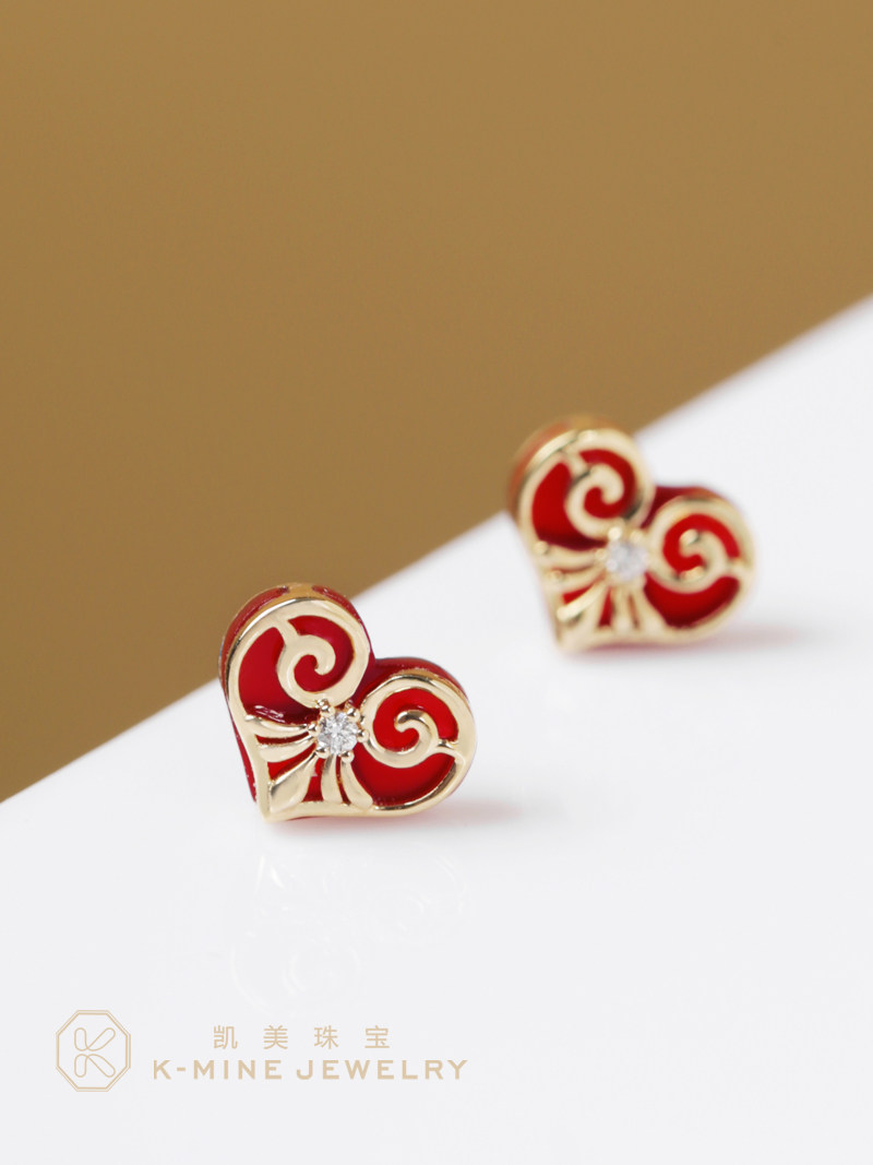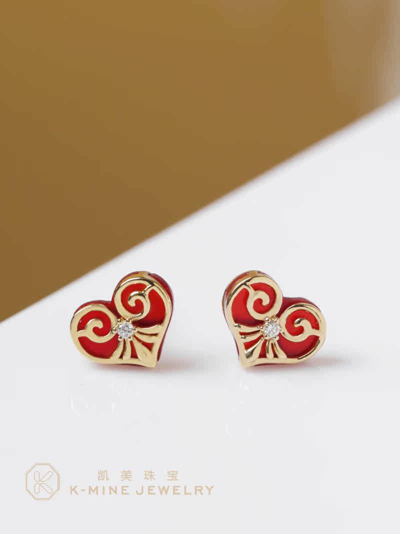 凯美珠宝18K金爱心红玉髓耳钉原创设计款镶钻石桃心形耳饰送女友