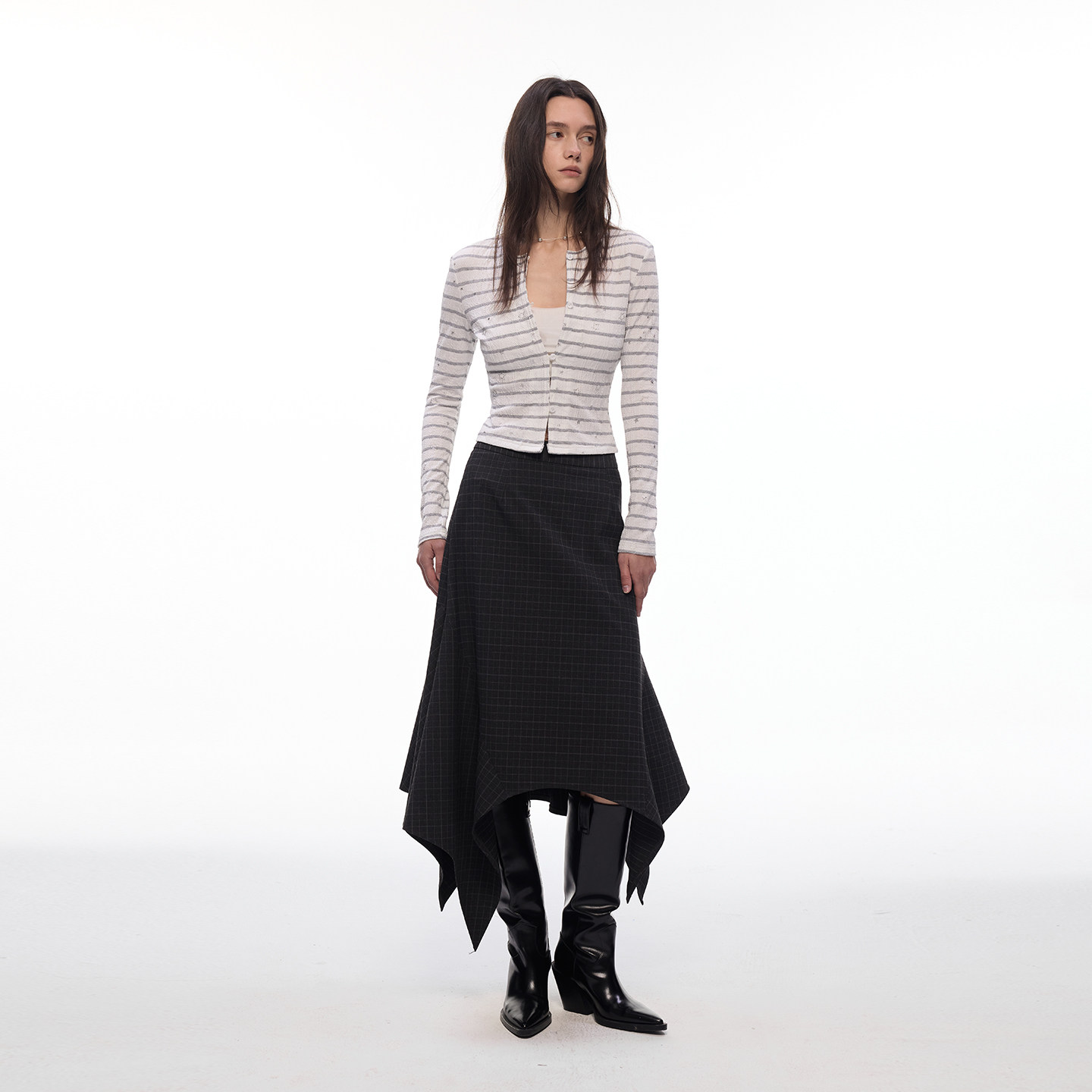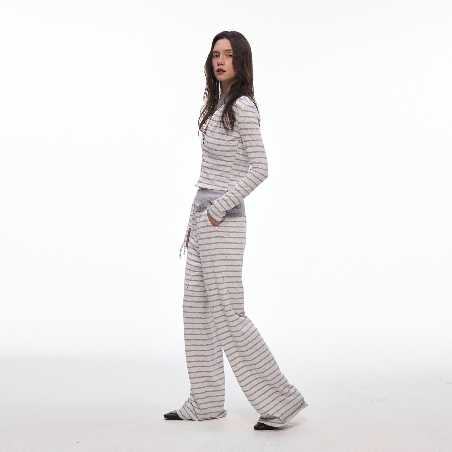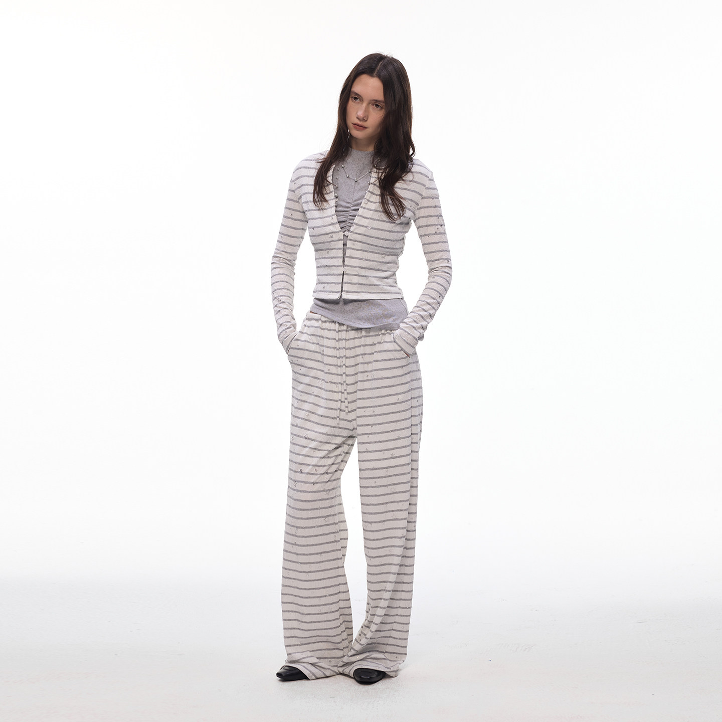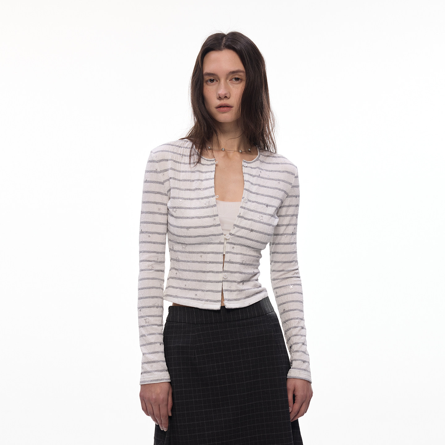 【闪闪星】BiLLconch灰白条纹星星短款上衣露脐辣妹风针织开衫女