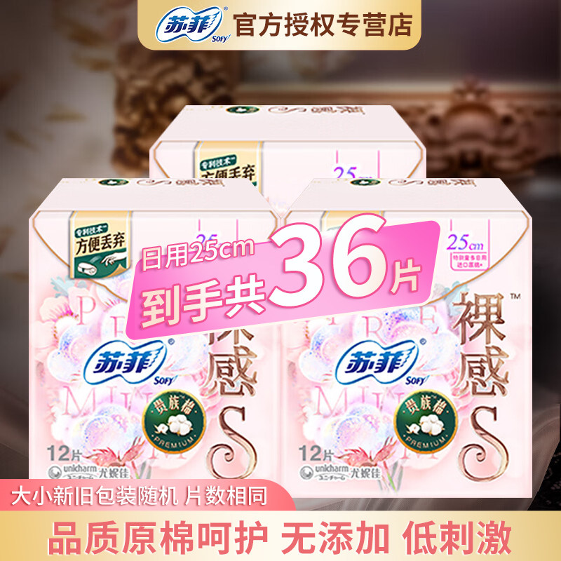 苏菲裸感S卫生巾贵族棉量多日用250mm36片姨妈巾经期防侧漏正品