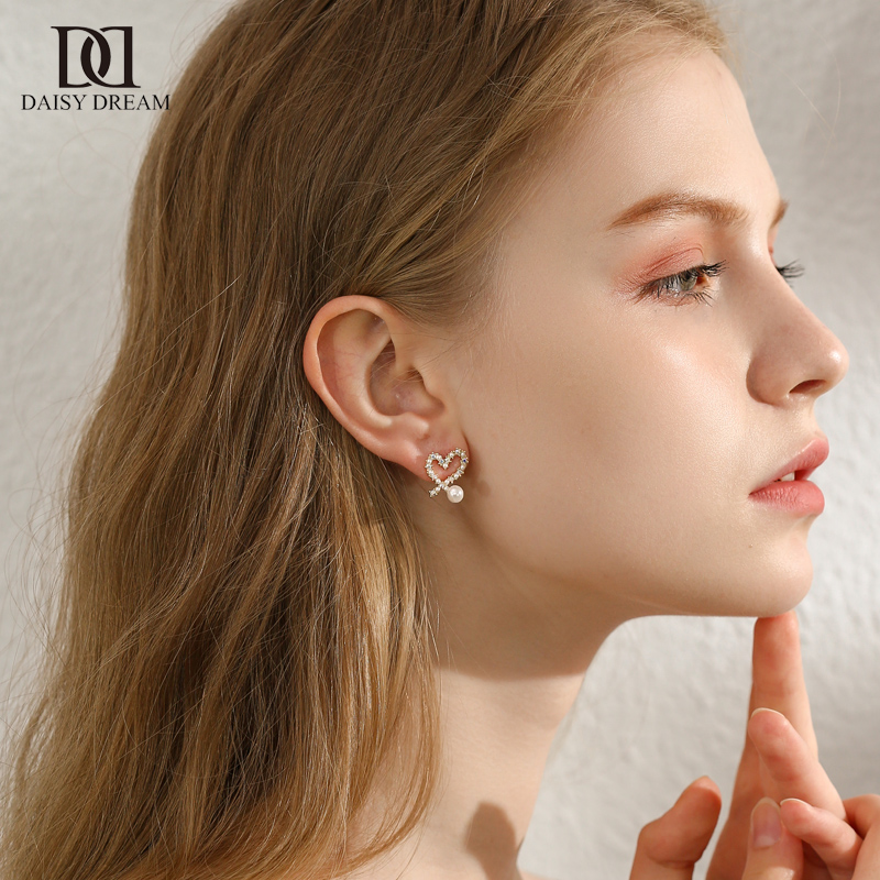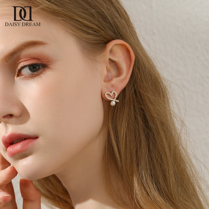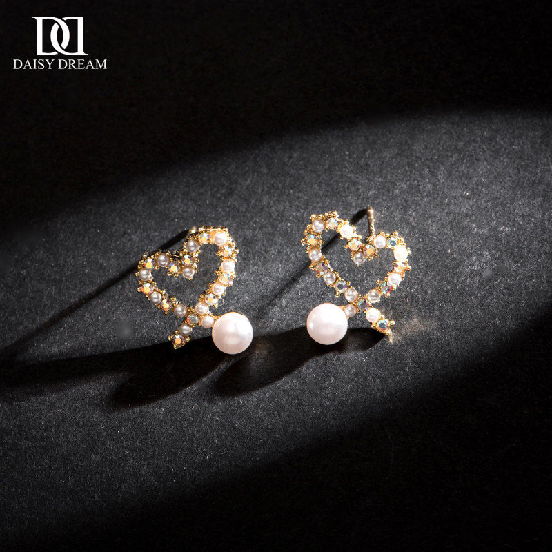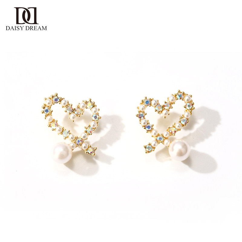 韩国爱心珍珠耳环女气质精致镶钻桃心耳钉个性镂空心形网红耳饰品