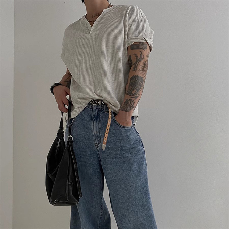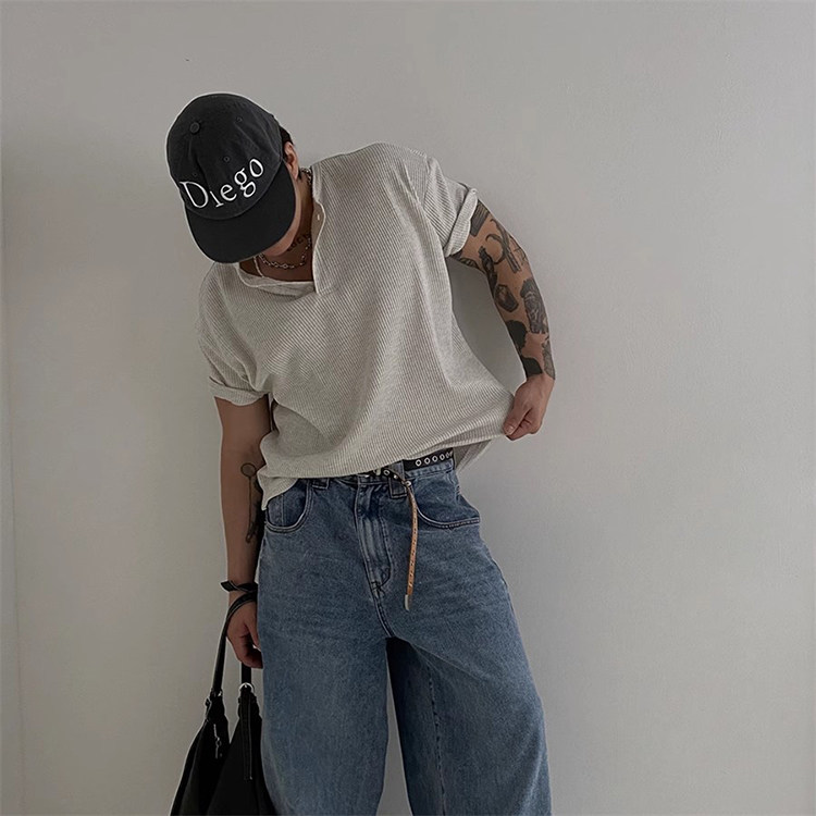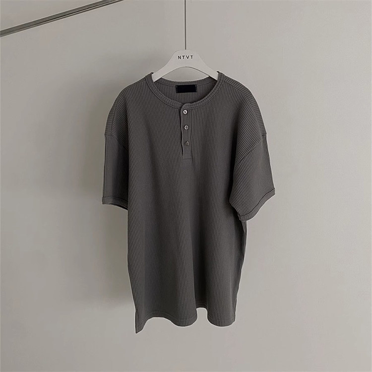 韩国东大门代购尚亨利领华夫格轻薄侧开衩宽松休闲打底短袖T恤男