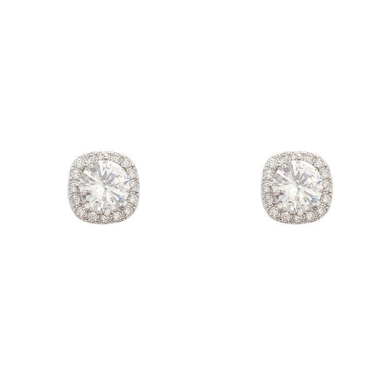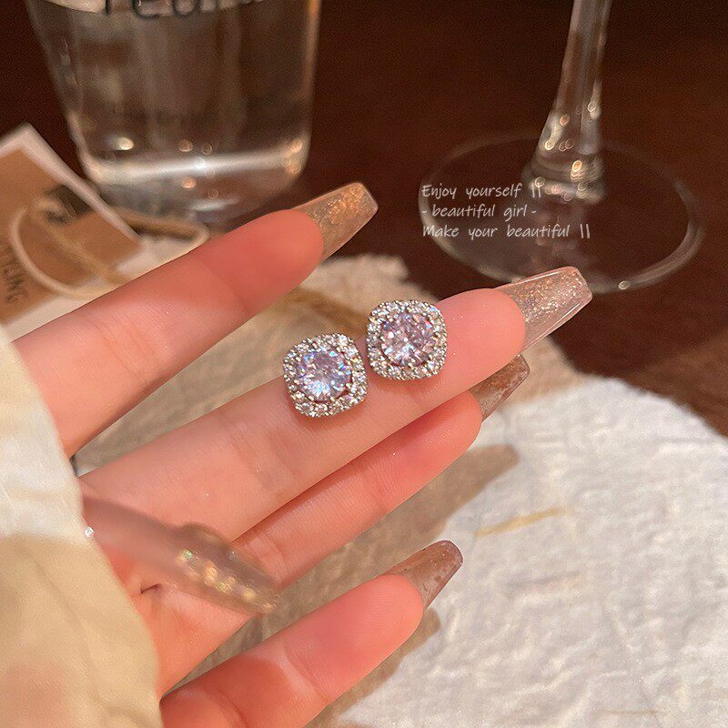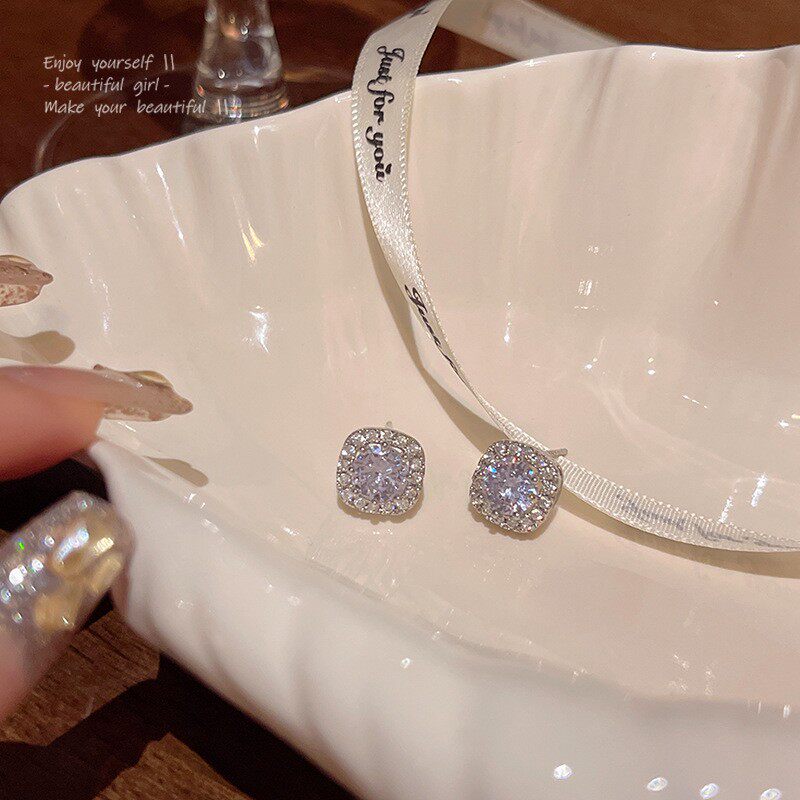 S925银针轻奢小众精致锆石耳钉女百搭气质高级感方锆耳环耳饰批发