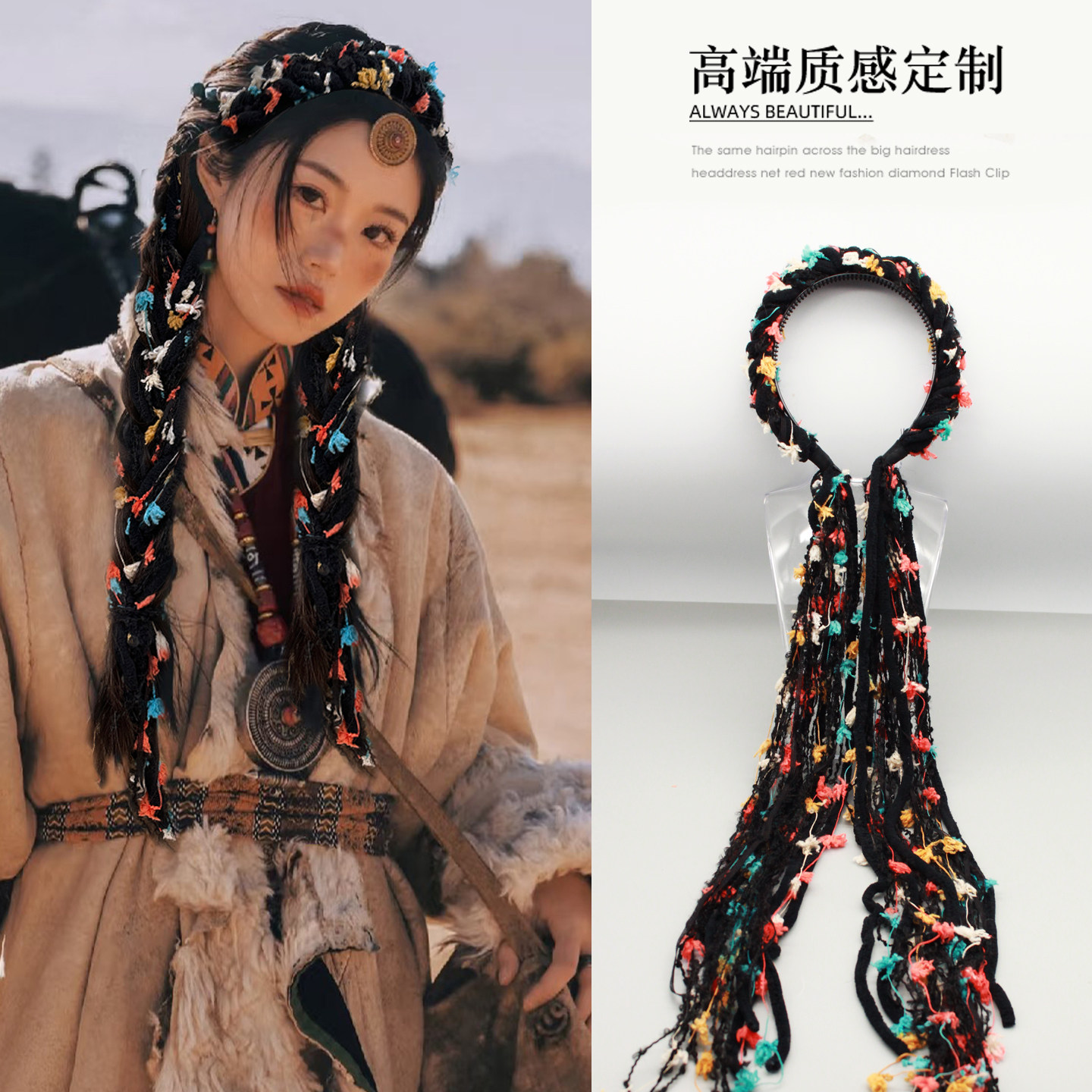 复古毛绒美拉德彩色长流苏飘带发箍藏族麻花辫头箍波西米亚发饰女