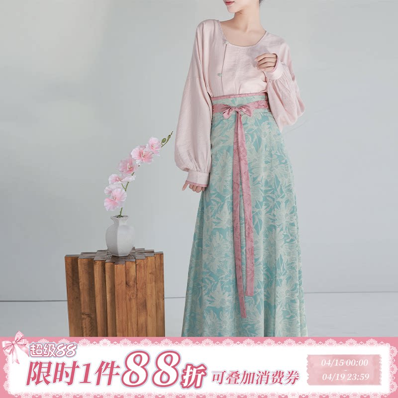 拟梦青釉染 原创唐制改良圆领衫破裙日常通勤汉服粉蓝提花纯色
