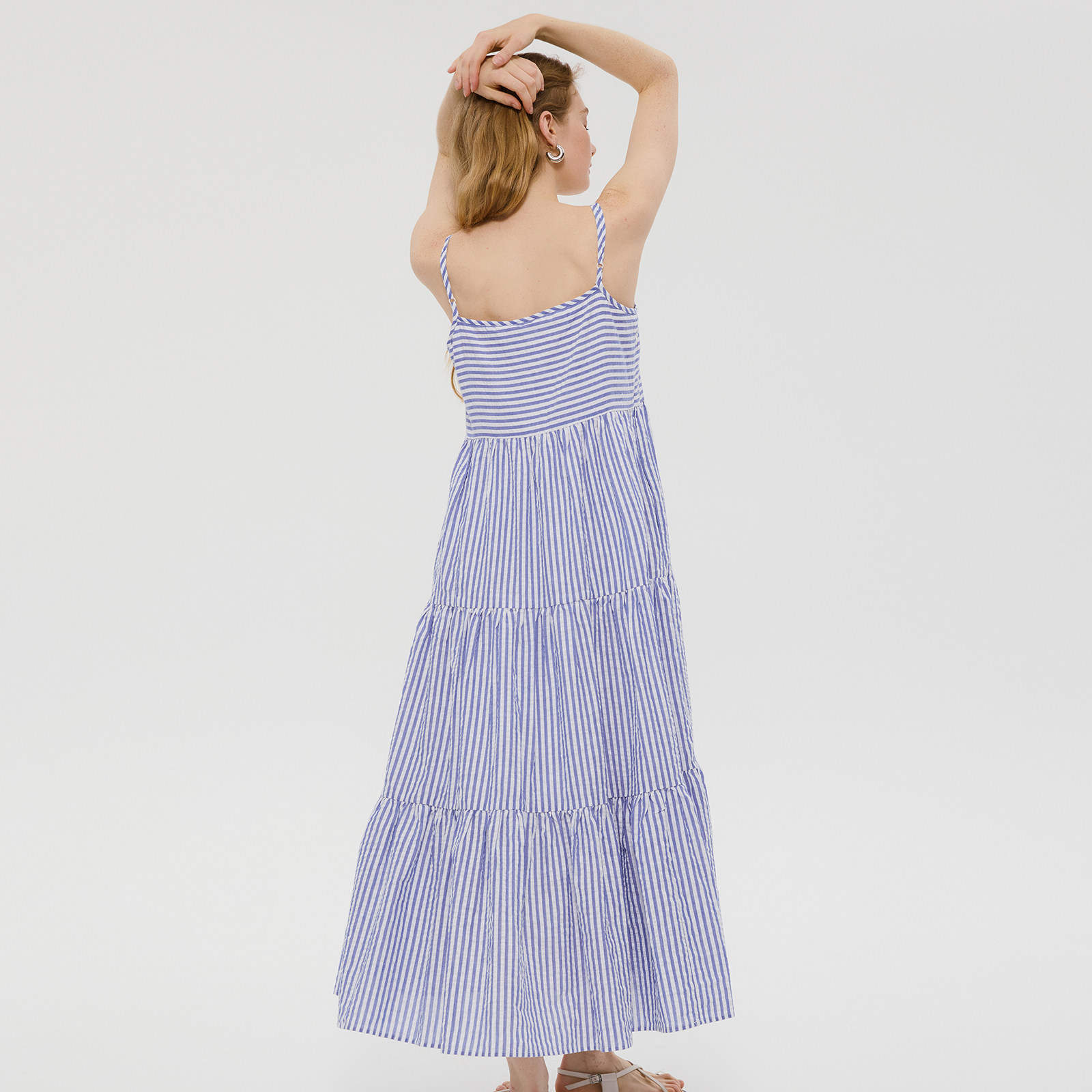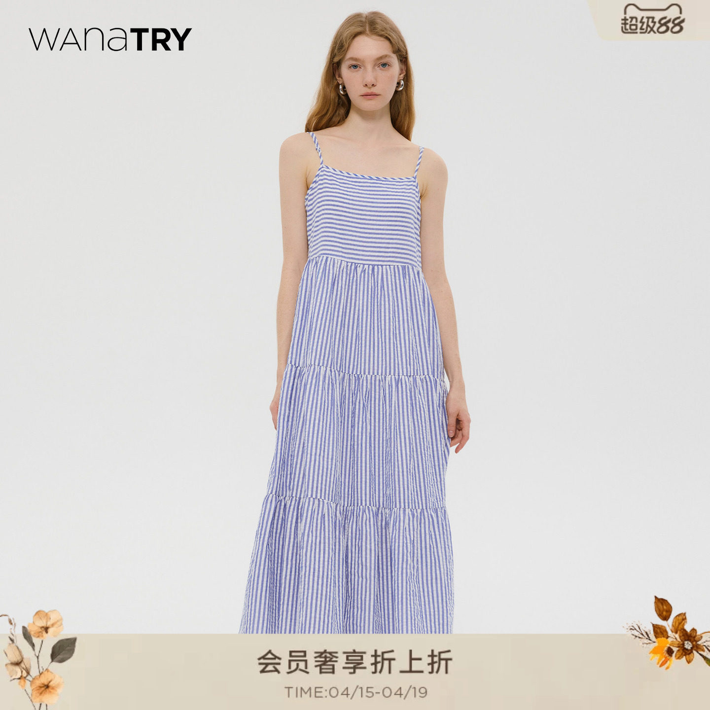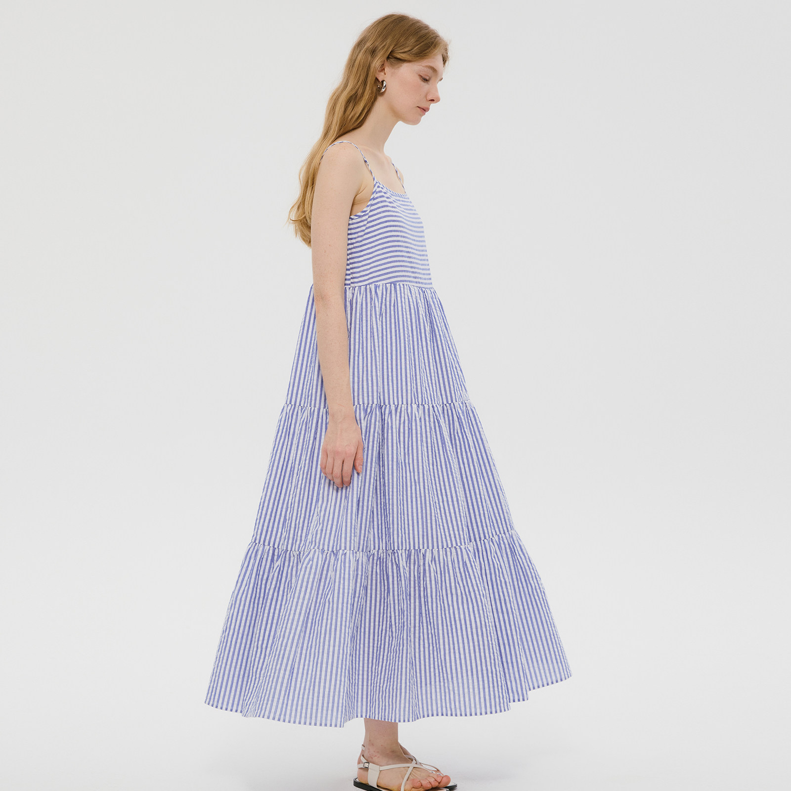 wana try 100%棉蓝色法式宽松慵懒感条纹夏季新款修身吊带连衣裙