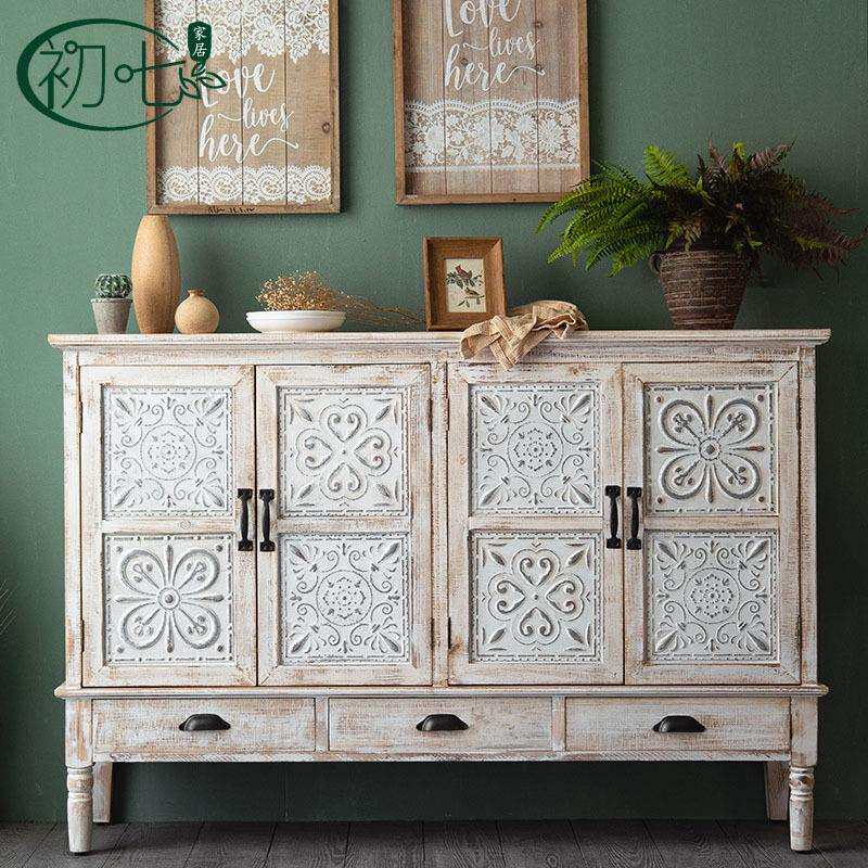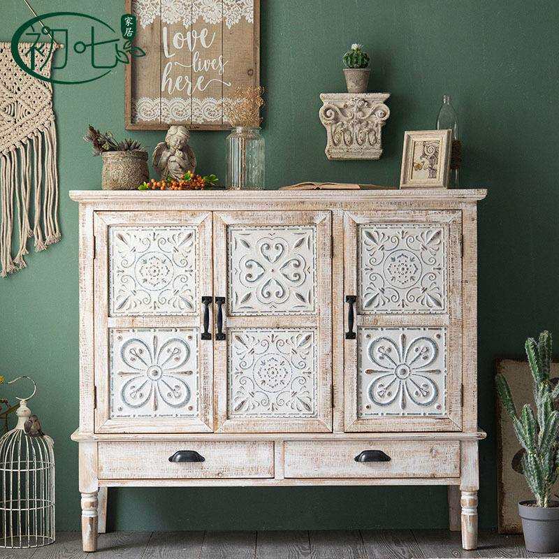 A36实木玄关柜美古客厅储复物柜做旧雕花民宿装饰式loft业风工收