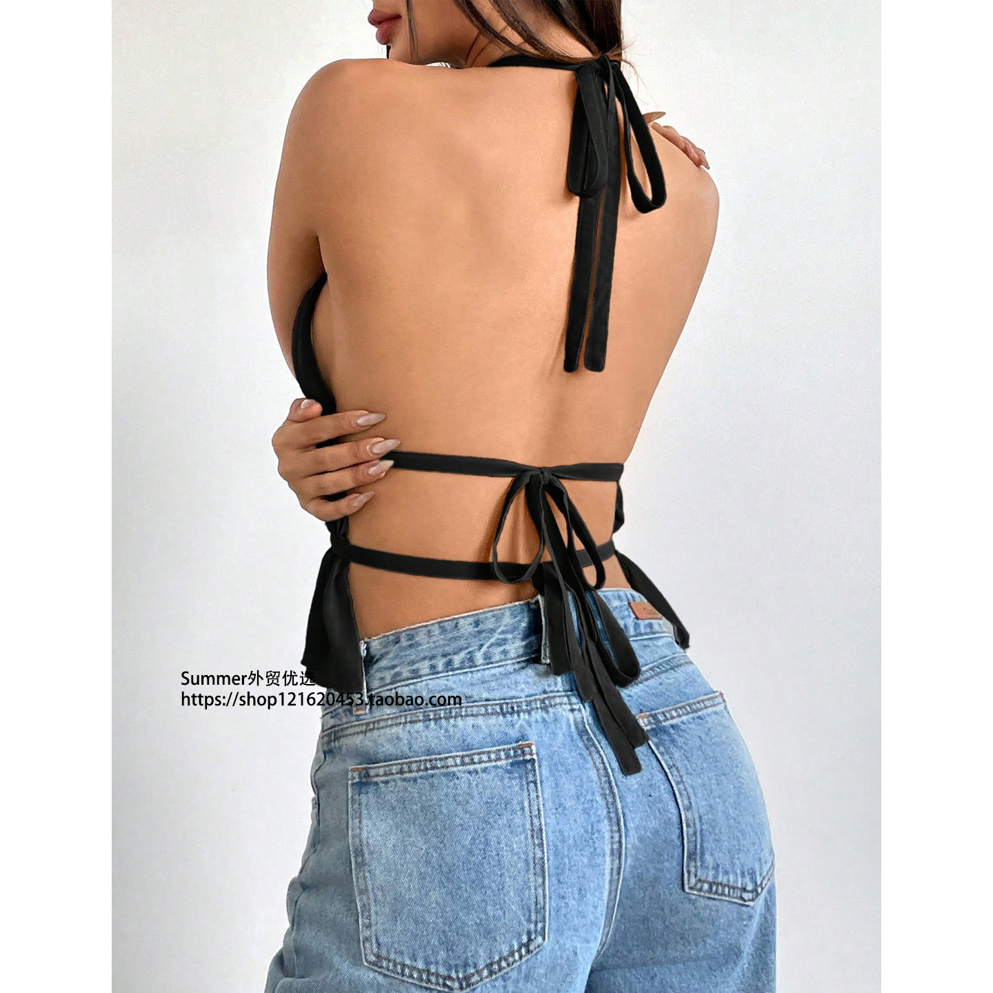 性感雪纺褶皱挂脖后背露背系带背心上衣女 Chiffon backless vest