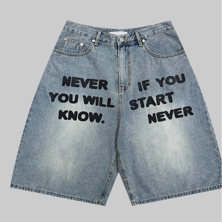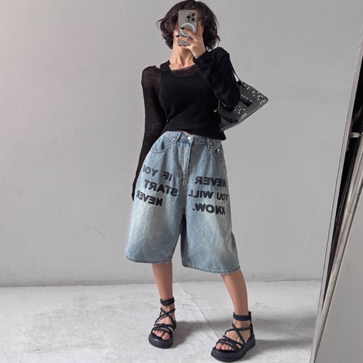 韩国代购 银赫同款 lettering bermuda denim pt印花百慕大短裤