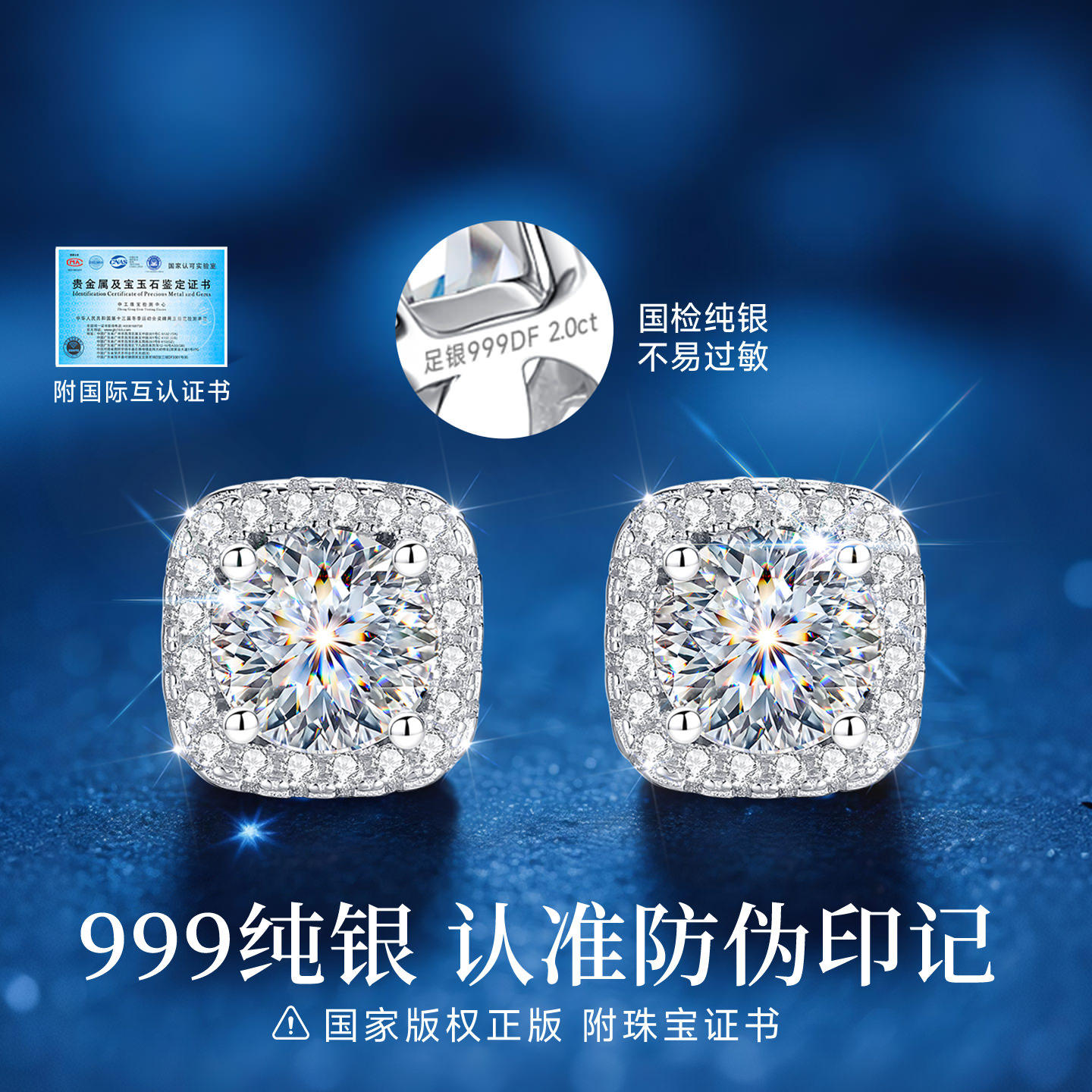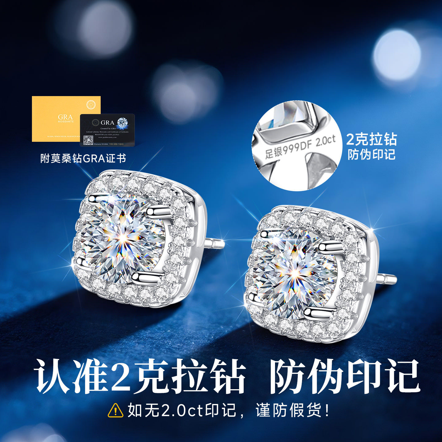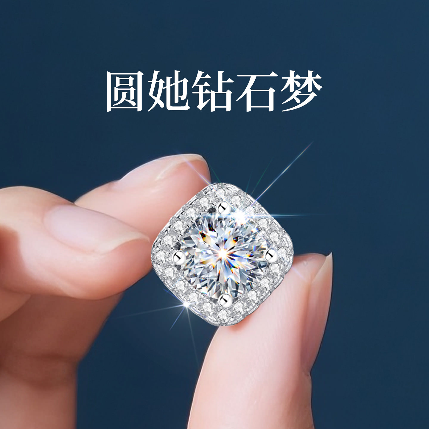 999纯银2克拉莫桑钻方糖小耳钉女士女爆闪大钻耳饰耳环高级感轻奢