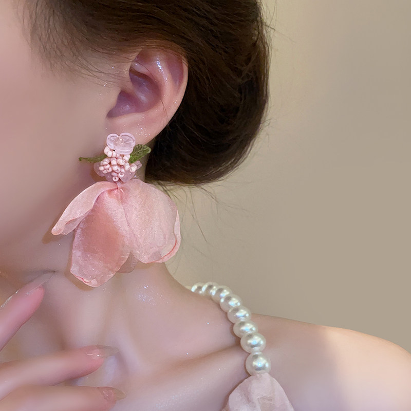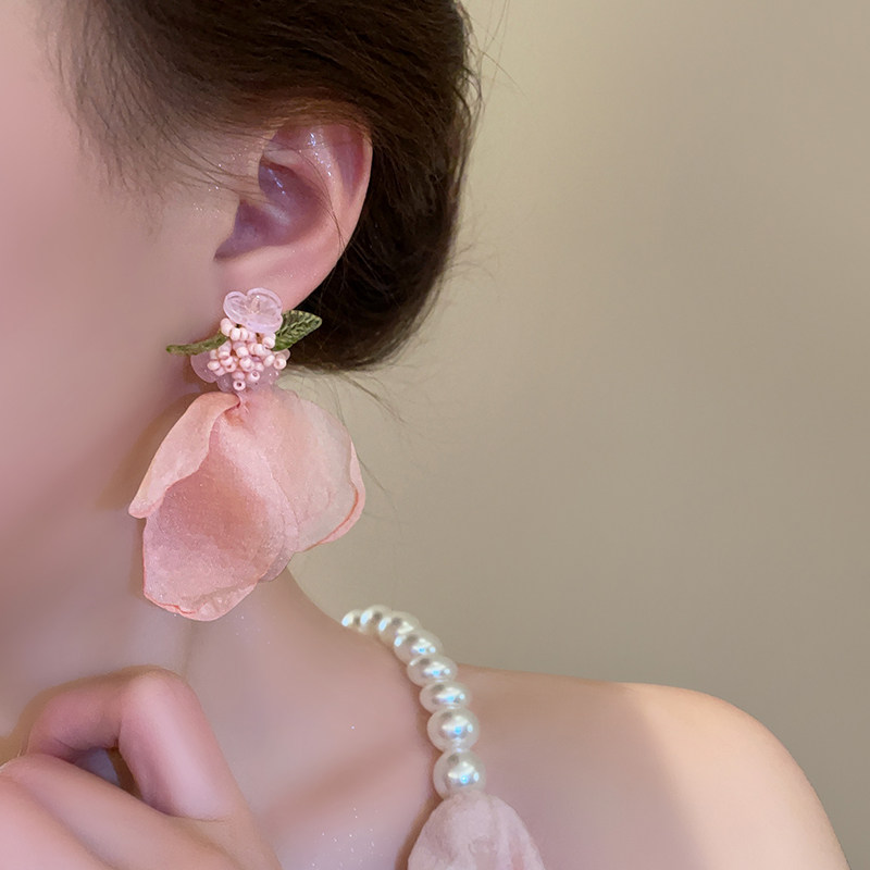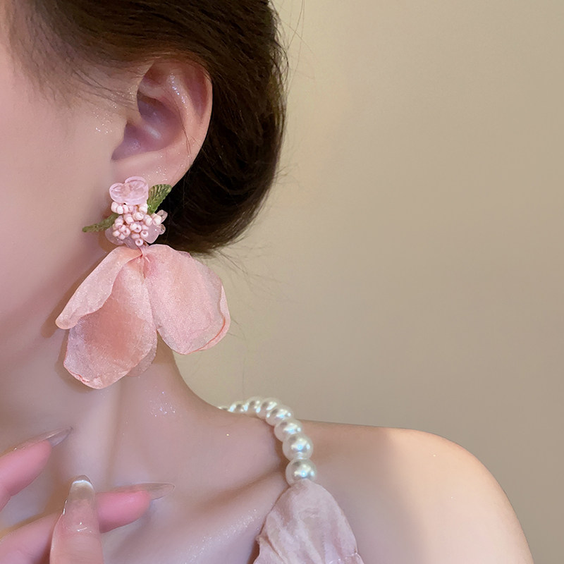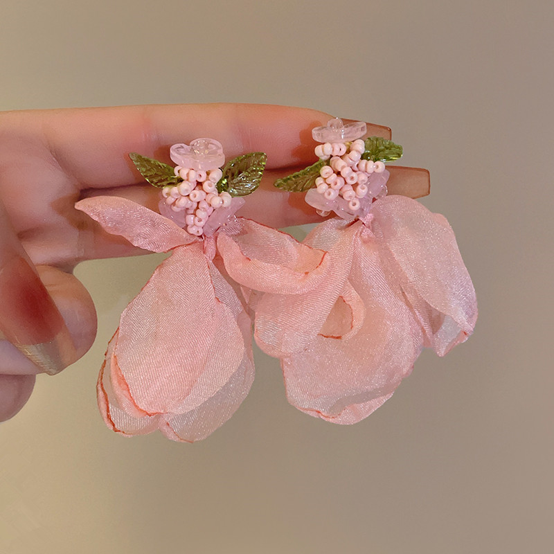 森系粉色雪纺花瓣耳环温柔甜美氛围感繁花耳钉夏日海边度假风耳坠