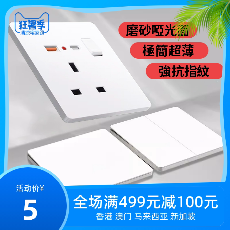 香港版英式哑光磨砂白超薄双联13A带USB快充开关插座套装86型电制