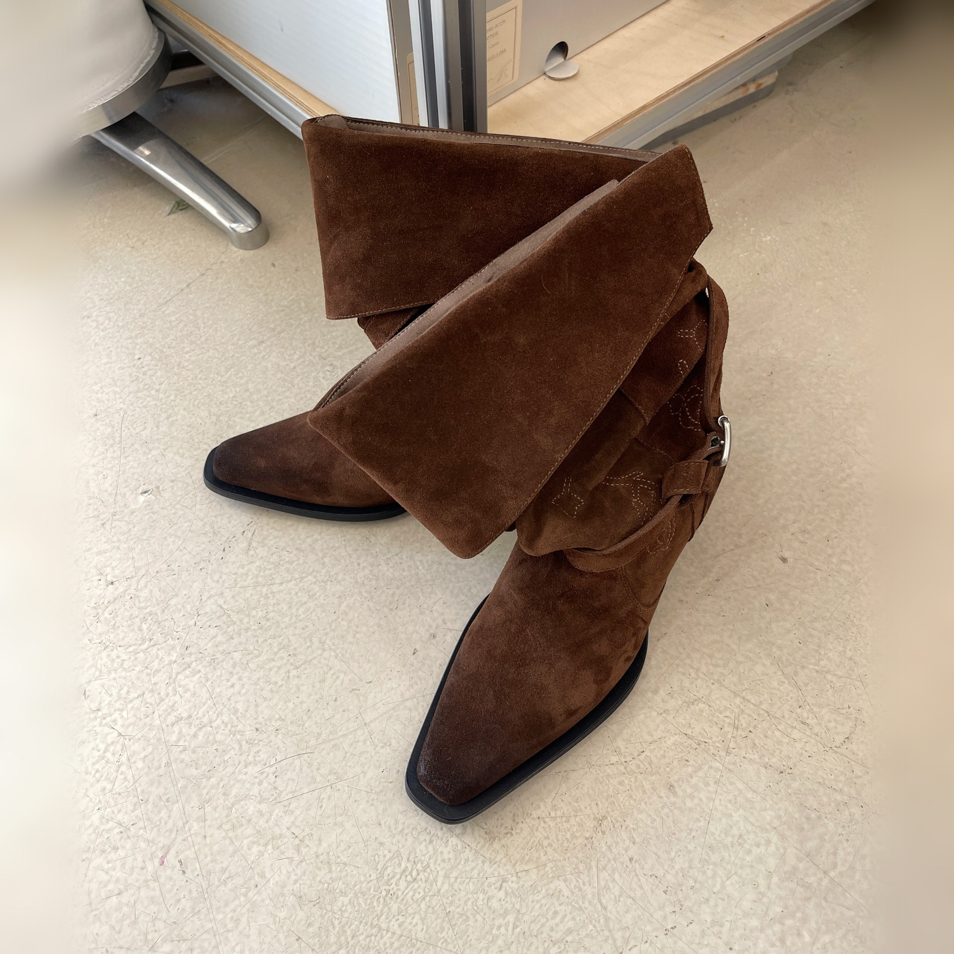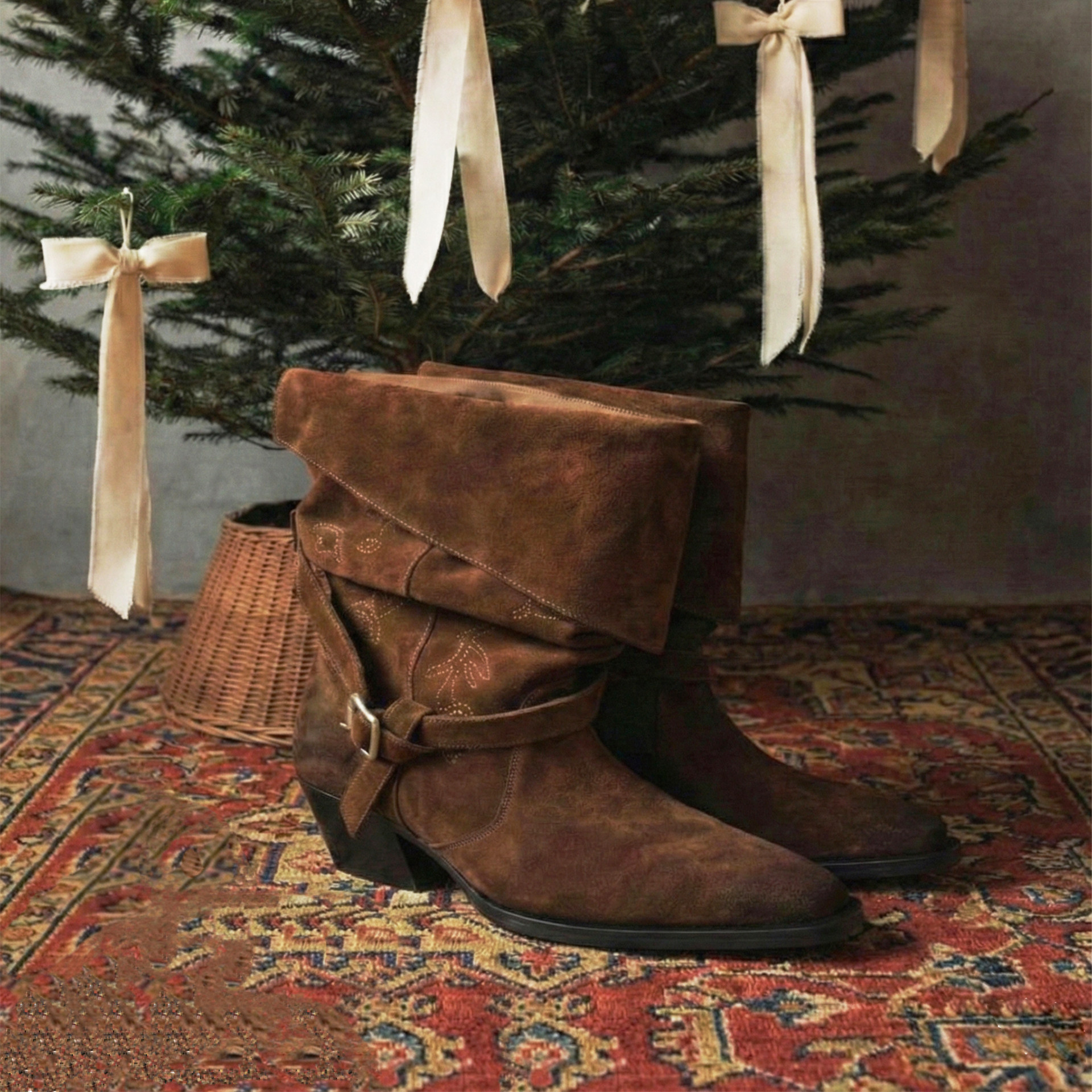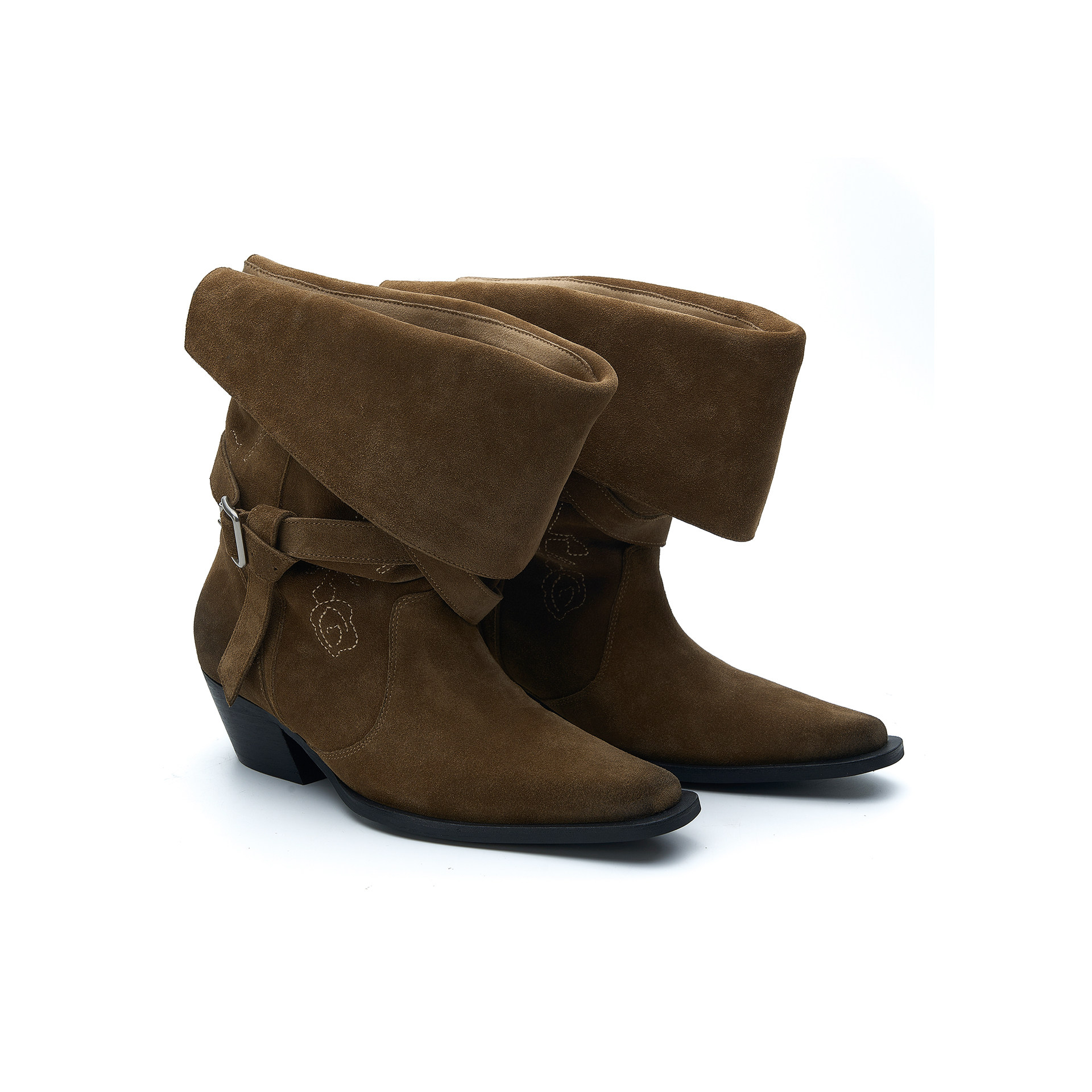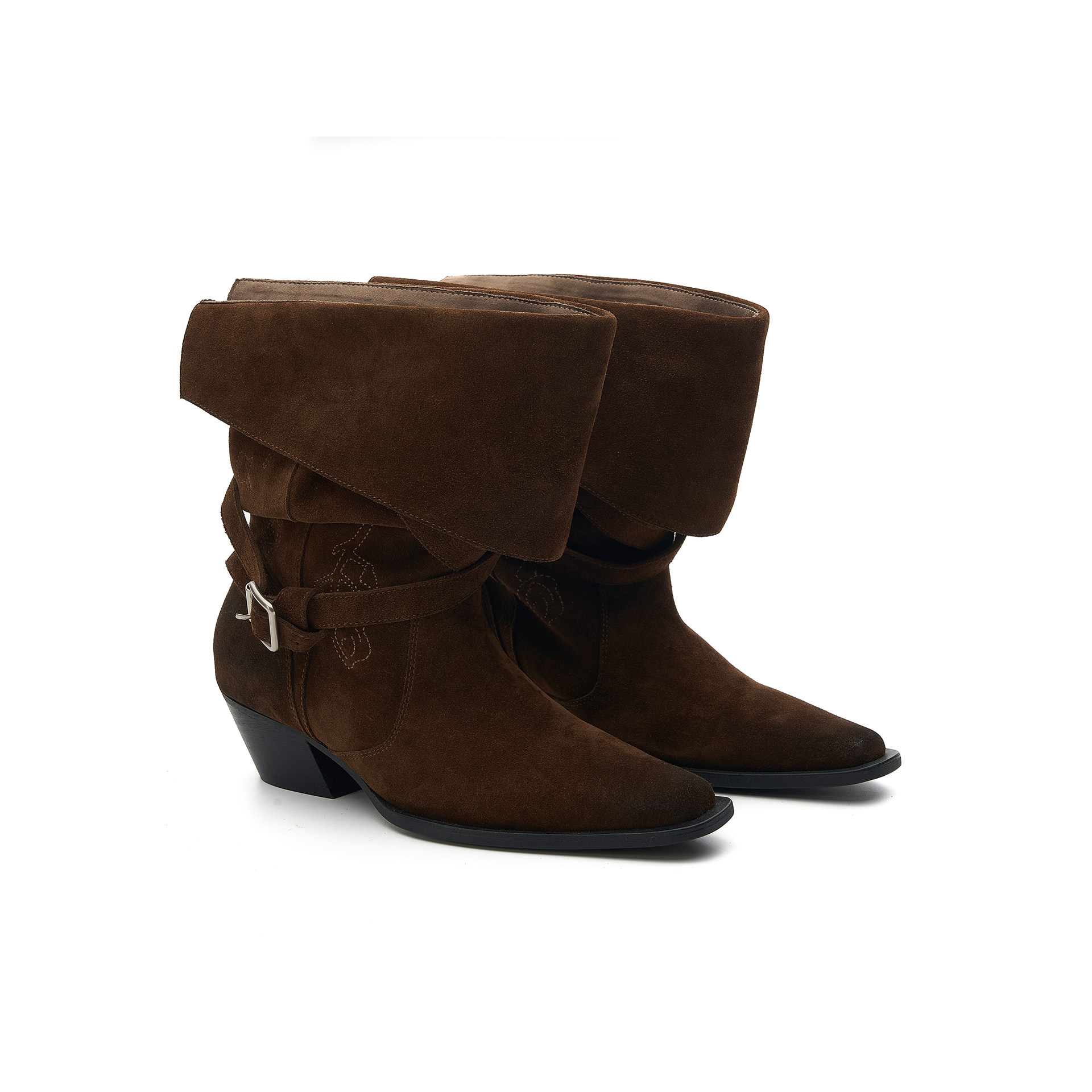 chinchin 2026春夏新款玫瑰刺绣绒面中筒靴游牧风尖头靴子女M星店
