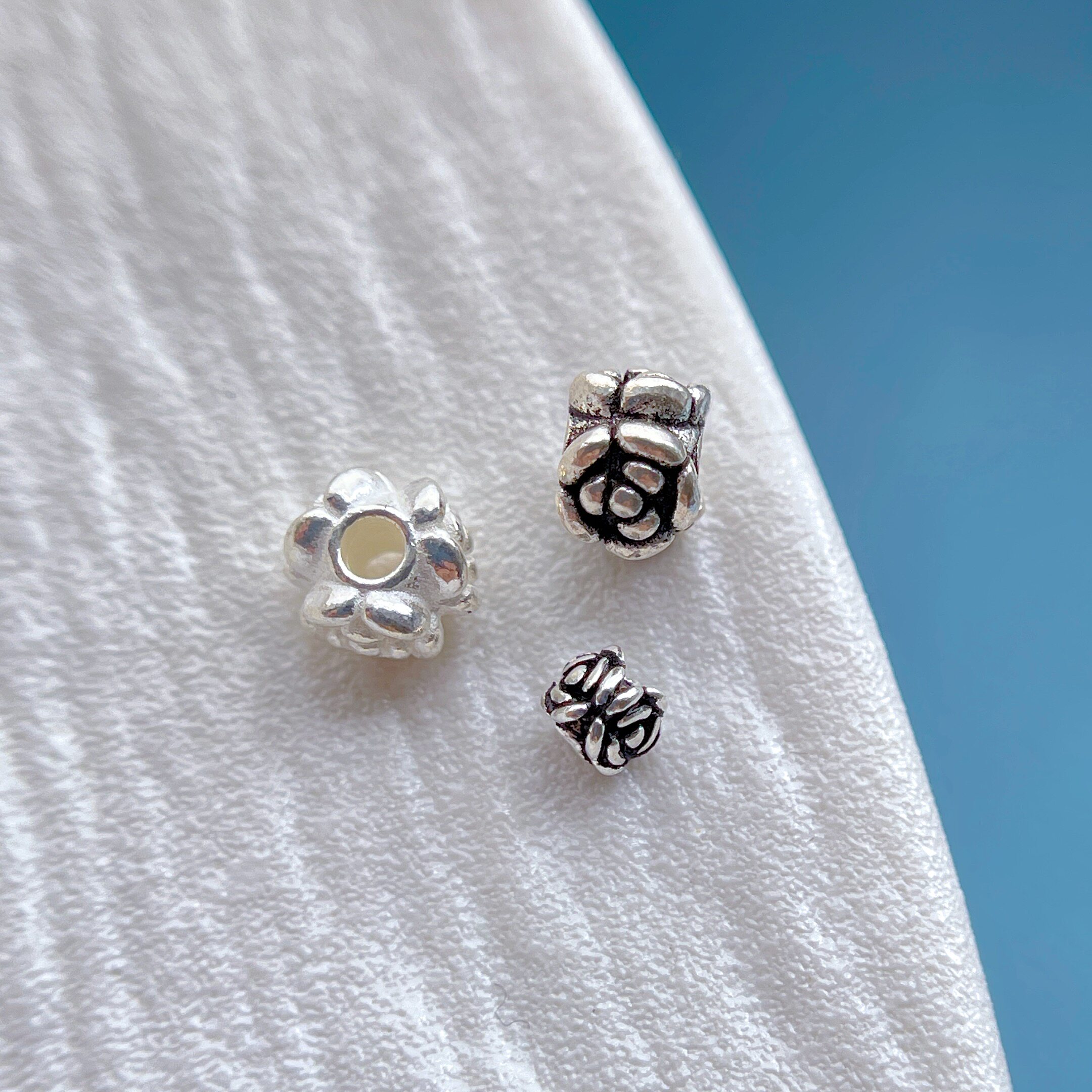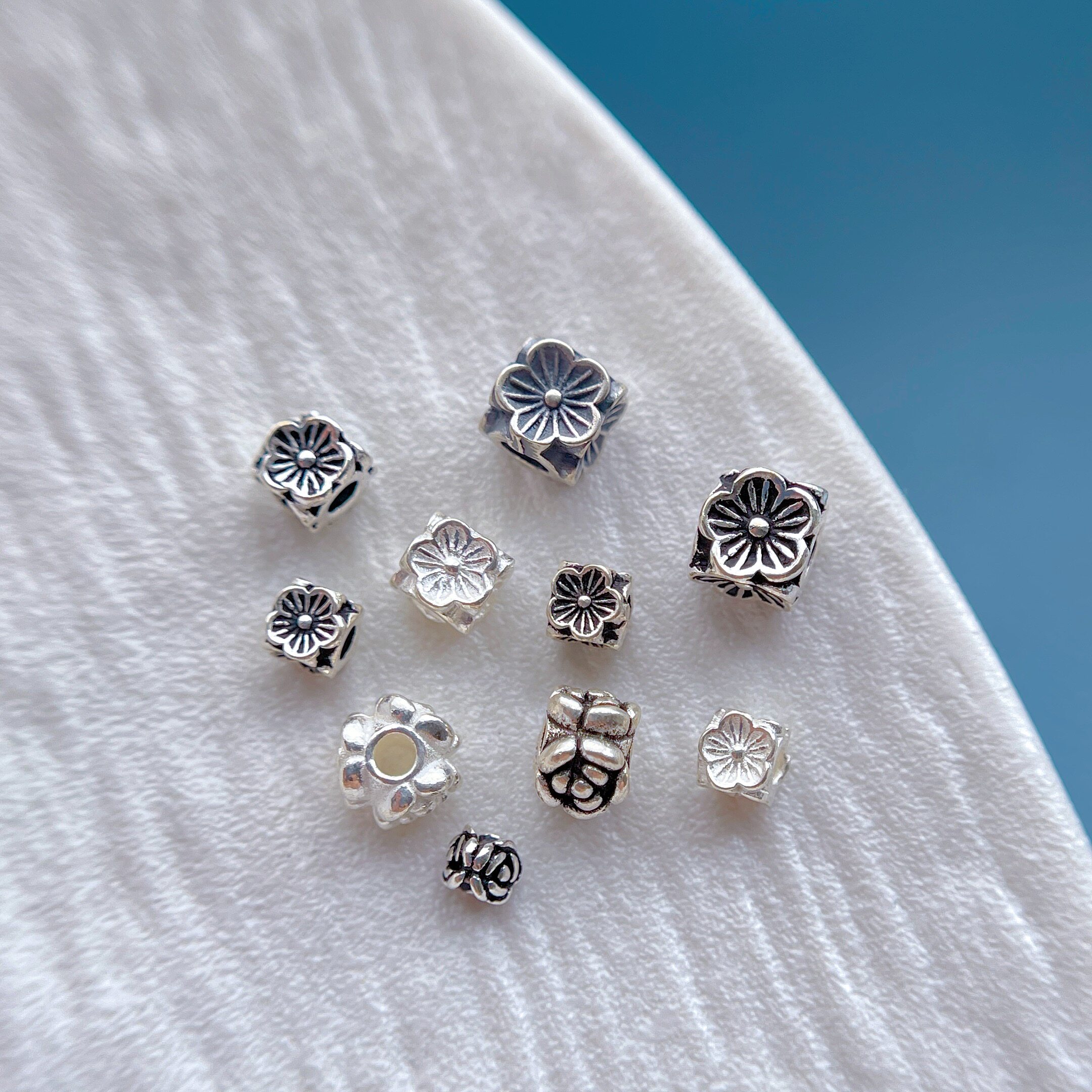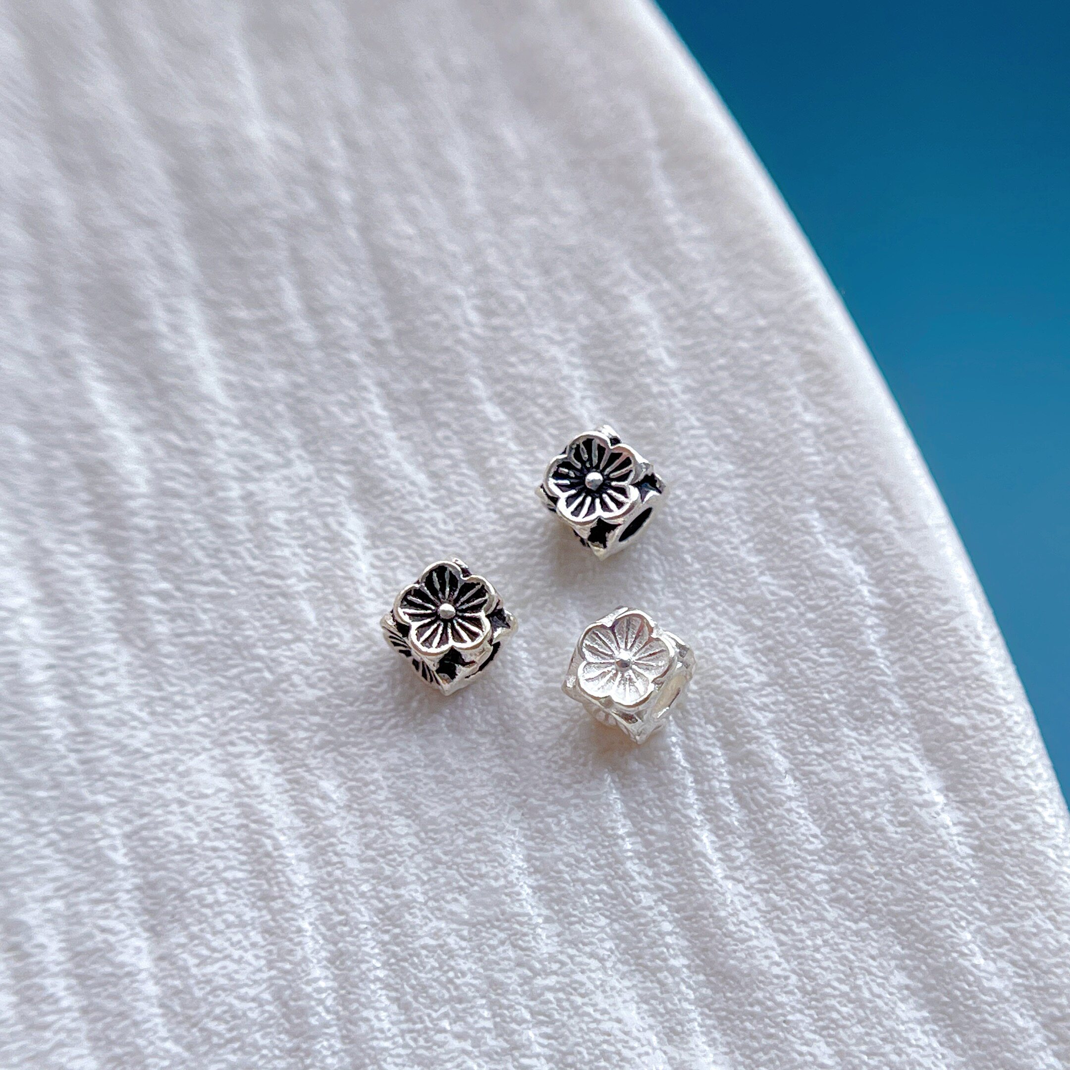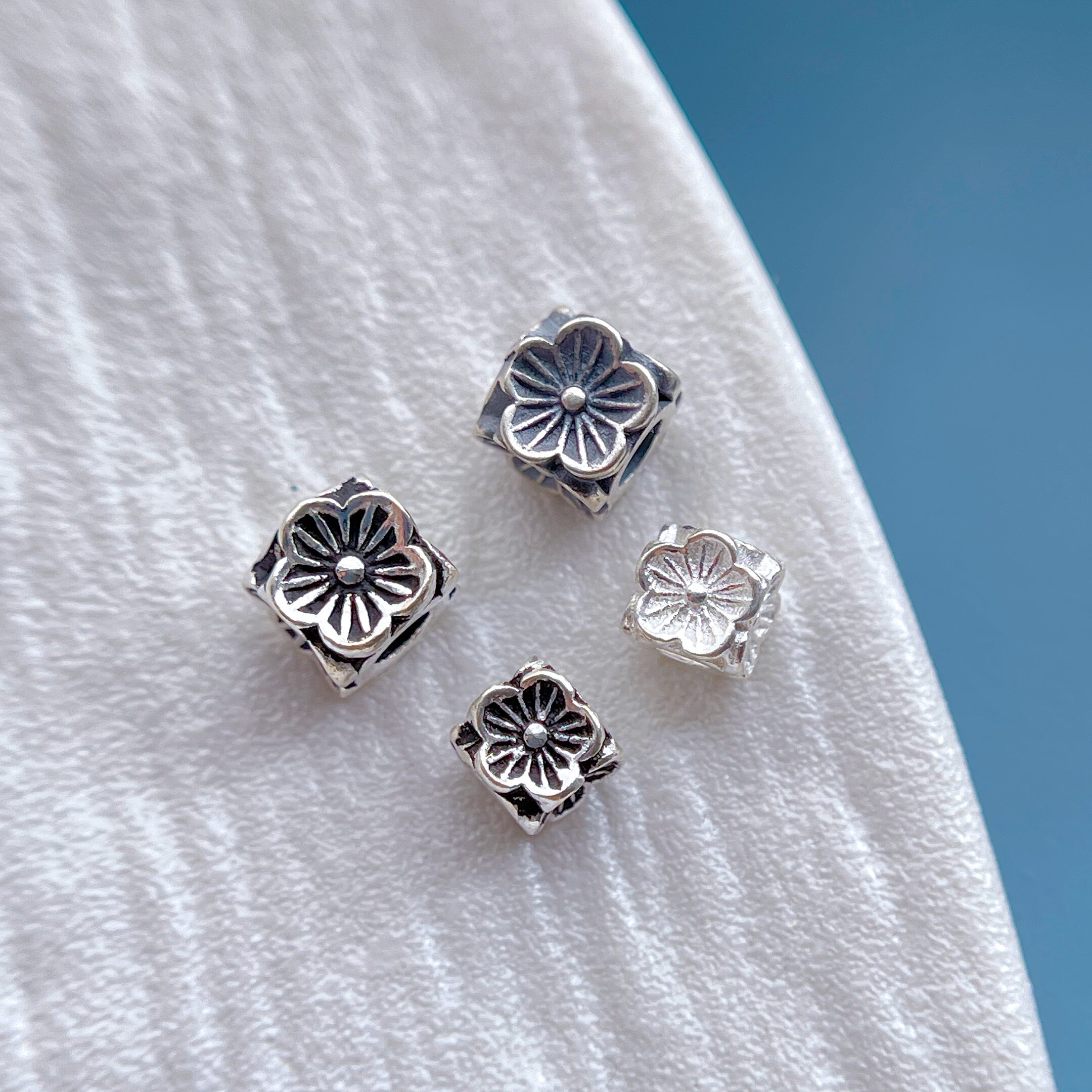 s925纯银饰配件四面小花隔珠方形珠三角花珠diy水晶手串项链配饰