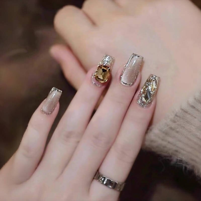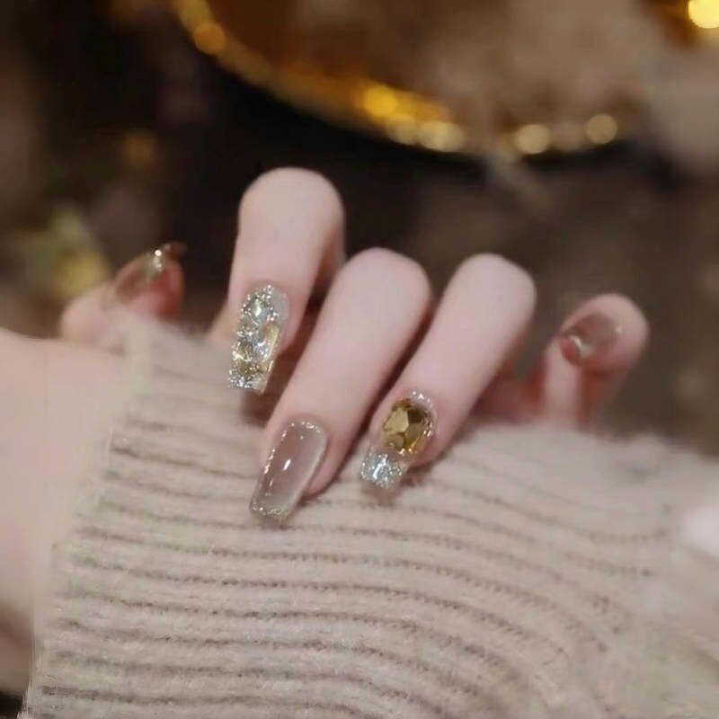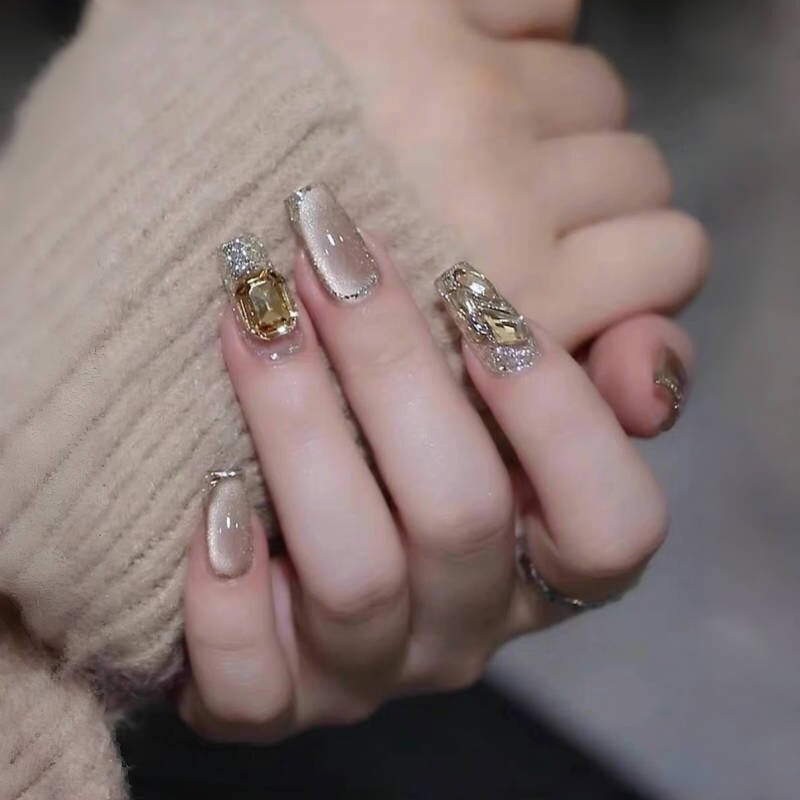 美拉德猫眼奶香摩卡手工穿戴甲爆闪梯型美甲显白假指甲成品可拆卸