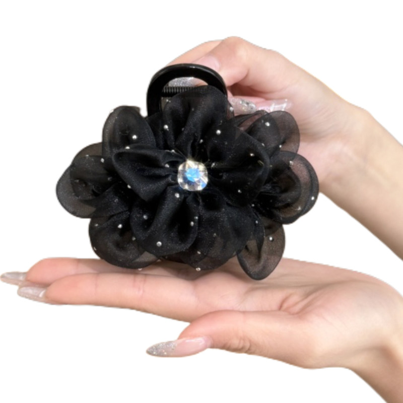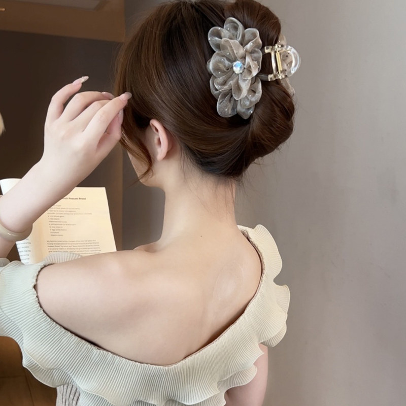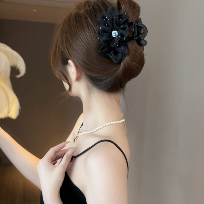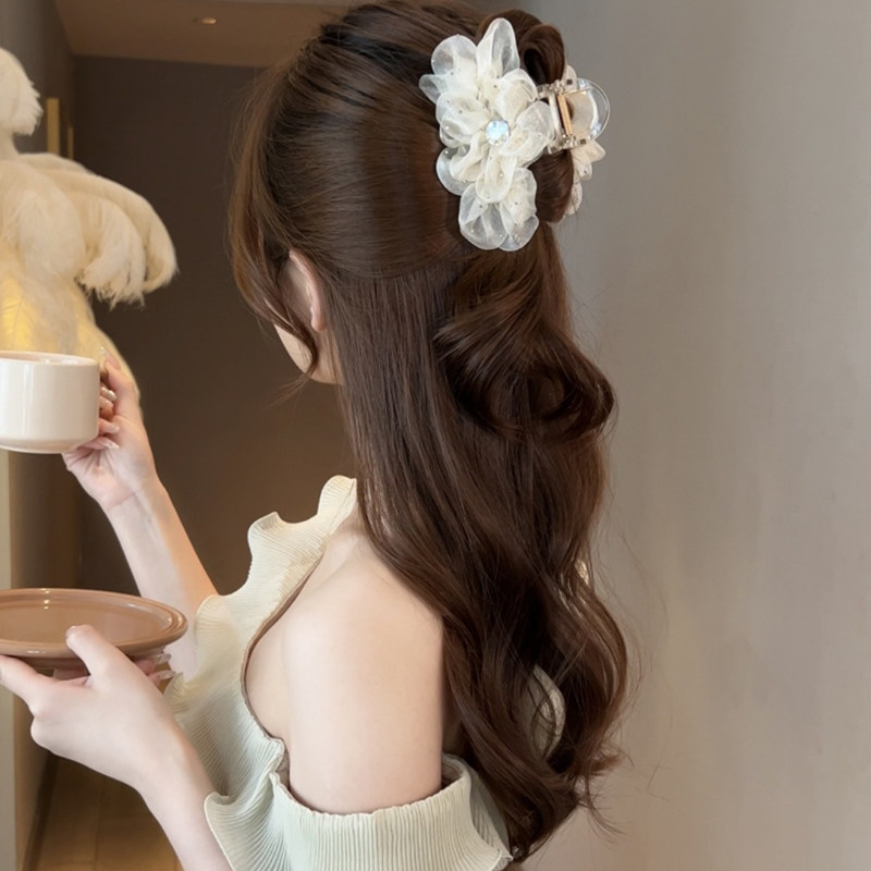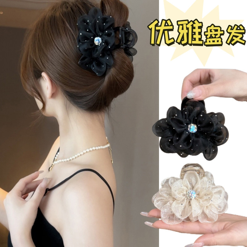 新款网纱花朵中号抓夹优雅气质后脑勺盘发鲨鱼夹女高级感半披发夹