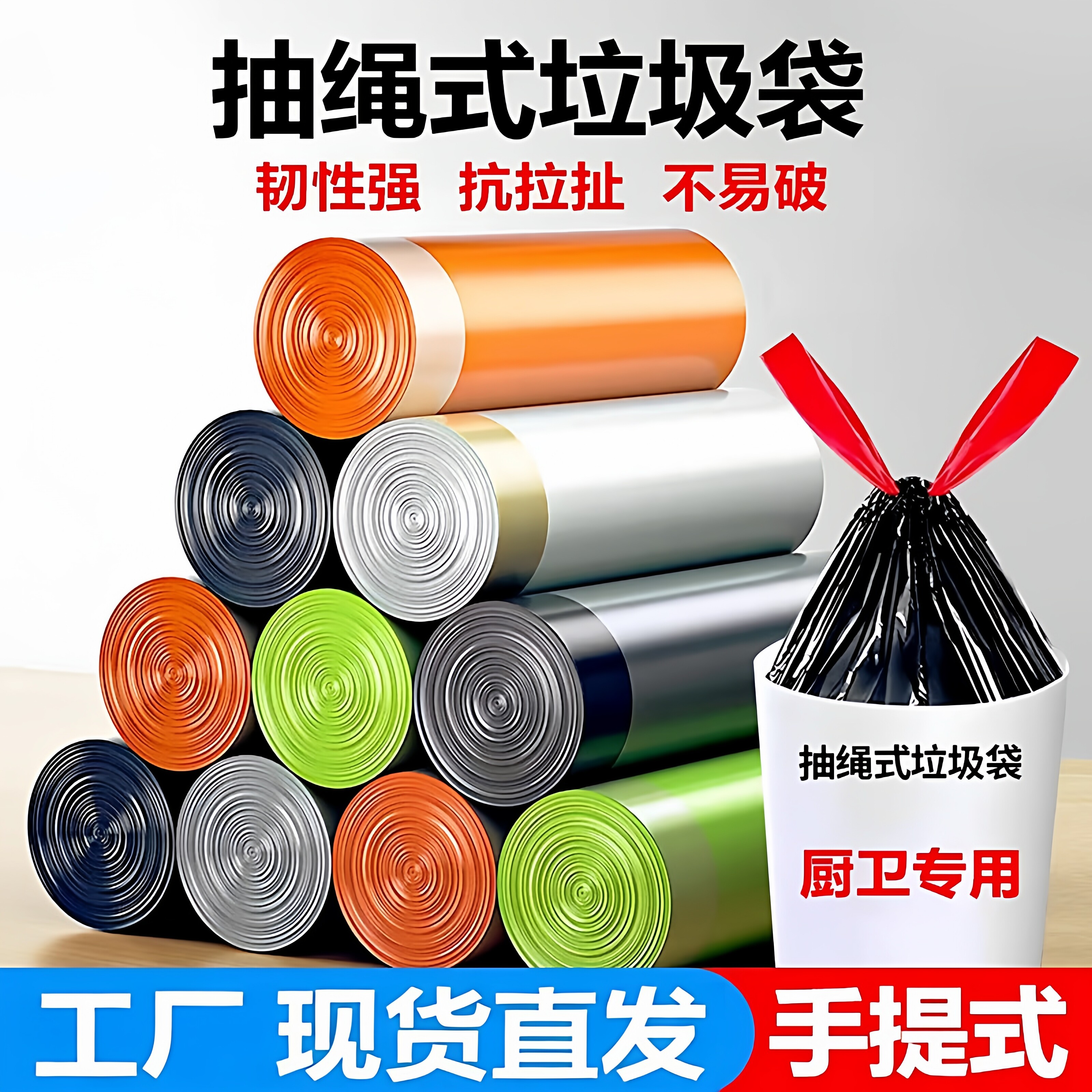 便携自动收口家用加厚抽绳垃圾袋家用手提式大号厨房清洁塑料袋子
