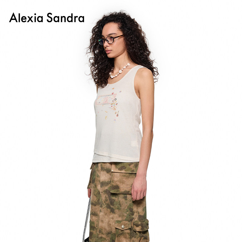Alexia Sandra新款幸运金币印花假两件背心无袖T恤女夏可外穿女