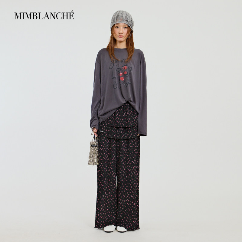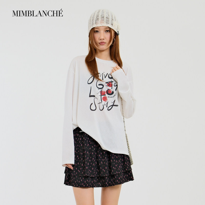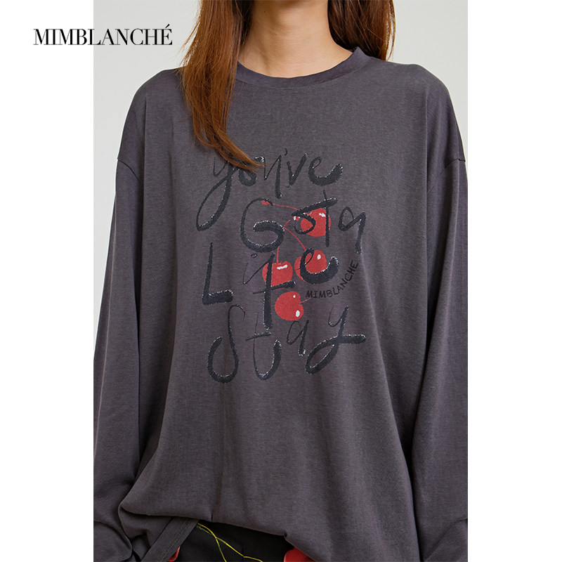 MIMBLANCHE天丝棉樱桃印花圆领长袖宽松休闲大T恤女