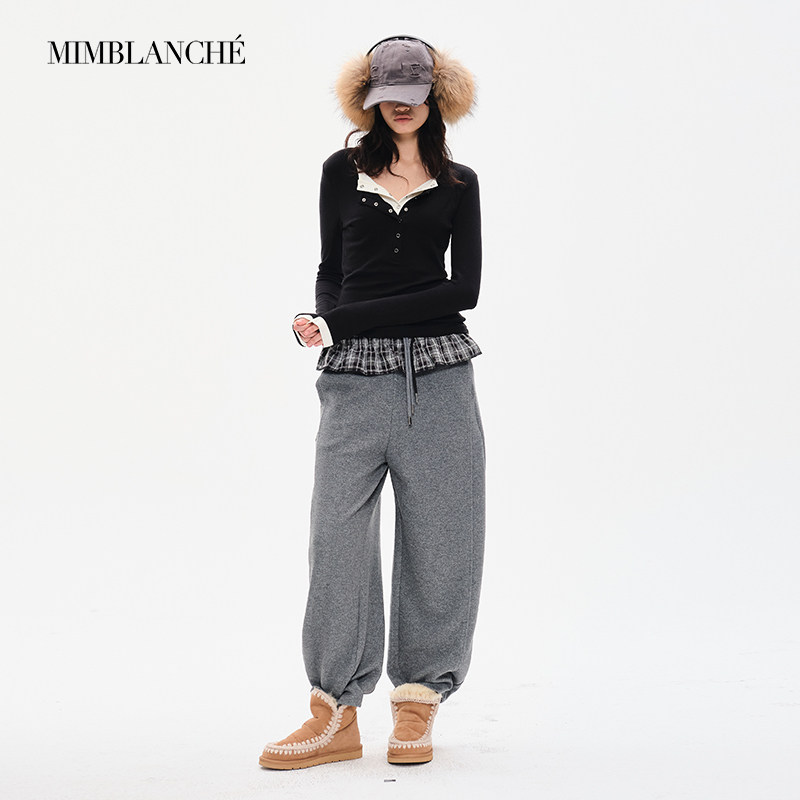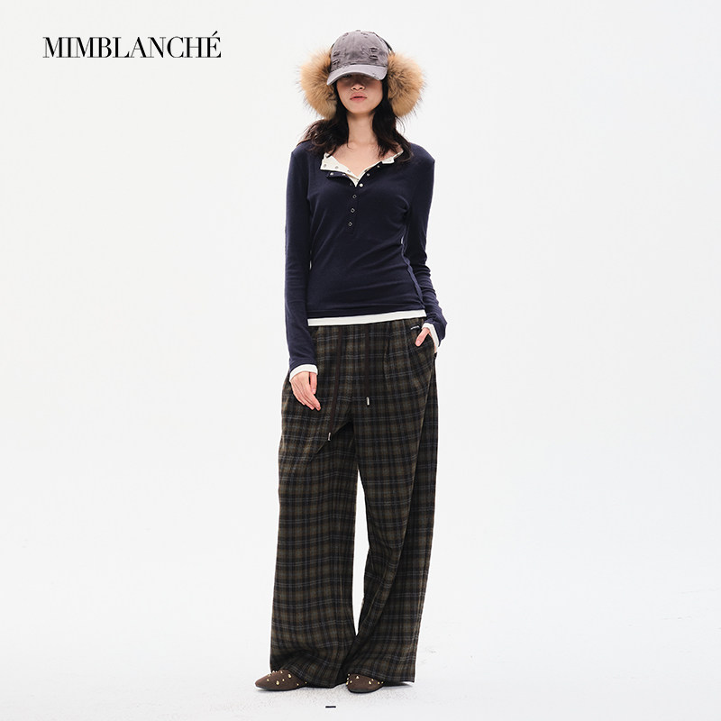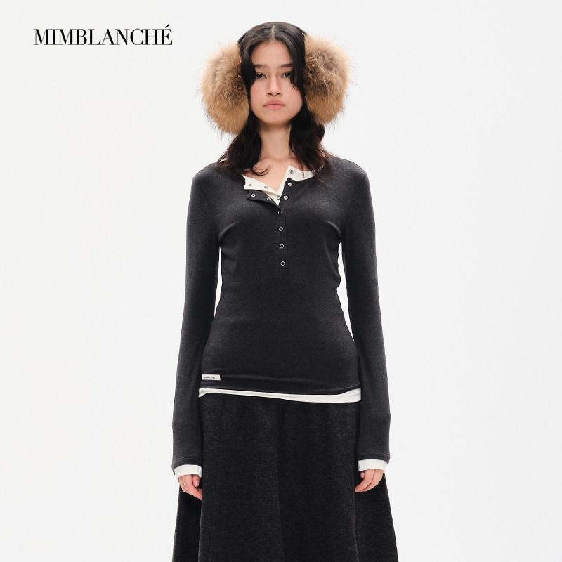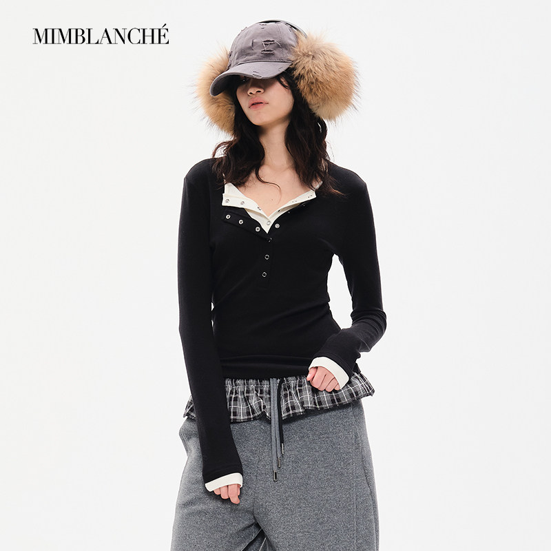 MIMBLANCHE向涵之同款修身长袖撞色假两件亨利衫女