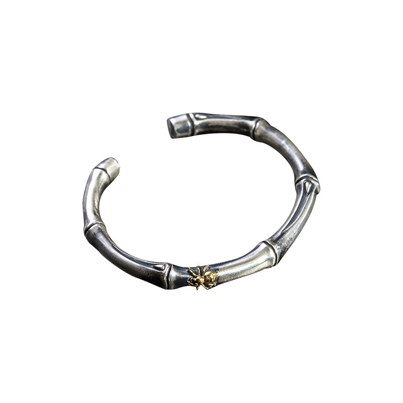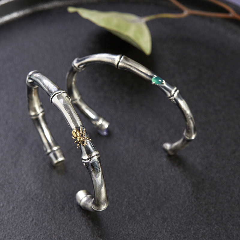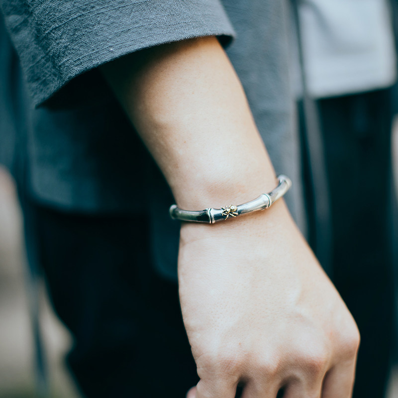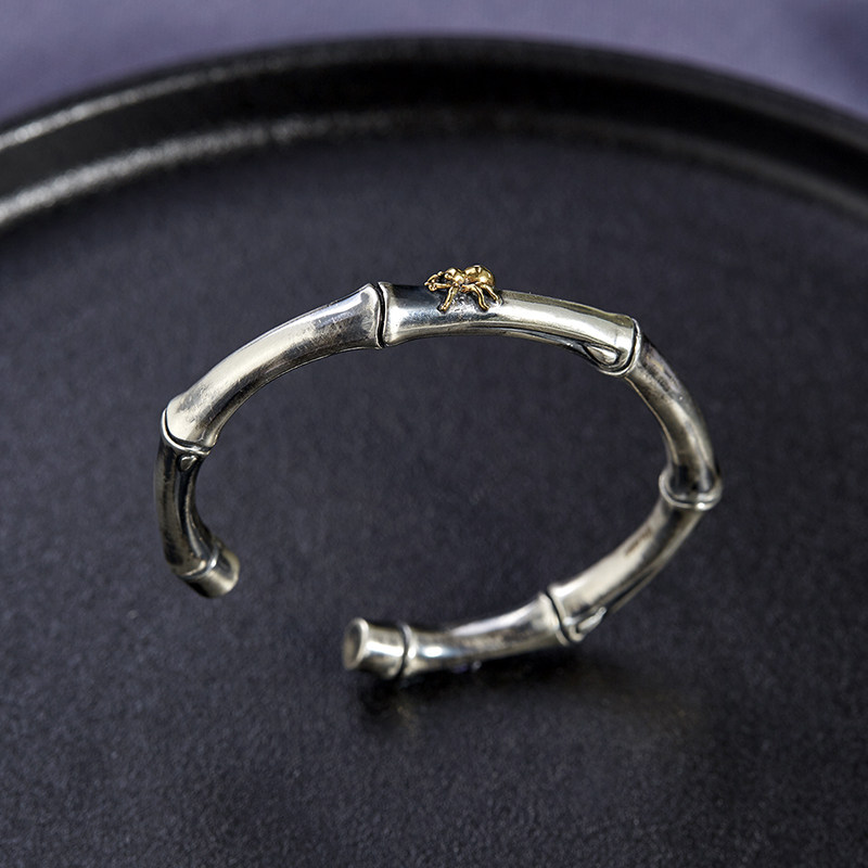 999纯银手镯男中国风复古做旧实心知足常乐平安竹情侣开口银镯子