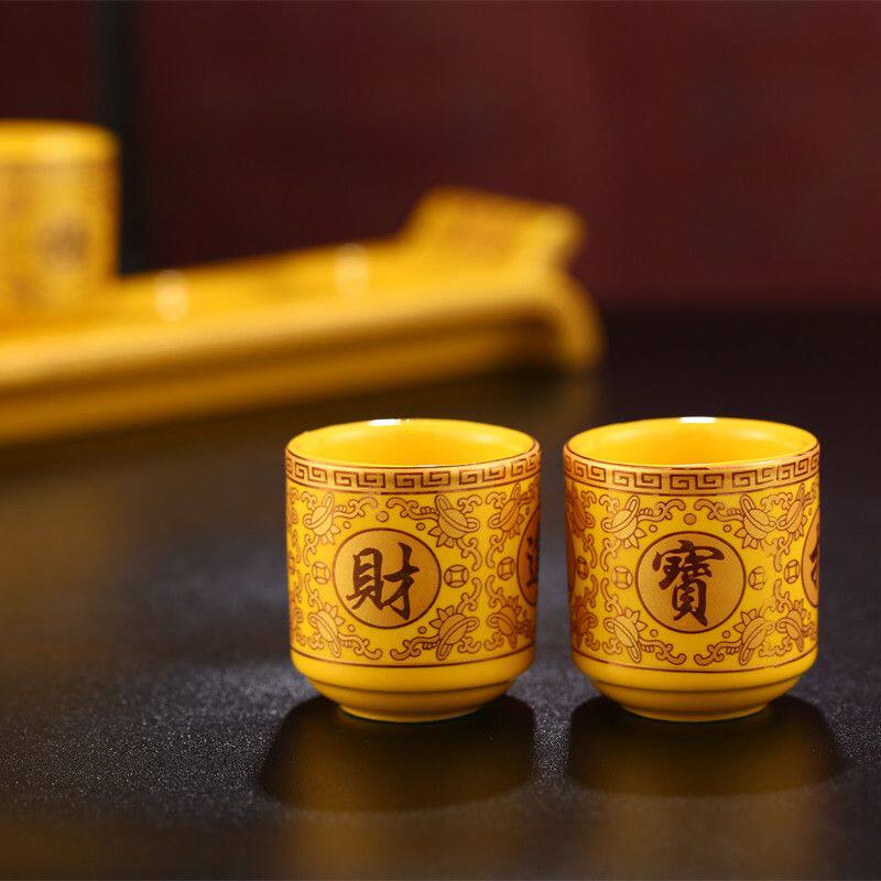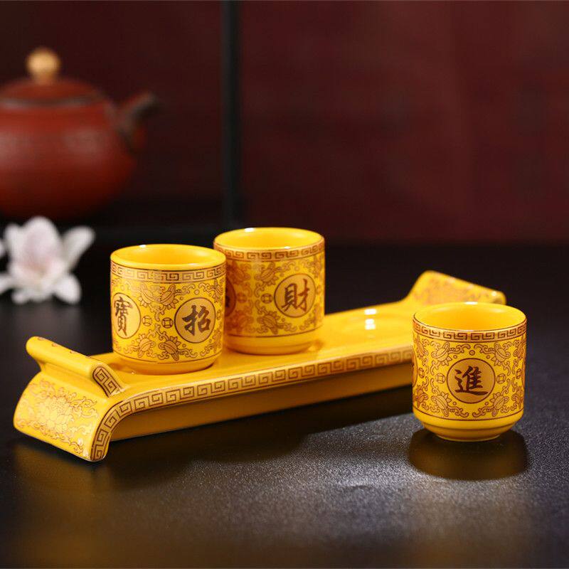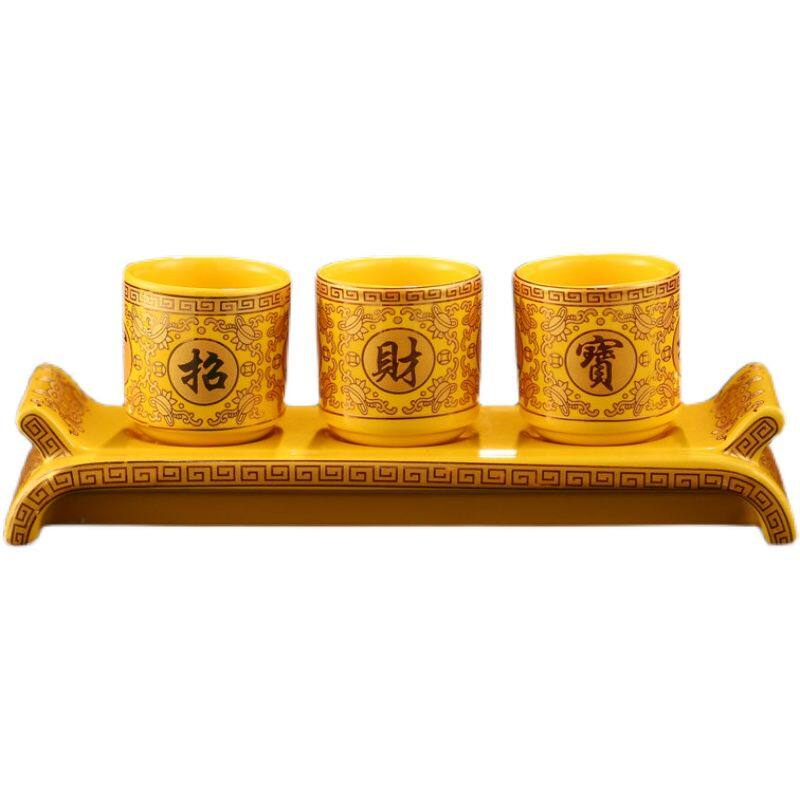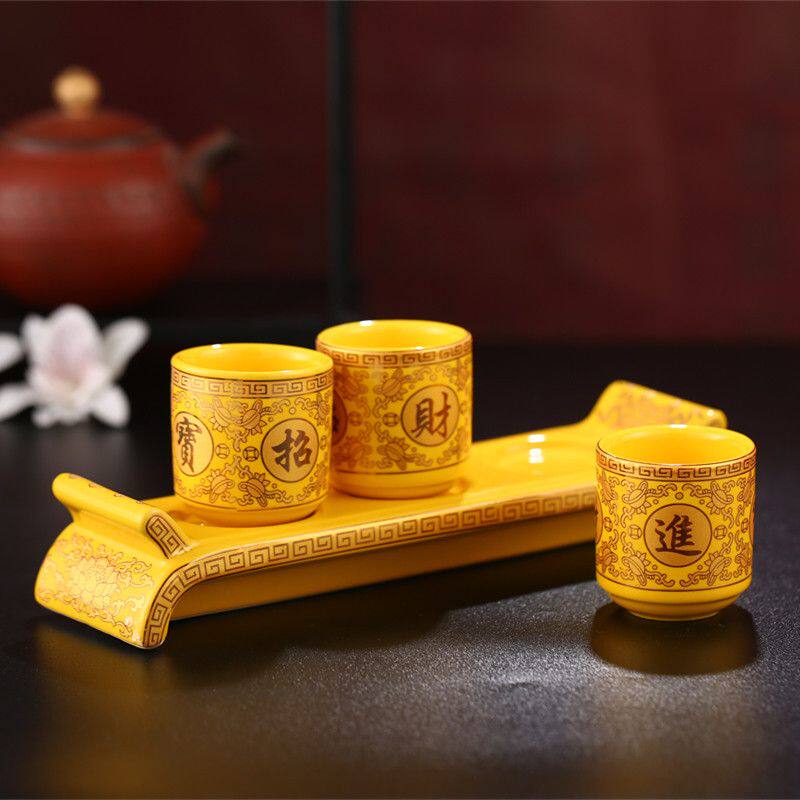 佛前酒盅摆件供佛财神土地供杯陶瓷浮雕三连座高脚酒杯茶杯贡杯