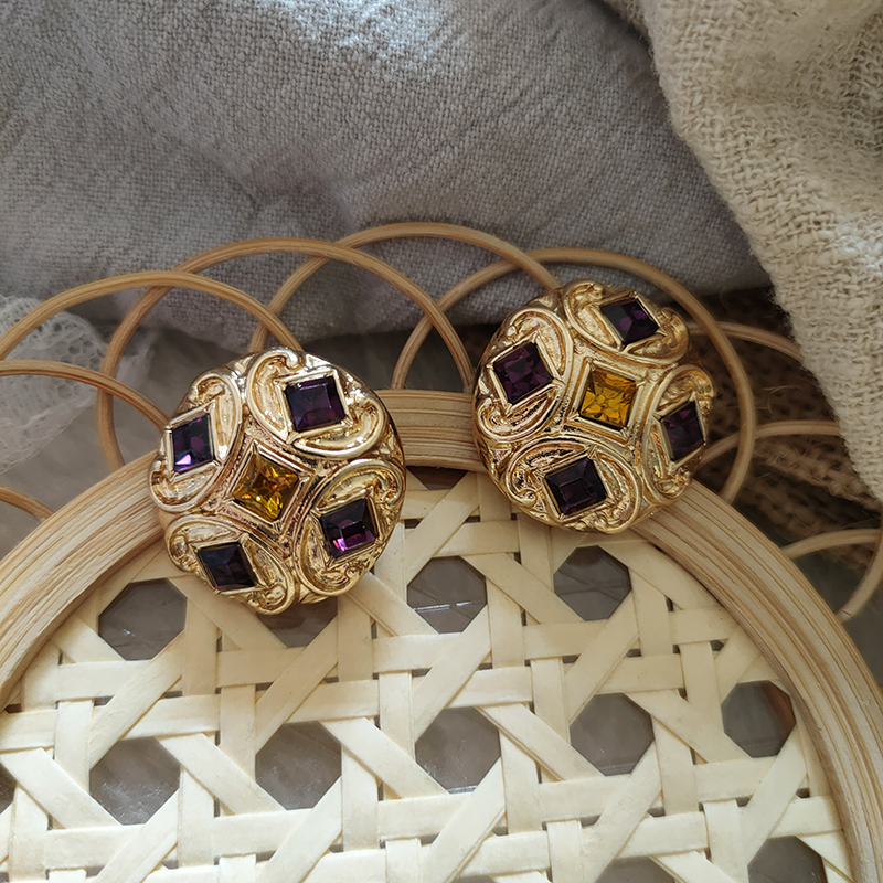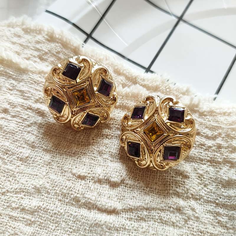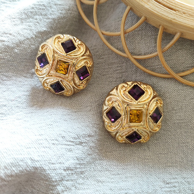 中式复古Vintage耳饰巴洛克风格紫色琉璃圆形耳钉气质百搭993