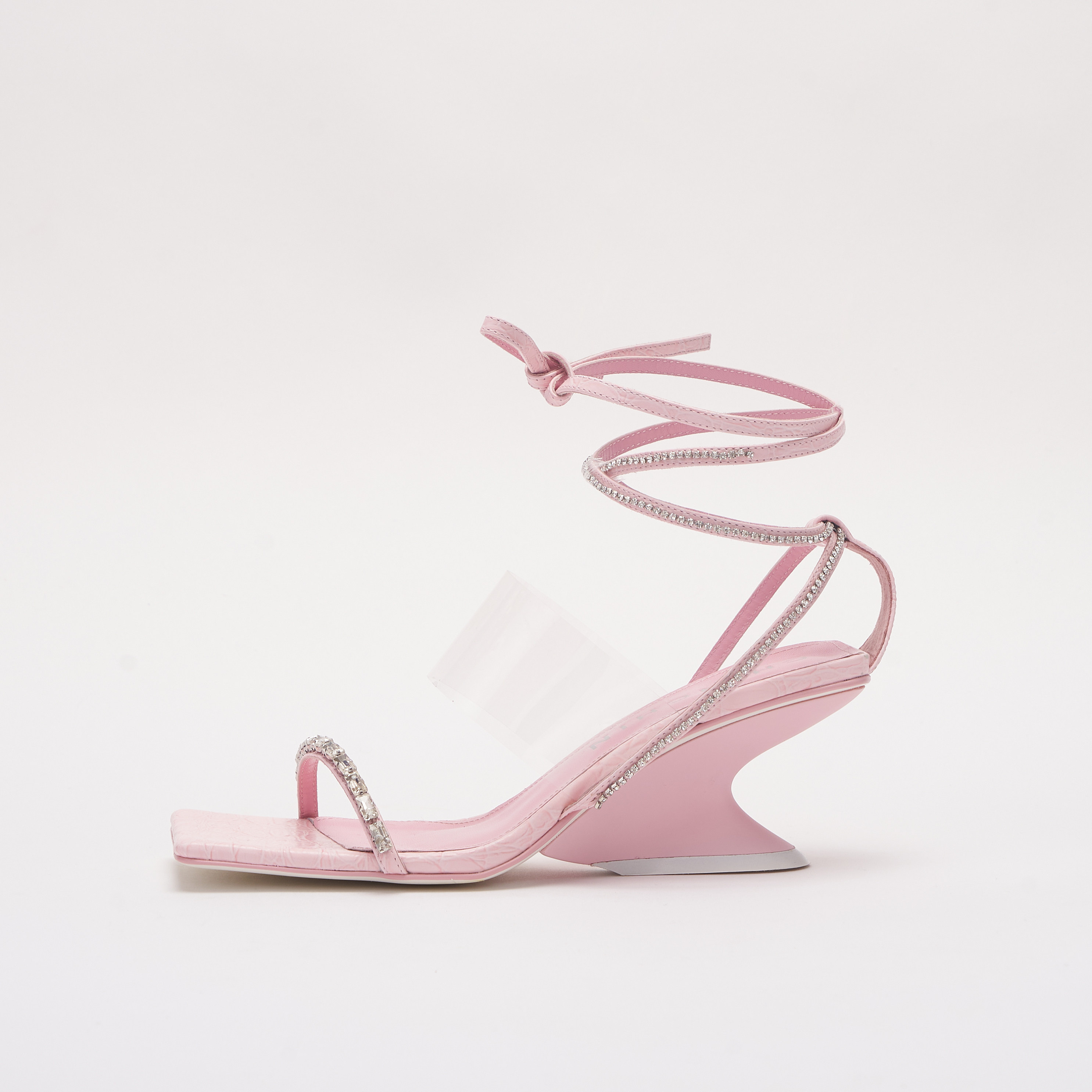 CHINCHIN官方原创设计师|周也同款方头PVC钻饰绑带坡跟高跟鞋