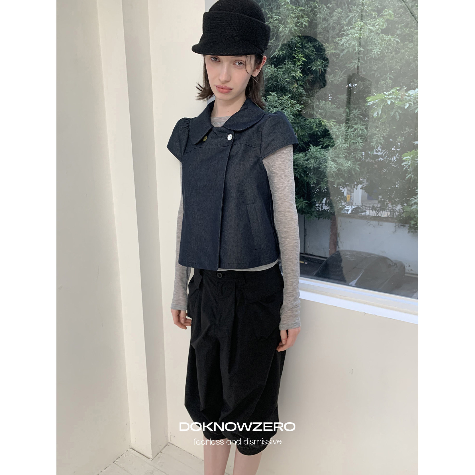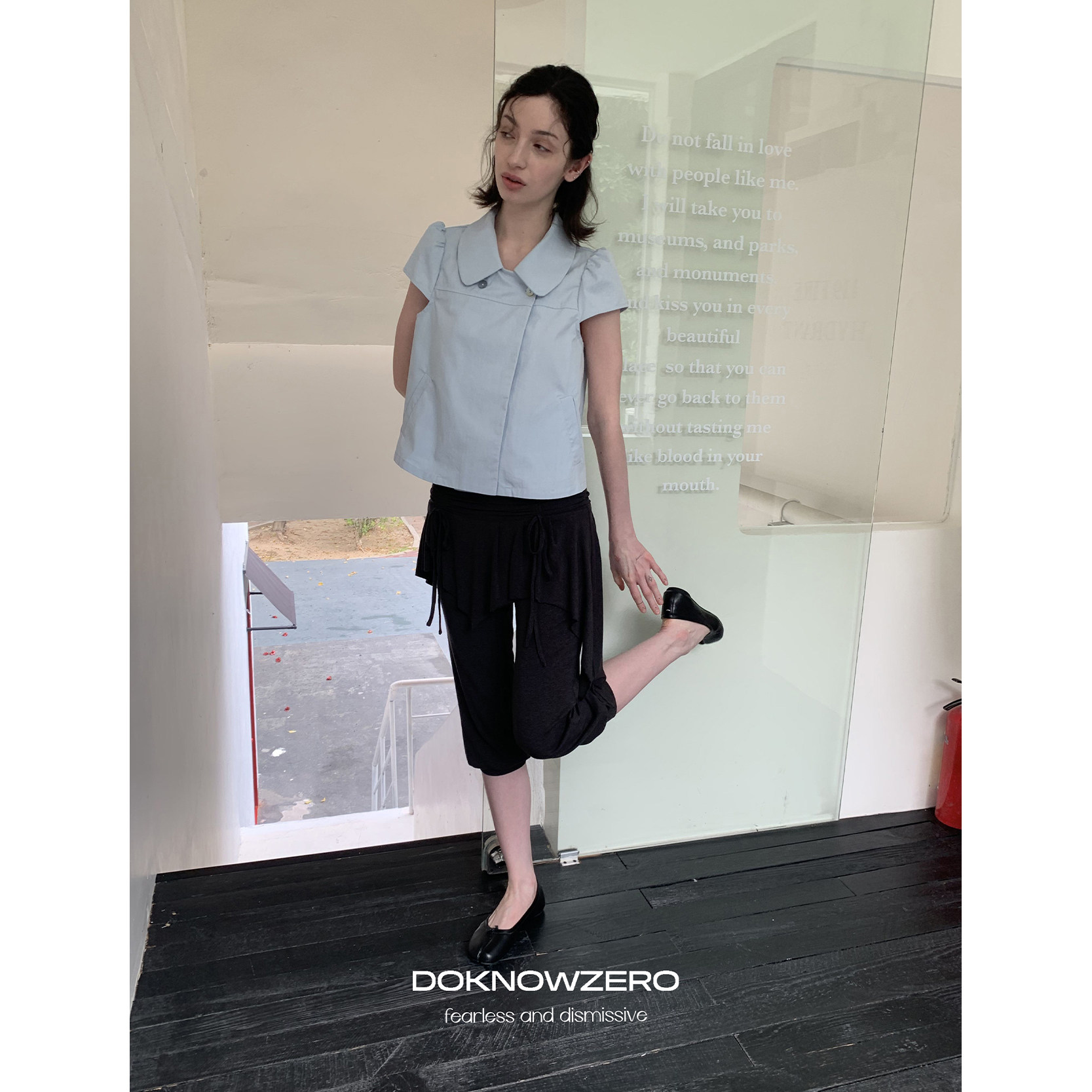 DKZ 春夏新款双排扣娃娃领短款通勤衬衫