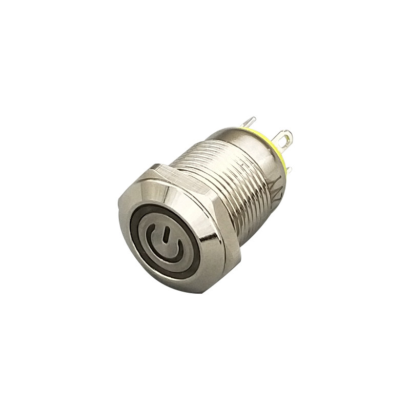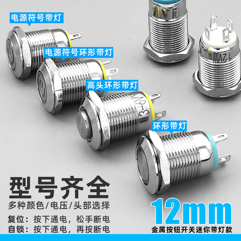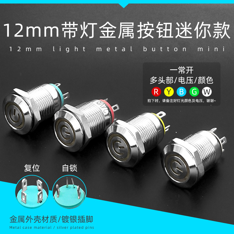 自锁复位12mm金属按钮开关平头防溅水带电源符号环形LED灯4只脚