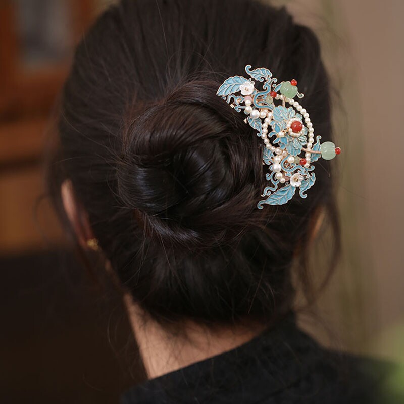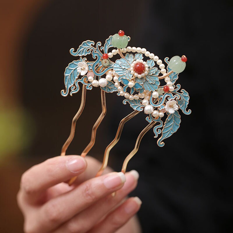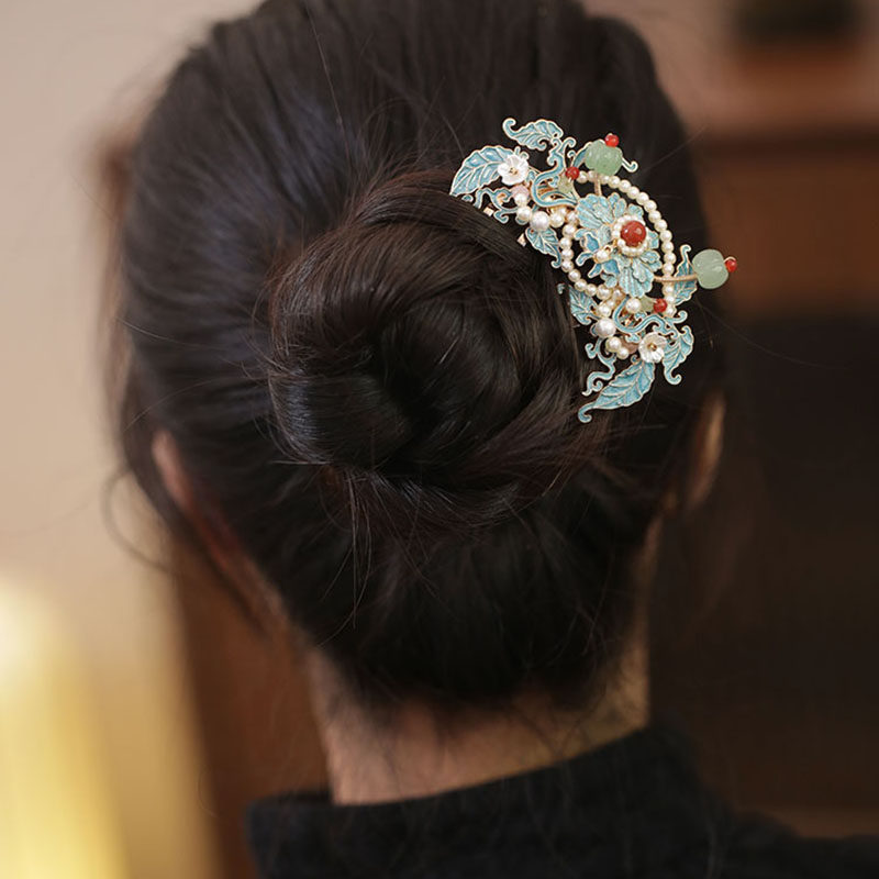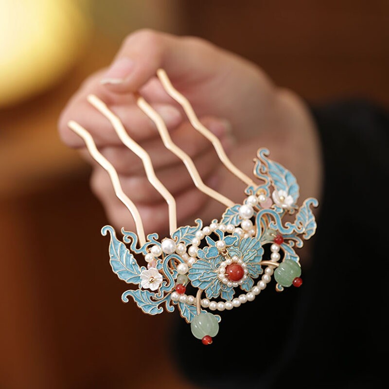 烧蓝花朵四齿插梳发梳盘发旗袍发簪古风女高级感发髻簪子国风头饰
