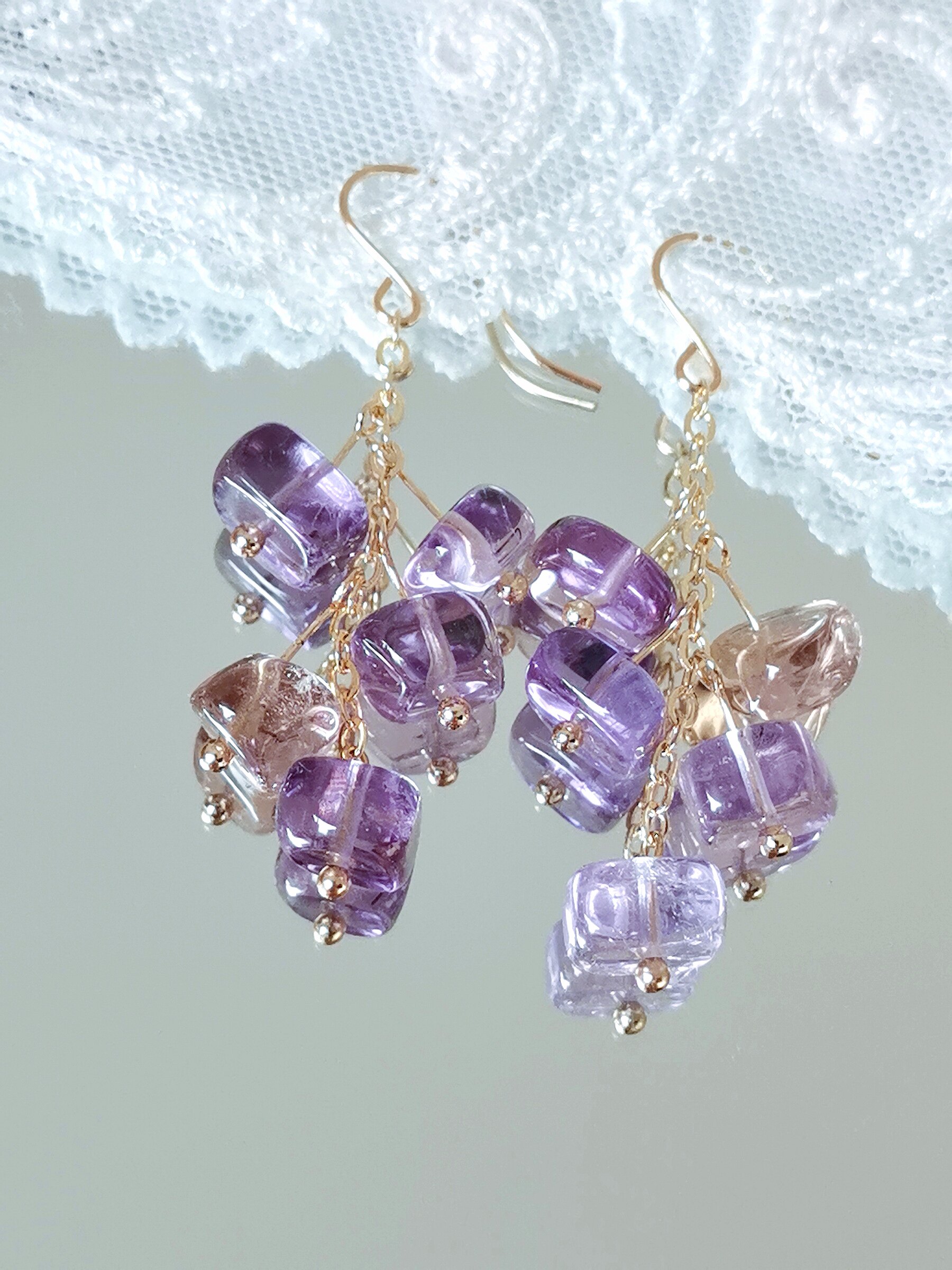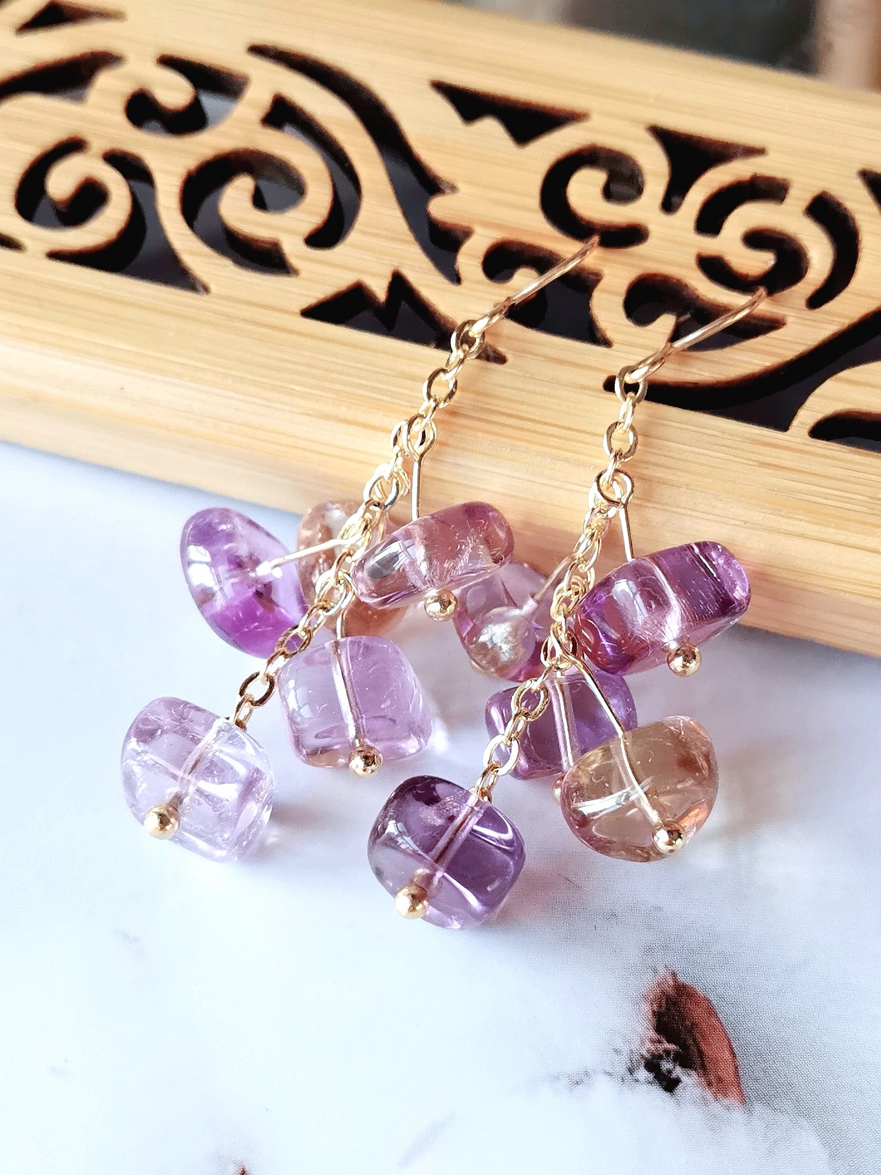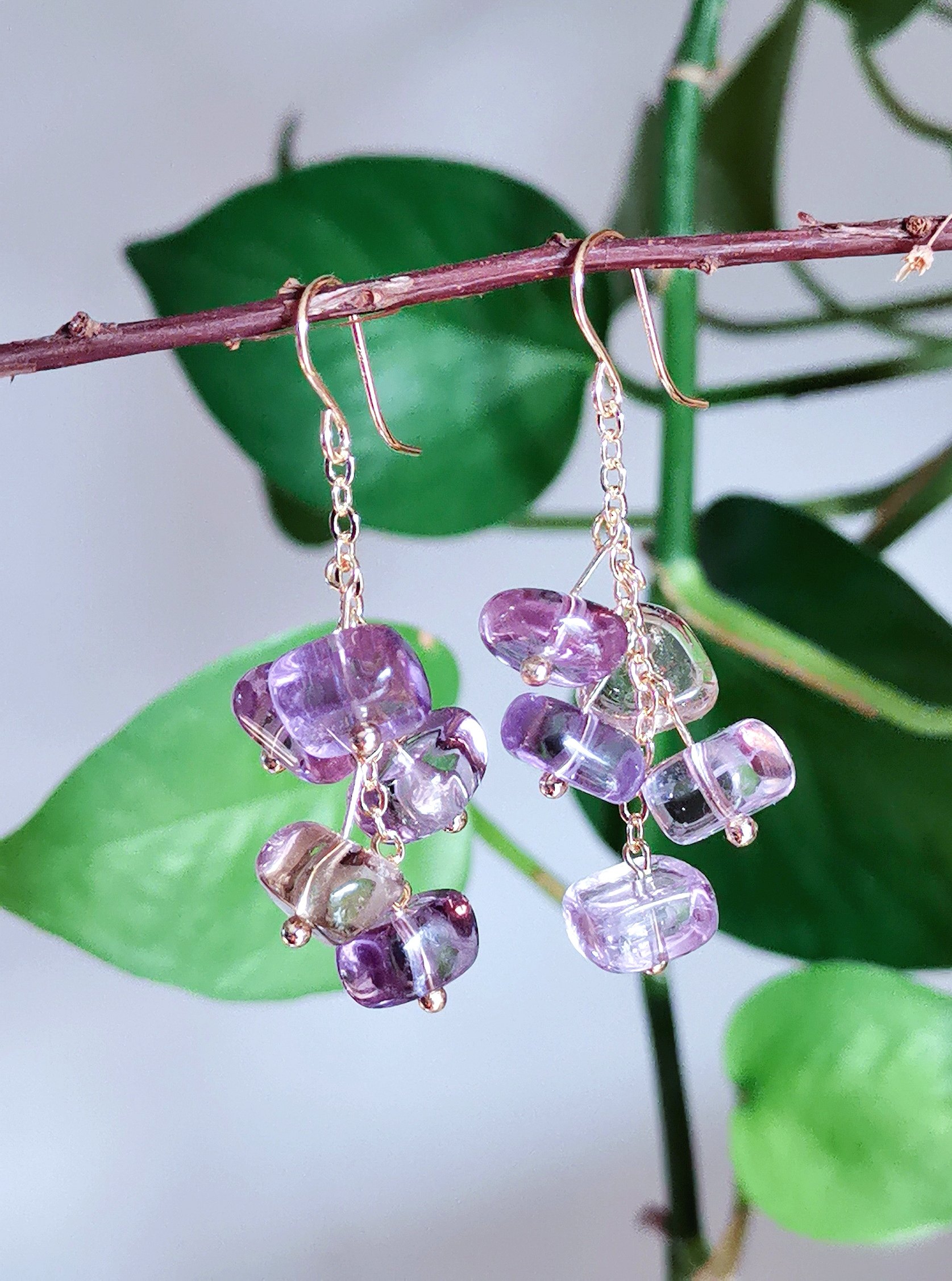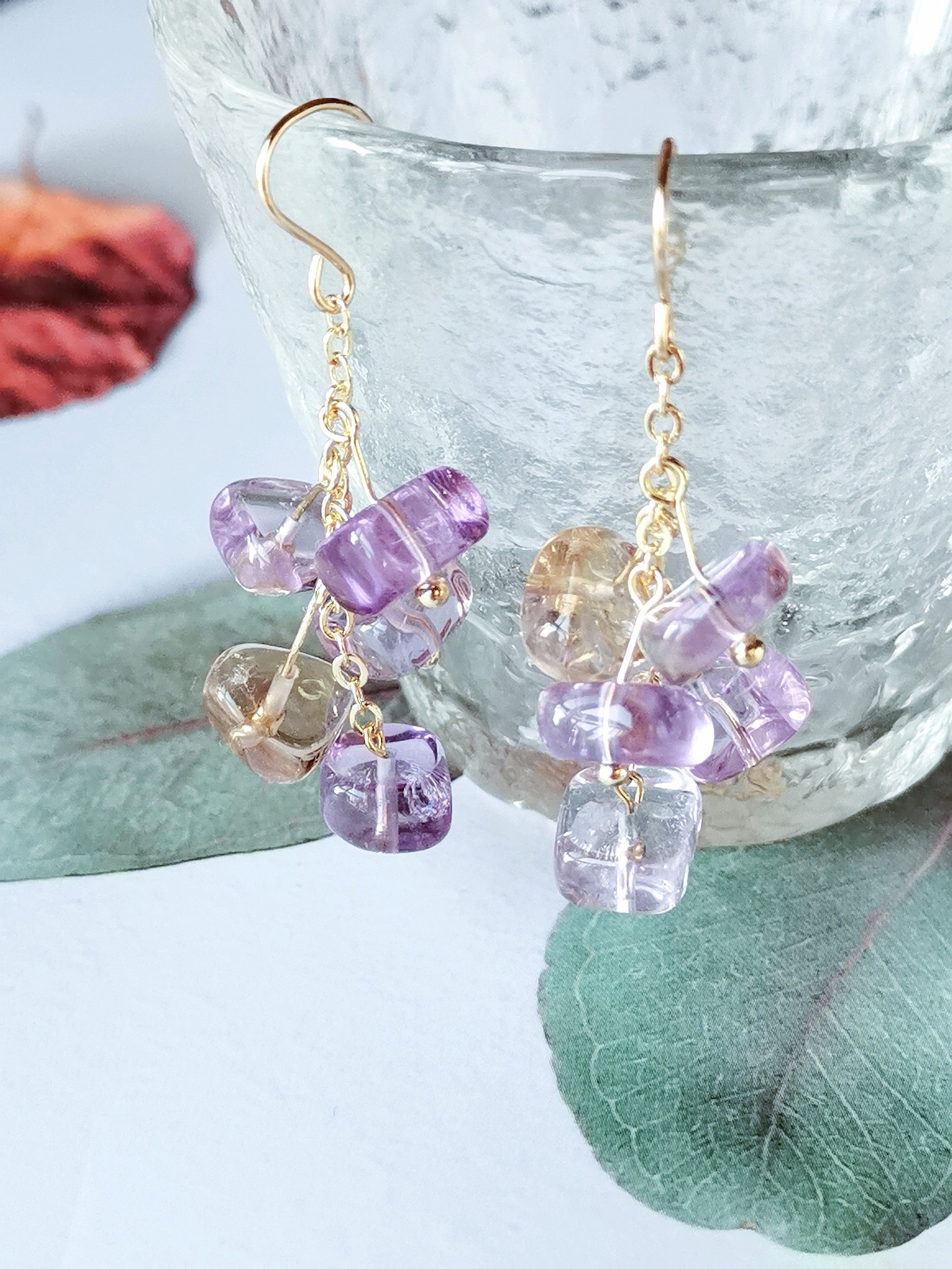 天然紫黄水晶耳坠随型彩色宝石耳环小众设计耳饰美国进口注金耳钩