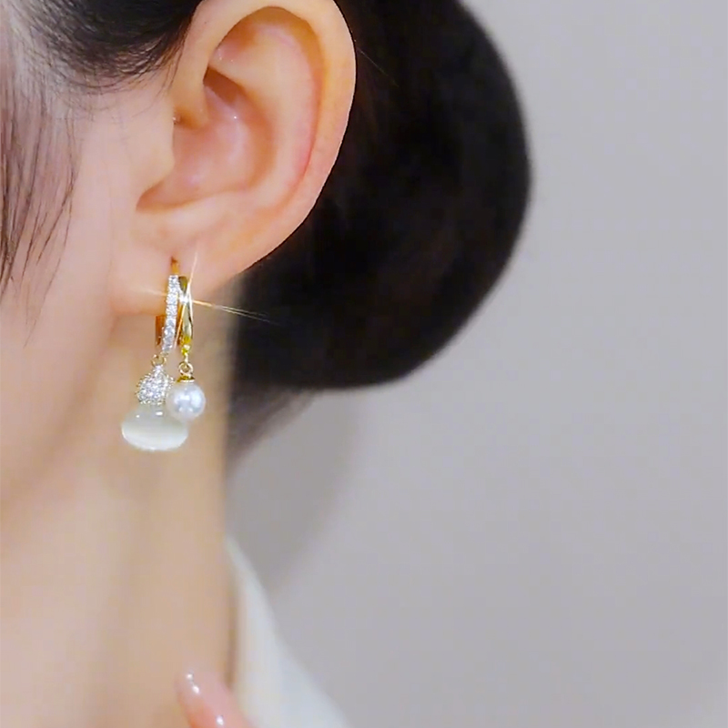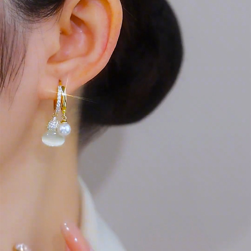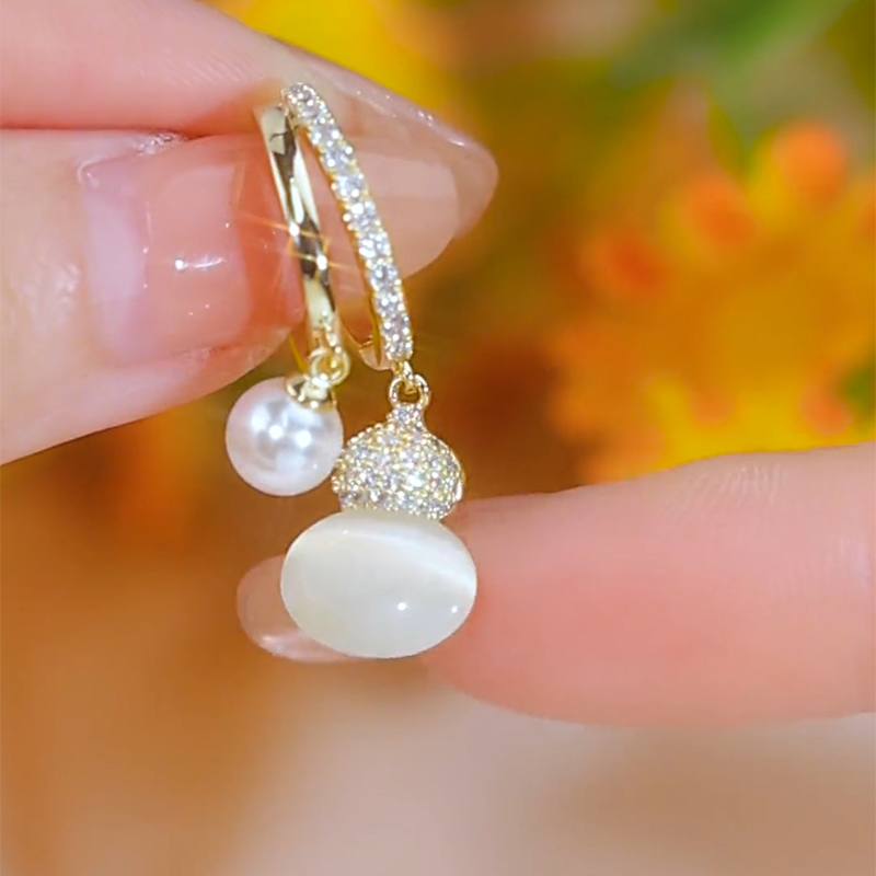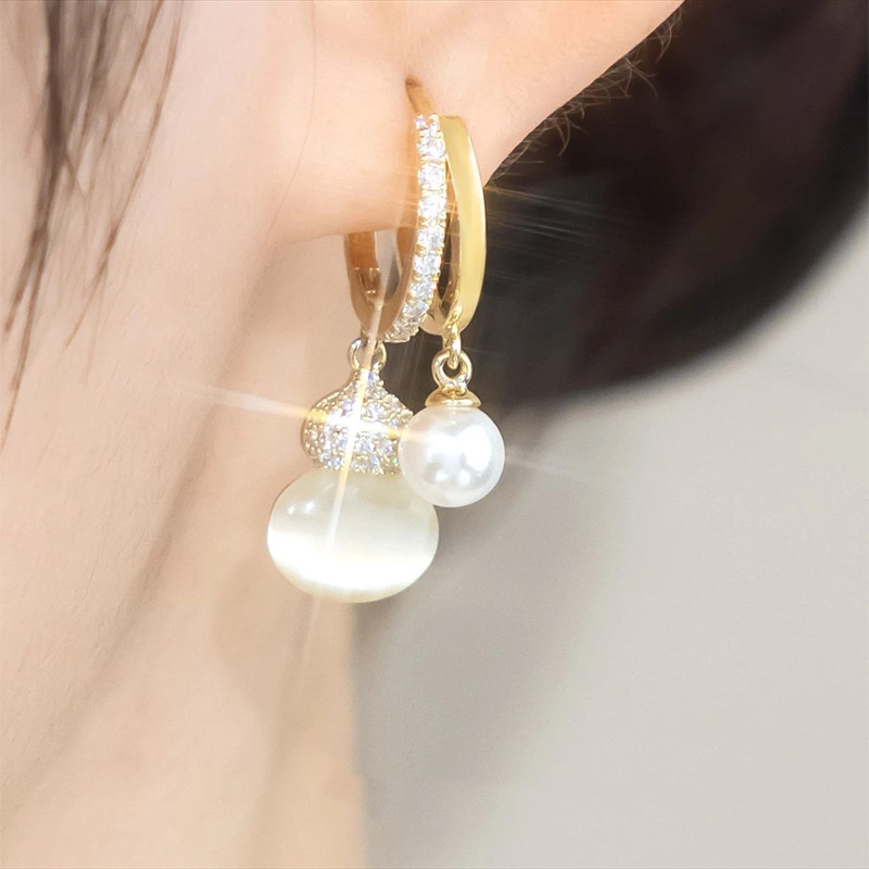 精致猫眼石葫芦耳环高级感时尚微镶气质珍珠耳坠中国风福禄耳饰