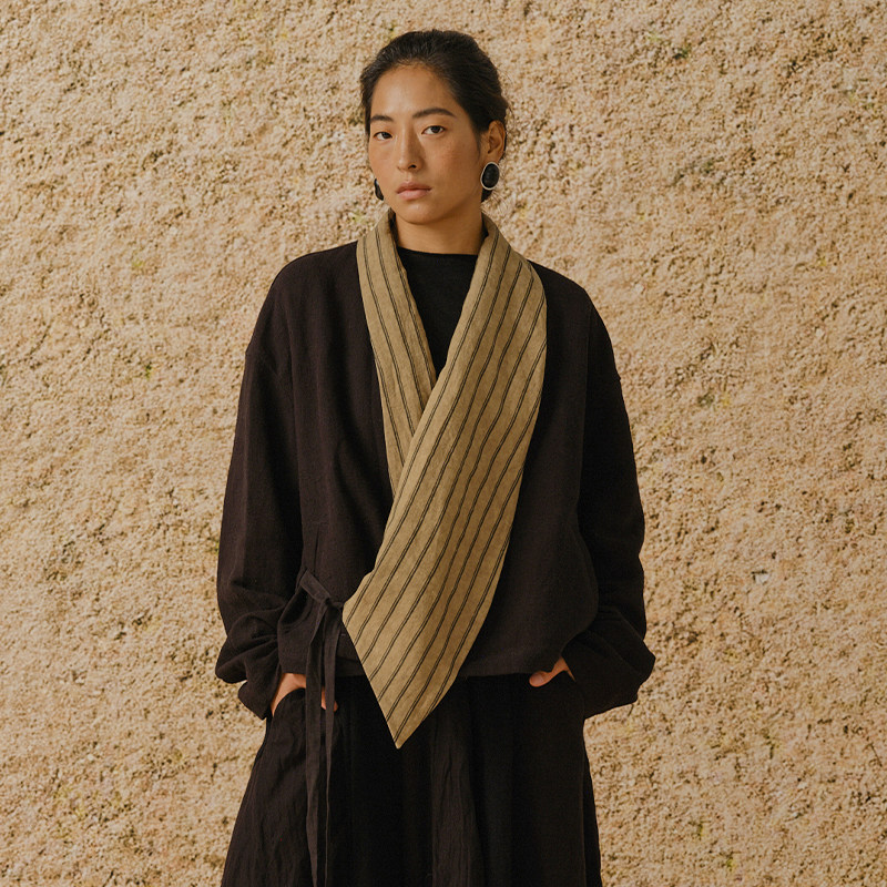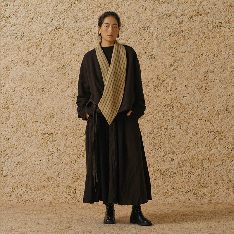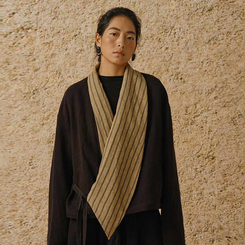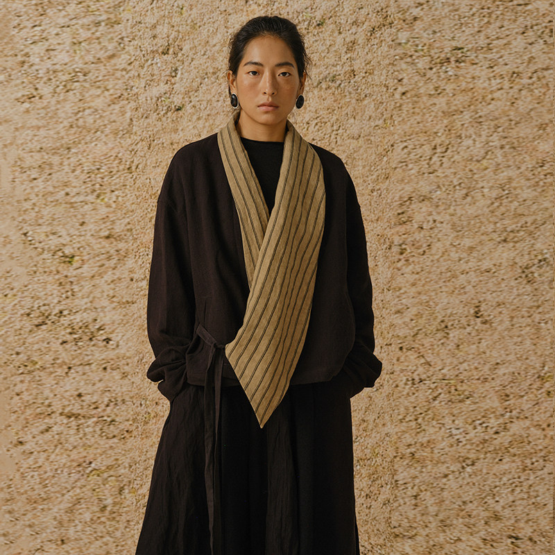 【MORIN KHUUR 牧仁】黑色棉麻翻领系带宽松短衬衫外套