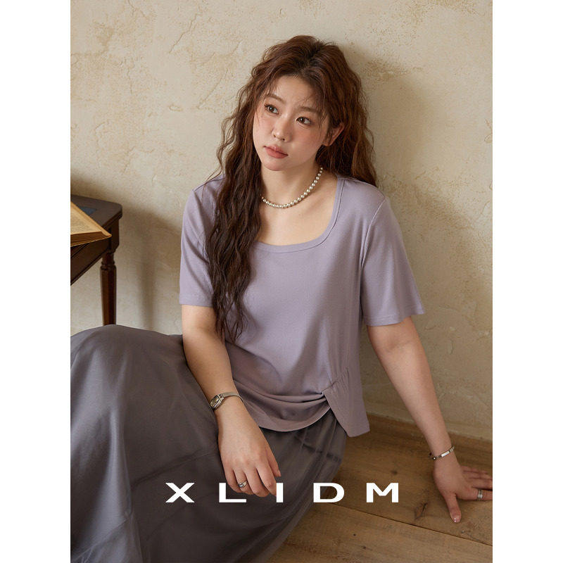 小俪大尺码女装 显瘦十斤!遮肚抽皱不规则开 叉U领正肩短袖T恤女