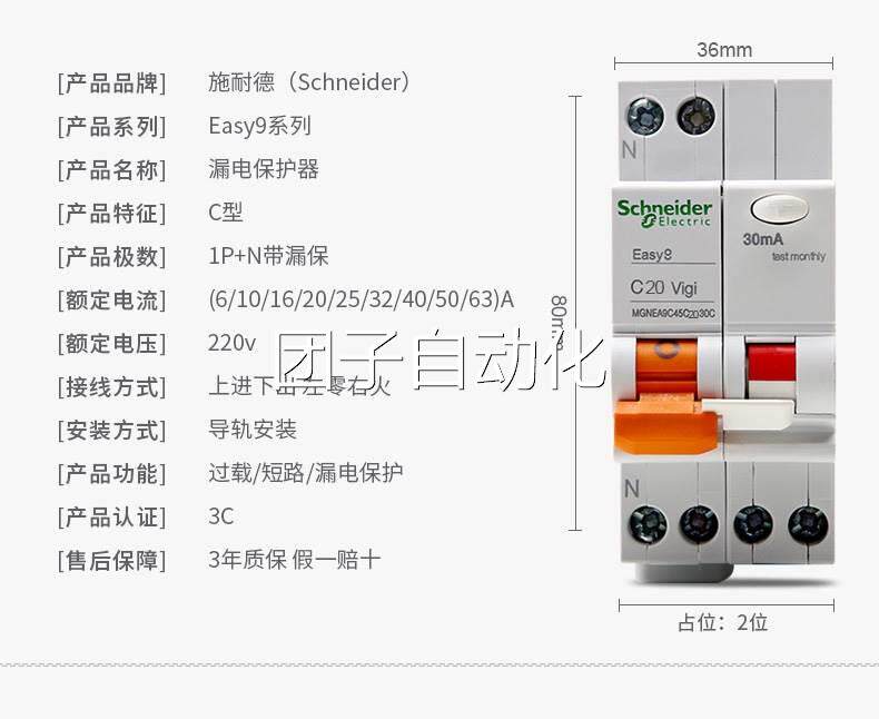 施耐德断路器家用EA9C45漏电保护断路器 1P+N C16A 20A 32A 30MA
