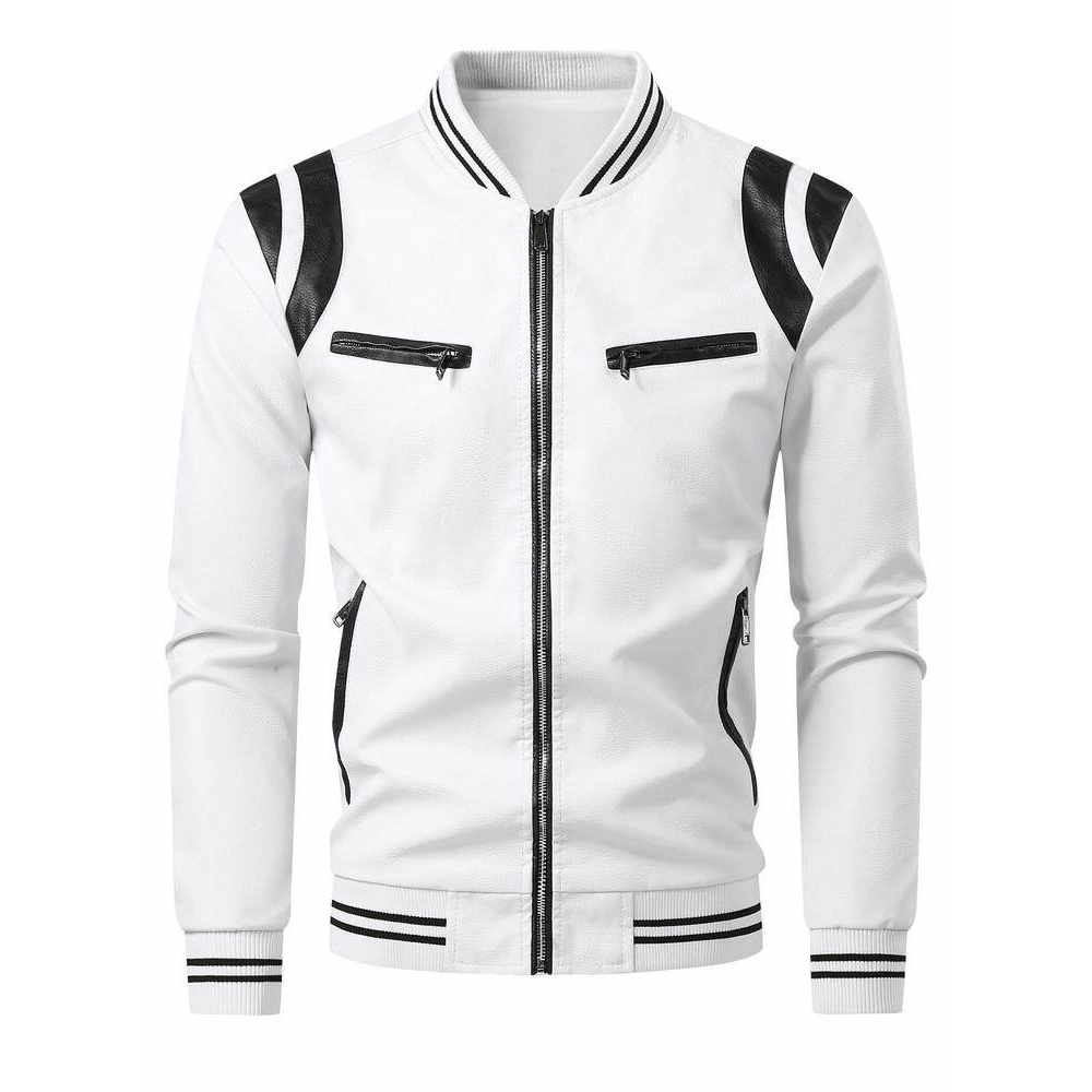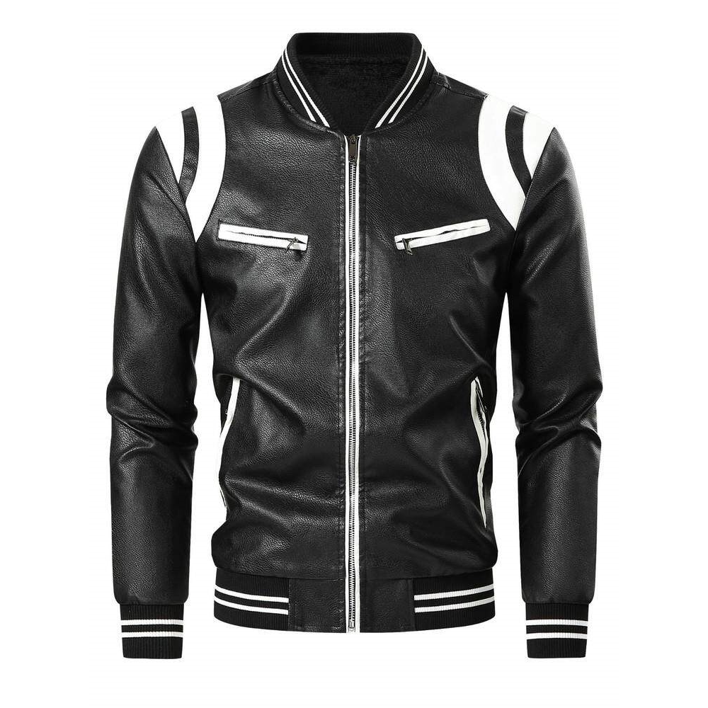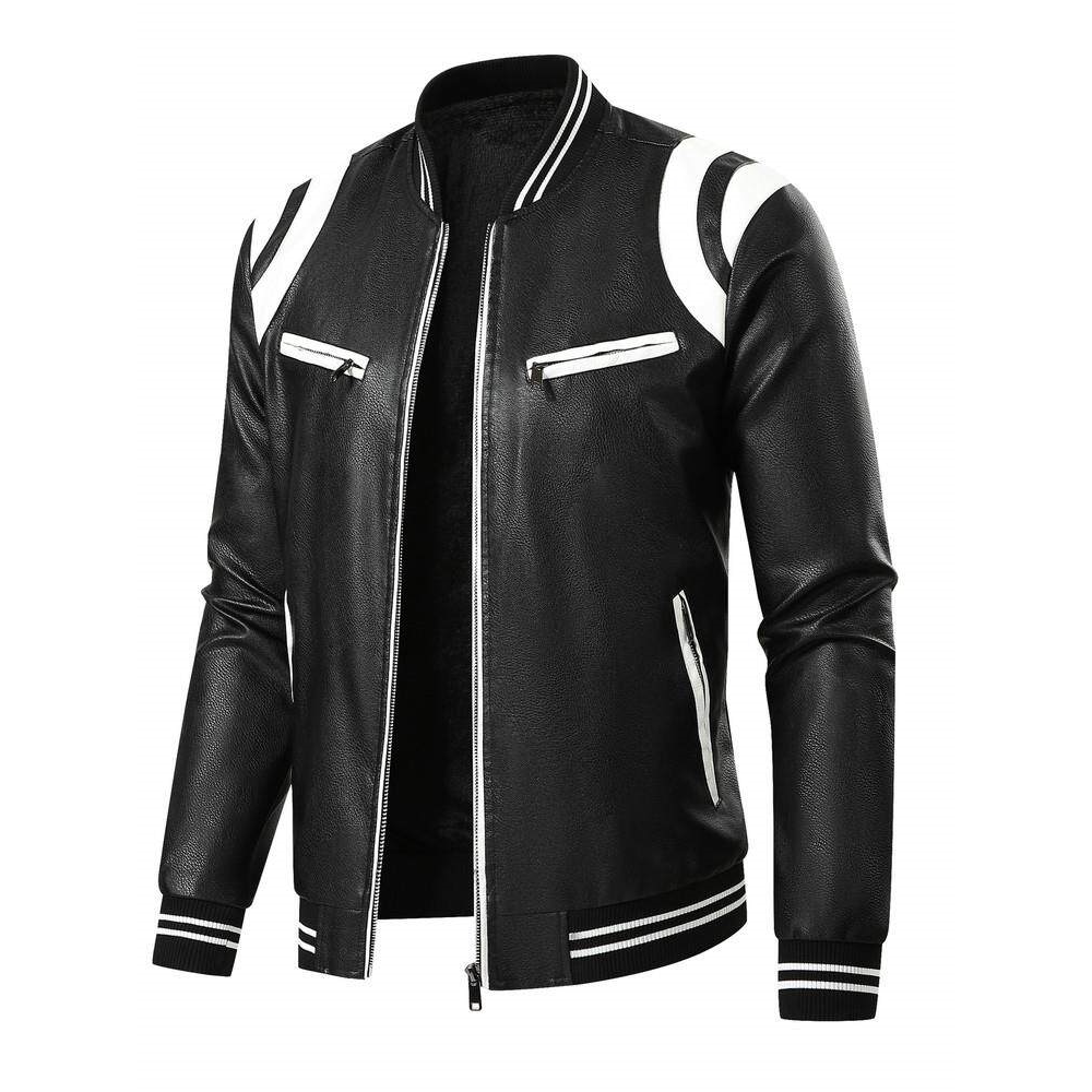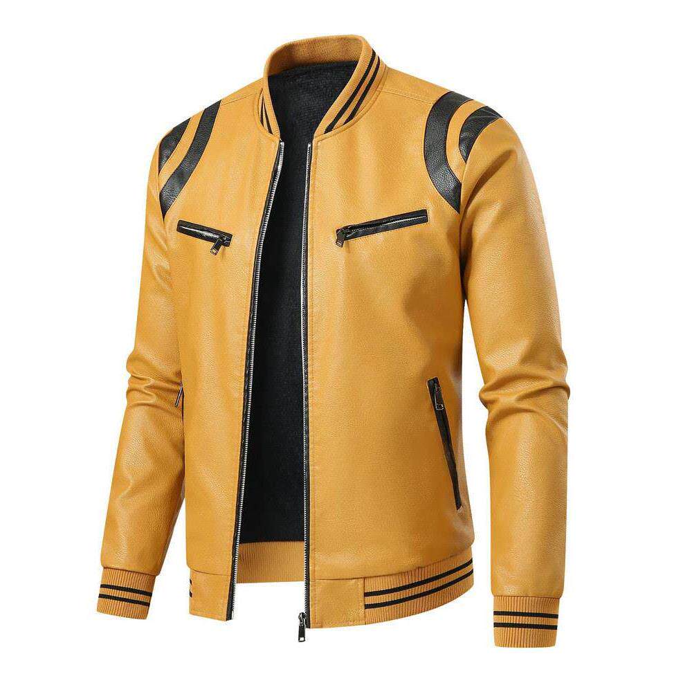 Fleece color-block PU leather jacket春秋季加绒款拼色PU皮夹克