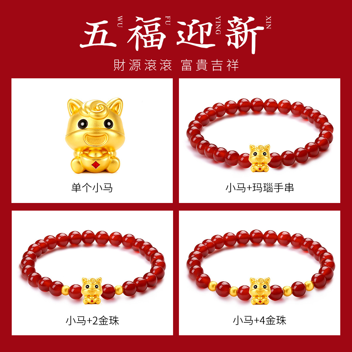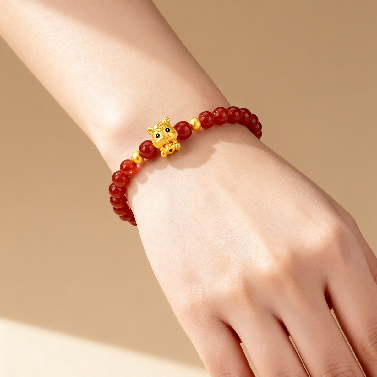 CEMNI/千年珠宝黄金手链生肖马足金999福字马红玛瑙手串十二生肖