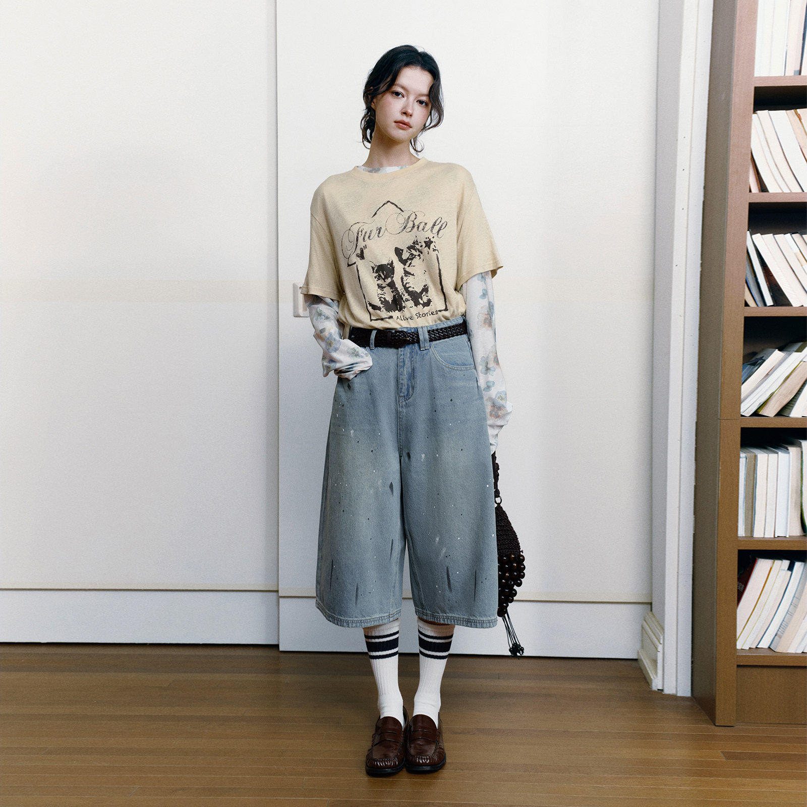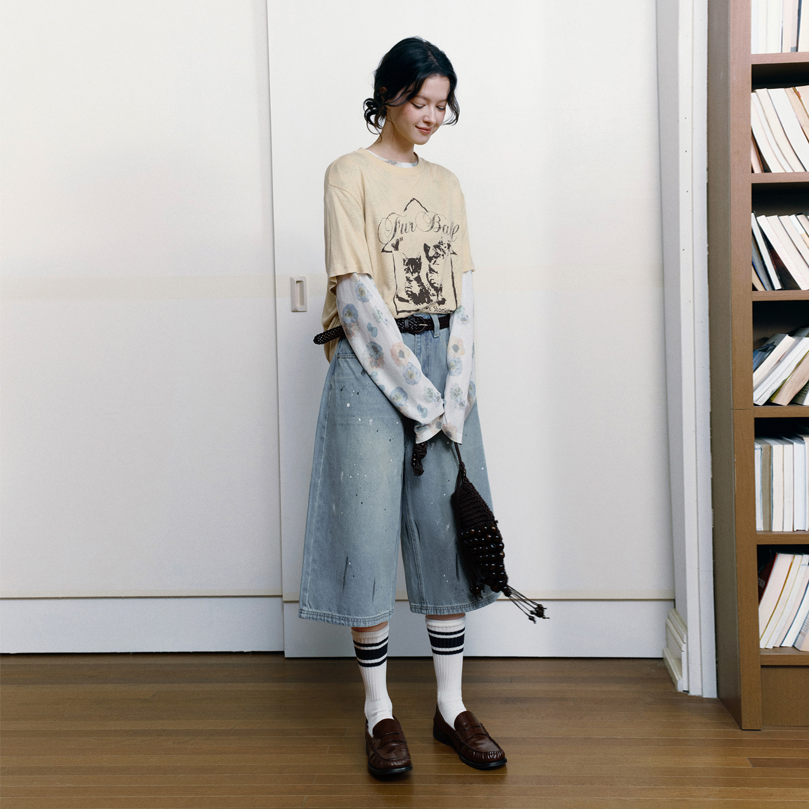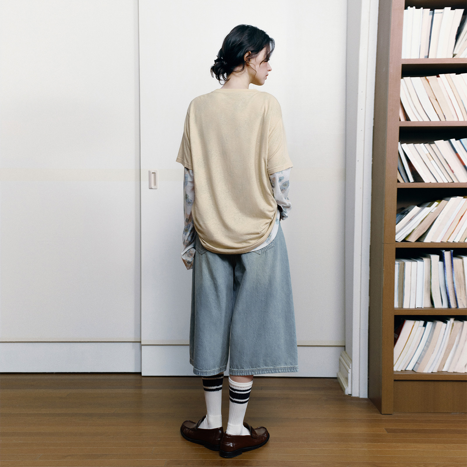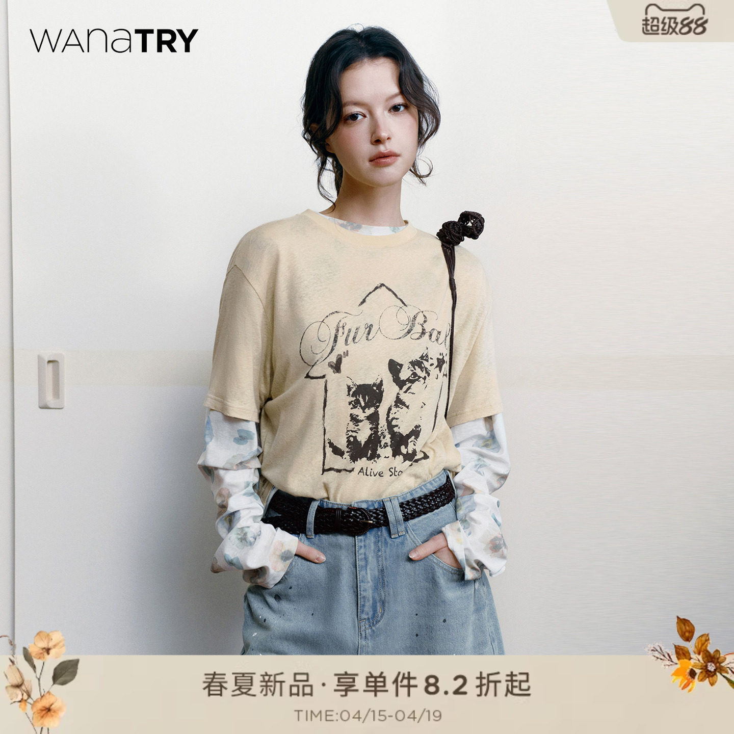 wana try亚麻猫咪印花柔软垂感T恤春季新款宽松随性休闲短袖上衣