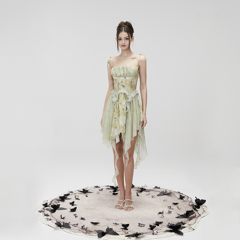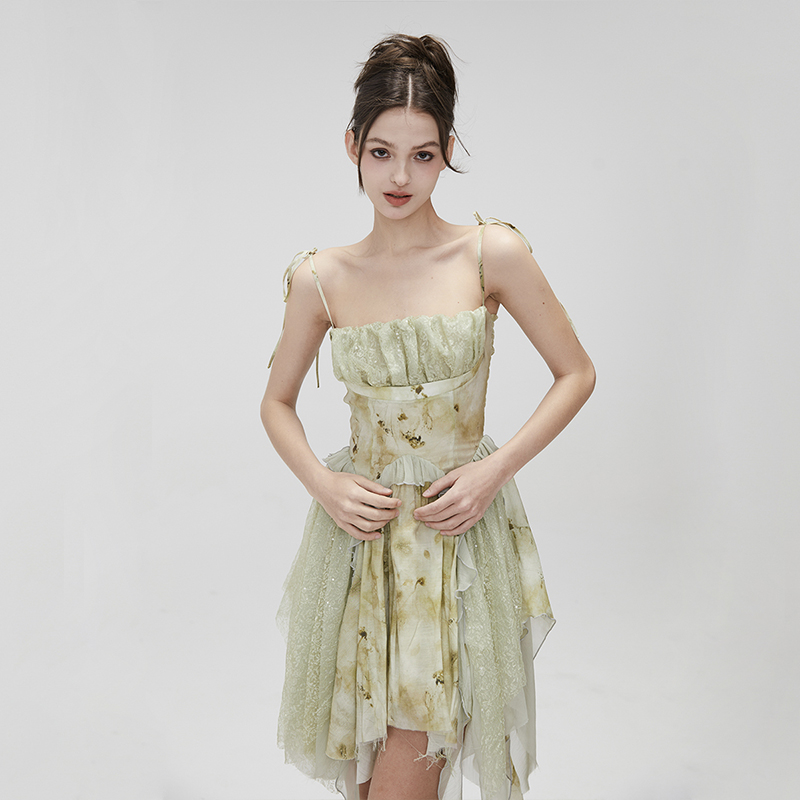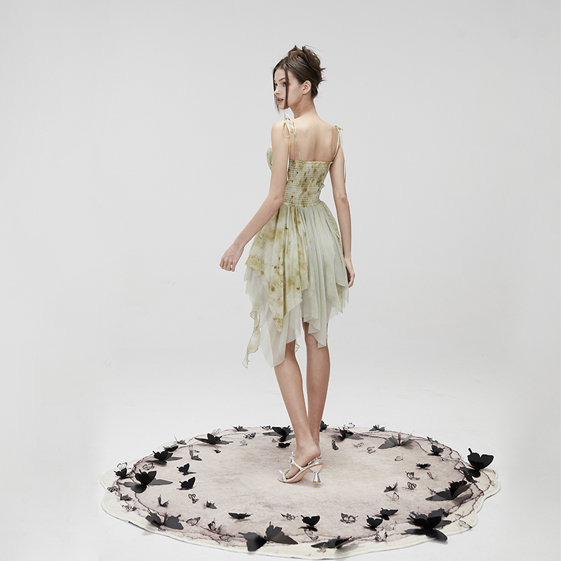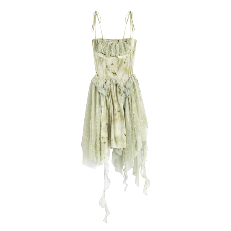 MildRate原创 侘寂风水墨晕染拼接毛边吊带连衣裙新款